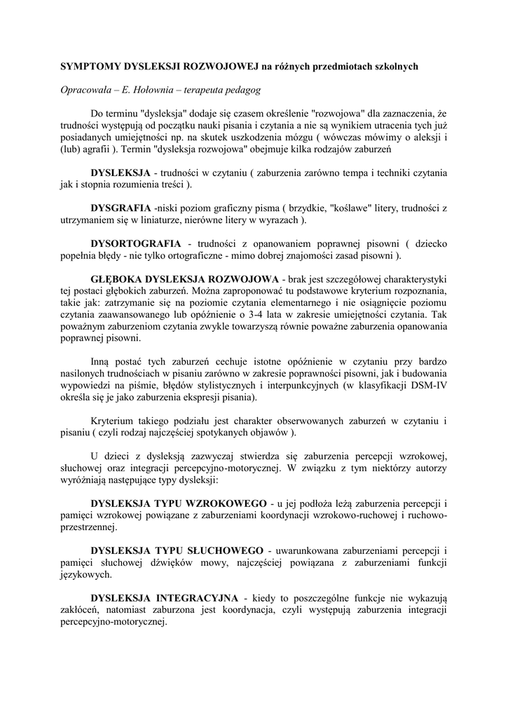 SYMPTOMY DYSLEKSJI ROZWOJOWEJ na różnych przedmiotach szkolnych Opracowała – E. Hołownia – terapeuta pedagog Do terminu "dysleksja" dodaje się czasem określenie "rozwojowa" dla zaznaczenia, że trudności występują od początku nauki pisania i czytania a nie są wynikiem utracenia tych już posiadanych umiejętności np. na skutek uszkodzenia mózgu ( wówczas mówimy o aleksji i (lub) agrafii ). Termin "dysleksja rozwojowa" obejmuje kilka rodzajów zaburzeń DYSLEKSJA - trudności w czytaniu ( zaburzenia zarówno tempa i techniki czytania jak i stopnia rozumienia treści ). DYSGRAFIA -niski poziom graficzny pisma ( brzydkie, "koślawe" litery, trudności z utrzymaniem się w liniaturze, nierówne litery w wyrazach ). DYSORTOGRAFIA - trudności z opanowaniem poprawnej pisowni ( dziecko popełnia błędy - nie tylko ortograficzne - mimo dobrej znajomości zasad pisowni ). GŁĘBOKA DYSLEKSJA ROZWOJOWA - brak jest szczegółowej charakterystyki tej postaci głębokich zaburzeń. Można zaproponować tu podstawowe kryterium rozpoznania, takie jak: zatrzymanie się na poziomie czytania elementarnego i nie osiągnięcie poziomu czytania zaawansowanego lub opóźnienie o 3-4 lata w zakresie umiejętności czytania. Tak poważnym zaburzeniom czytania zwykle towarzyszą równie poważne zaburzenia opanowania poprawnej pisowni. Inną postać tych zaburzeń cechuje istotne opóźnienie w czytaniu przy bardzo nasilonych trudnościach w pisaniu zarówno w zakresie poprawności pisowni, jak i budowania wypowiedzi na piśmie, błędów stylistycznych i interpunkcyjnych (w klasyfikacji DSM-IV określa się je jako zaburzenia ekspresji pisania). Kryterium takiego podziału jest charakter obserwowanych zaburzeń w czytaniu i pisaniu ( czyli rodzaj najczęściej spotykanych objawów ). U dzieci z dysleksją zazwyczaj stwierdza się zaburzenia percepcji wzrokowej, słuchowej oraz integracji percepcyjno-motorycznej. W związku z tym niektórzy autorzy wyróżniają następujące typy dysleksji: DYSLEKSJA TYPU WZROKOWEGO - u jej podłoża leżą zaburzenia percepcji i pamięci wzrokowej powiązane z zaburzeniami koordynacji wzrokowo-ruchowej i ruchowoprzestrzennej. DYSLEKSJA TYPU SŁUCHOWEGO - uwarunkowana zaburzeniami percepcji i pamięci słuchowej dźwięków mowy, najczęściej powiązana z zaburzeniami funkcji językowych. DYSLEKSJA INTEGRACYJNA - kiedy to poszczególne funkcje nie wykazują zakłóceń, natomiast zaburzona jest koordynacja, czyli występują zaburzenia integracji percepcyjno-motorycznej. DYSLEKSJA TYPU MIESZANEGO - gdy występują jednocześnie zaburzenia w percepcji i pamięci słuchowej, pamięci i percepcji wzrokowej, wyobraźni przestrzennej.Trudności w nauce można zaobserwować na różnych przedmiotach szkolnych, zależnie od utrzymujących się dysharmonii rozwojowych. Poniżej przedstawiono bardzo szeroki zakres symptomów trudności w uczeniu się, jednak nie wszystkie one występują jednocześnie. U uczniów z problemami dyslektycznymi trudności wystąpują na wszystkich przedmiotach. Poniżej podaję zestawienie symptomów na poszczególnych przedmiotach. Zakres Język polski Symptomy Czytanie: wolne tempo czytania (czasem jedyne objawy trudności w czytaniu); trudności ze zrozumieniem i zapamiętaniem czytanego tekstu; niechęć do czytania długich tekstów i grubych książek. Pisanie: Języki obce Matematyka nieprawidłowa pisownia – dominują błędy ortograficzne lub tylko błędy ortograficzne pomimo znajomości zasad pisowni (czasem jest to jedyny rodzaj trudności); trudności z organizacją tekstu (pisanie wypracowań); robienie błędów gramatycznych; trudne do odczytania odręczne pismo. trudności z poprawnym pisaniem pomimo dobrych wypowiedzi ustnych; trudności z budowaniem wypowiedzi słownych; trudności z zapamiętywaniem słówek; trudności z odróżnianiem podobnych wyrazów; nieprawidłowa wymowa; trudności z rozumieniem i zapamiętywaniem tekstu mówionego lub nagranego na taśmę; kłopoty z zapisem wyrazów w poprawnej formie gramatycznej. Arytmetyka: błędne zapisywanie i odczytywanie liczb wielocyfrowych (z wieloma zerami lub miejscami po przecinku); przestawianie cyfr (np. 56 – 65); trudności z dodawaniem w pamięci, bez pomocy kartki papieru; nieprawidłowa organizacja przestrzenna zapisu działań matematycznych, przekształcania wzorów; zapisywanie znaków nierówności odwrotnie; nieprawidłowe odczytywanie treści w zadaniach tekstowych; nieprawidłowe wykonywanie wykresów funkcji. Geometria: Biologia trudności z zadaniami angażującymi wyobraźnię przestrzenną; niski poziom graficzny wykresów i rysunków. trudności z opanowaniem terminologii (dłuższe nazwy, nazwy łacińskie); problemy z organizacją przestrzenną schematów i rysunków; trudności z zapisem i zapamiętaniem łańcuchów reakcji biochemicznych; trudności z opanowaniem systematyki (hierarchiczny układ informacji). Chemia nieprawidłowe zapisywanie łańcuchów reakcji chemicznych; problemy z opanowaniem terminologii (nazwy i symbole pierwiastków i związków chemicznych); trudności z zapamiętywaniem danych zorganizowanych przestrzennie (tablica Mendelejewa). trudności z czytaniem i rysowaniem map; trudności z orientacją w czasie i przestrzeni (wskazywanie kierunków na mapie i w przestrzeni; obliczanie stref czasowych, położenia geograficznego, kąta padania słońca itp.); trudności z zapamiętywaniem nazw geograficznych. Historia i wiedza o społeczeństwie trudności z zapamiętywaniem nazw i nazwisk; zła orientacja w czasie (chronologia, daty); trudności z orientacją na mapach historycznych. Kultura fizyczna trudności z opanowaniem układów gimnastycznych (sekwencje ruchowe); trudności w bieganiu, ćwiczeniach równoważnych; trudności w opanowaniu gier wymagających użycia piłki (tenis ziemny i stołowy, siatkówka, koszykówka itp.); niechęć do uprawiania sportów wymagających dobrego poczucia równowagi (deskoro