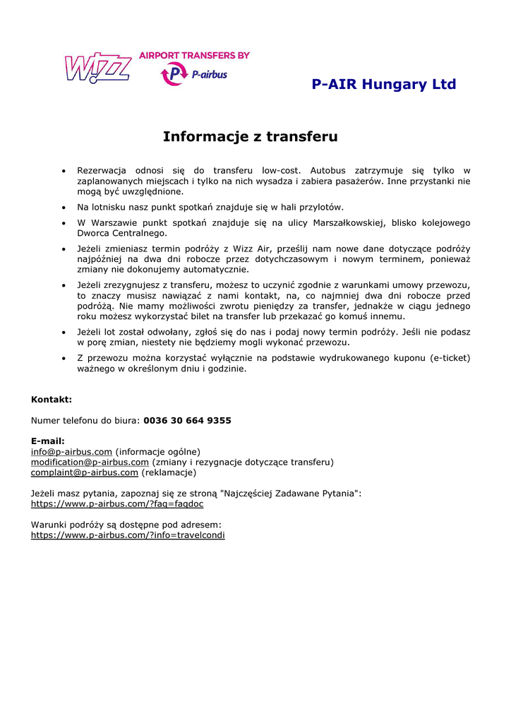 P-AIR Hungary Ltd Informacje z transferu • Rezerwacja odnosi się do transferu low-cost. Autobus zatrzymuje się tylko w zaplanowanych miejscach i tylko na nich wysadza i zabiera pasażerów. Inne przystanki nie mogą być uwzględnione. • Na lotnisku nasz punkt spotkań znajduje się w hali przylotów. • W Warszawie punkt spotkań znajduje się na ulicy Marszałkowskiej, blisko kolejowego Dworca Centralnego. • Jeżeli zmieniasz termin podróży z Wizz Air, prześlij nam nowe dane dotyczące podróży najpóźniej na dwa dni robocze przez dotychczasowym i nowym terminem, ponieważ zmiany nie dokonujemy automatycznie. • Jeżeli zrezygnujesz z transferu, możesz to uczynić zgodnie z warunkami umowy przewozu, to znaczy musisz nawiązać z nami kontakt, na, co najmniej dwa dni robocze przed podróżą. Nie mamy możliwości zwrotu pieniędzy za transfer, jednakże w ciągu jednego roku możesz wykorzystać bilet na transfer lub przekazać go komuś innemu. • Jeżeli lot został odwołany, zgłoś się do nas i podaj nowy termin podróży. Jeśli nie podasz w porę zmian, niestety nie będziemy mogli wykonać przewozu. • Z przewozu można korzystać wyłącznie na podstawie wydrukowanego kuponu (e-ticket) ważnego w określonym dniu i godzinie. Kontakt: Numer telefonu do biura: 0036 30 664 9355 E-mail: [email protected] (informacje ogólne) [email protected] (zmiany i rezygnacje dotyczące transferu) [email protected] (reklamacje) Jeżeli masz pytania, zapoznaj się ze stroną "Najczęściej Zadawane Pytania": https://www.p-airbus.com/?faq=faqdoc Warunki podróży są dostępne pod adresem: https://www.p-airbus.com/?info=travelcondi