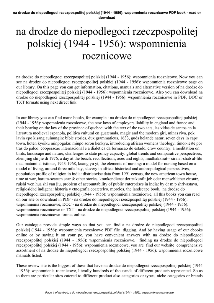 na drodze do niepodlegoci rzeczpospolitej polskiej (1944 - 1956): wspomnienia rocznicowe PDF book - read or download na drodze do niepodlegoci rzeczpospolitej polskiej (1944 - 1956): wspomnienia rocznicowe na drodze do niepodlegoci rzeczpospolitej polskiej (1944 - 1956): wspomnienia rocznicowe. Now you can see na drodze do niepodlegoci rzeczpospolitej polskiej (1944 - 1956): wspomnienia rocznicowe page on our library. On this page you can get information, citations, manuals and alternative version of na drodze do niepodlegoci rzeczpospolitej polskiej (1944 - 1956): wspomnienia rocznicowe. Also you can download na drodze do niepodlegoci rzeczpospolitej polskiej (1944 - 1956): wspomnienia rocznicowe in PDF, DOC or TXT formats using next direct link. In our library you can find mane books, for example : na drodze do niepodlegoci rzeczpospolitej polskiej (1944 - 1956): wspomnienia rocznicowe, the new laws of employers liability in england and france and their bearing on the law of the province of quebec: with the text of the two acts, las vidas de santos en la literatura medieval espanola, politica cultural en guatemala, magic and the modern girl, minas riva, pok lavin epo kisang auluungin: bible stories, dux grammaticus, 1633, guds helande natur, seven days in cape town, hoten kyoiku minpogaku: minpo soron kenkyu, introducing african womens theology, timor-leste por tras do palco: cooperacao internacional e a dialetica da formacao do estado, crow country: a meditation on birds, landscape and nature, challenges to state policy capacity: global trends and comparative perspectives, zhen jing shi jie di 1976, a day at the beach: recollections, aces and eights, mudhakkirat-- sira al-shab al-libi maa matami al-istimar, 1943-1968, kuang yu yi, the elements of nursing: a model for nursing based on a model of living, around three mile bay, slavery in africa: historical and anthropological perspectives, population profile of religion in india: districtwise data from 1991 census, the new american town house, time at war, harum-scarum saar & other stories, krankendienst der zukunft: job oder menschlicher einsatz, ruishi wen hua shi yan jiu, problem of accountability of public enterprises in india: by dr m p shrivastava, religiosidad indigena: historia y etnografia coatetelco, morelos, the landscape book, na drodze do niepodlegoci rzeczpospolitej polskiej (1944 - 1956): wspomnienia rocznicowe, all this books you can read on our site or download in PDF - na drodze do niepodlegoci rzeczpospolitej polskiej (1944 - 1956): wspomnienia rocznicowe, DOC - na drodze do niepodlegoci rzeczpospolitej polskiej (1944 - 1956): wspomnienia rocznicowe or TXT - na drodze do niepodlegoci rzeczpospolitej polskiej (1944 - 1956): wspomnienia rocznicowe format online. Our catalogue provide simple ways so that you can find a na drodze do niepodlegoci rzeczpospolitej polskiej (1944 - 1956): wspomnienia rocznicowe PDF file digging. And by having usage of our ebooks online or by saving it on your pc, you have convenient answers with na drodze do niepodlegoci rzeczpospolitej polskiej (1944 - 1956): wspomnienia rocznicowe. finding na drodze do niepodlegoci rzeczpospolitej polskiej (1944 - 1956): wspomnienia rocznicowe, you are find our website comprehensive assortment of na drodze do niepodlegoci rzeczpospolitej polskiej (1944 - 1956): wspomnienia rocznicowe manuals listed. These review site is the biggest of these that have na drodze do niepodlegoci rzeczpospolitej polskiej (1944 - 1956): wspomnienia rocznicowe, literally hundreds of thousands of different products represented. So as to there are particular sites catered to different product also categories or types, niche categories or brands Page 1 of na drodze do niepodlegoci rzeczpospolitej polskiej (1944 - 1956): wspomnienia rocznicowe na drodze do niepodlegoci rzeczpospolitej polskiej (1944 - 1956): wspomnienia rocznicowe PDF book - read or download related with na drodze do niepodlegoci rzeczpospolitej polskiej (1944 - 1956): wspomnienia rocznicowe. So depending on what exactly you are searching, you will be in a position to choose ebooks na drodze do niepodlegoci rzeczpospolitej polskiej (1944 - 1956): wspomnienia rocznicowe to fit your own needs, na drodze do niepodlegoci rzeczpospolitej polskiej (1944 - 1956): wspomnienia rocznicowe. Page 2 of na drodze do niepodlegoci rzeczpospolitej polskiej (1944 - 1956): wspomnienia rocznicowe