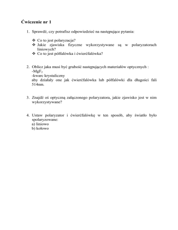 Ćwiczenie nr 1 1. Sprawdź, czy potrafisz odpowiedzieć na następujące pytania: Co to jest polaryzacja? Jakie zjawiska fizyczne wykorzystywane są w polaryzatorach liniowych? Co to jest półfalówka i ćwierćfalówka? 2. Oblicz jaka musi być grubość następujących materiałów optycznych : -MgF2 -kwarc krystaliczny aby działały one jak ćwierćfalówka lub półfalówki dla długości fali 514nm. 3. Znajdź oś optyczną załączonego polaryzatora, jakie zjawisko jest w nim wykorzystywane? 4. Ustaw polaryzator i ćwierćfalówkę w ten sposób, aby światło było spolaryzowane: a) liniowo b) kołowo o-promień zwyczajny e-promień nadzwyczajny z optic axis o incident beam e L Różnica faz E E0 cos(t kx ) gdzie faza wynosi kx dla drogi optycznej l otrzymujemy kx kl 2 l 2 n l c W szczególności dla promienia zwyczajnego otrzymujemy o kx kl a dla promienia nadzwyczajnego e kx kl Różnica faz wynosi więc 2 o 2 e l 2 no l c l 2ne l c 2 (no ne ) o e l c dla ćwierćfalówki różnica faz wynosi , dla półfalówki różnica faz 2 wynosi . Stąd wynika, że grubość ćwierćfalówki ( jest ściśle określona i wynosi: l c 4 (ne no ) dla ćwierćfalówki oraz l c 2 (ne no ) dla półfalówki. ) i półfalówki 2 4