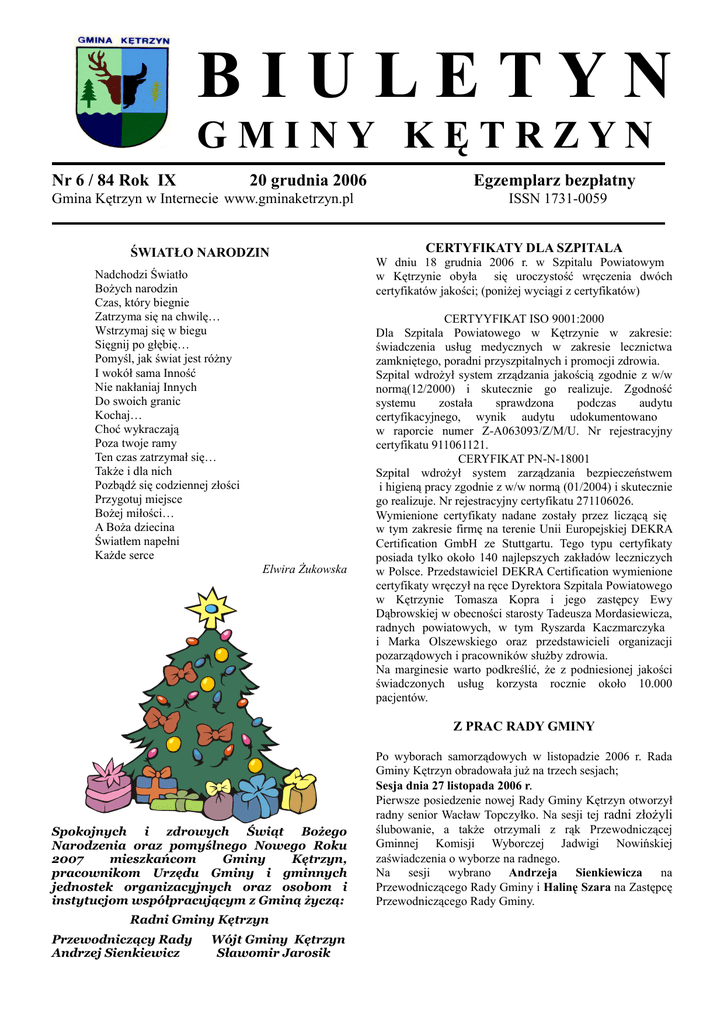 BIULETYN GMINY KĘTRZYN Nr 6 / 84 Rok IX 20 grudnia 2006 Gmina Kętrzyn w Internecie www.gminaketrzyn.pl ŚWIATŁO NARODZIN Nadchodzi Światło Bożych narodzin Czas, który biegnie Zatrzyma się na chwilę… Wstrzymaj się w biegu Sięgnij po głębię… Pomyśl, jak świat jest różny I wokół sama Inność Nie nakłaniaj Innych Do swoich granic Kochaj… Choć wykraczają Poza twoje ramy Ten czas zatrzymał się… Także i dla nich Pozbądź się codziennej złości Przygotuj miejsce Bożej miłości… A Boża dziecina Światłem napełni Każde serce Elwira Żukowska Egzemplarz bezpłatny ISSN 1731-0059 CERTYFIKATY DLA SZPITALA W dniu 18 grudnia 2006 r. w Szpitalu Powiatowym w Kętrzynie obyła się uroczystość wręczenia dwóch certyfikatów jakości; (poniżej wyciągi z certyfikatów) CERTYYFIKAT ISO 9001:2000 Dla Szpitala Powiatowego w Kętrzynie w zakresie: świadczenia usług medycznych w zakresie lecznictwa zamkniętego, poradni przyszpitalnych i promocji zdrowia. Szpital wdrożył system zrządzania jakością zgodnie z w/w normą(12/2000) i skutecznie go realizuje. Zgodność systemu została sprawdzona podczas audytu certyfikacyjnego, wynik audytu udokumentowano w raporcie numer Z-A063093/Z/M/U. Nr rejestracyjny certyfikatu 911061121. CERYFIKAT PN-N-18001 Szpital wdrożył system zarządzania bezpieczeństwem i higieną pracy zgodnie z w/w normą (01/2004) i skutecznie go realizuje. Nr rejestracyjny certyfikatu 271106026. Wymienione certyfikaty nadane zostały przez liczącą się w tym zakresie firmę na terenie Unii Europejskiej DEKRA Certification GmbH ze Stuttgartu. Tego typu certyfikaty posiada tylko około 140 najlepszych zakładów leczniczych w Polsce. Przedstawiciel DEKRA Certification wymienione certyfikaty wręczył na ręce Dyrektora Szpitala Powiatowego w Kętrzynie Tomasza Kopra i jego zastępcy Ewy Dąbrowskiej w obecności starosty Tadeusza Mordasiewicza, radnych powiatowych, w tym Ryszarda Kaczmarczyka i Marka Olszewskiego oraz przedstawicieli organizacji pozarządowych i pracowników służby zdrowia. Na marginesie warto podkreślić, że z podniesionej jakości świadczonych usług korzysta rocznie około 10.000 pacjentów. Z PRAC RADY GMINY Spokojnych i zdrowych Świąt Bożego Narodzenia oraz pomyślnego Nowego Roku 2007 mieszkańcom Gminy Kętrzyn, pracownikom Urzędu Gminy i gminnych jednostek organizacyjnych oraz osobom i instytucjom współpracującym z Gminą życzą: Radni Gminy Kętrzyn Przewodniczący Rady Andrzej Sienkiewicz Wójt Gminy Kętrzyn Sławomir Jarosik Po wyborach samorządowych w listopadzie 2006 r. Rada Gminy Kętrzyn obradowała już na trzech sesjach; Sesja dnia 27 listopada 2006 r. Pierwsze posiedzenie nowej Rady Gminy Kętrzyn otworzył radny senior Wacław Topczyłko. Na sesji tej radni złożyli ślubowanie, a także otrzymali z rąk Przewodniczącej Gminnej Komisji Wyborczej Jadwigi Nowińskiej zaświadczenia o wyborze na radnego. Na sesji wybrano Andrzeja Sienkiewicza na Przewodniczącego Rady Gminy i Halinę Szara na Zastępcę Przewodniczącego Rady Gminy. Komisję Rozwoju Gospodarczego i Ochrony Środowiska w składzie: Ireneusz Domański – przewodniczący oraz członkowie: Tadeusz Deptuła, Mirosława Katiuszyn, Tadeusz Ładosz, Renata Olechnowicz, Anna Tyc i Ireneusz Andrzej Sienkiewicz Halina Szara Sesja dnia 4 grudnia 2006 r. Odbyło się uroczyste ślubowanie Wójta Sławomira Jarosika. Sesja dnia 13 grudnia 2006 r. Na sesji tej podjęto uchwały o powołaniu komisji stałych Rady Gminy Kętrzyn. Procedura wyboru komisji określona jest w Statucie Gminy. Radni wpisują się do odpowiednich komisji stałych i spośród siebie wyłaniają przewodniczących. Powołano następujące komisje ze składami radnych: Komisję Rolnictwa i Usług w składzie: Mirosław Tomasik – przewodniczący oraz członkowie komisji: Tadeusz Deptuła i Wacław Topczyłko. Mirosław Tomasik Tadeusz Deptuła Żukowski. Ireneusz Domański Renata Olechnowicz Ireneusz Żukowski Komisja będzie się zajmowała problematyką: inwestycji gminnych, wykorzystania i zagospodarowania mienia komunalnego, pozyskiwania pozabudżetowych środków pomocowych, ograniczenia bezrobocia, ochroną zieleni i lasów oraz gospodarką odpadami komunalnymi. Komisję Oświaty, Zdrowia Kultury i Turystyki w składzie: Mirosława Katiuszyn – przewodnicząca oraz członkowie: Ireneusz Domański, Renata Olechnowicz, Marek Pepławski, Krzysztof Plewnia i Anna Tyc. Komisja zajmuje się następującą problematyką: rozwojem oświaty i kultury, ochroną zdrowia, przeciwdziałaniem patologiom społecznym, współpracą zespołów młodzieżowych z Radą Gminy, rozwojem sportu i turystyki oraz infrastruktury rekreacyjnej i turystycznej, a także ładem i porządkiem publicznym. Wacław Topczyłko Komisja będzie realizować zadania w zakresie rolnictwa, handlu rzemiosła i usług, komunikacji i dróg oraz ochrony przeciwpożarowej i straży pożarnych. Komisję Budżetu i Uchwał w składzie: Tadeusz Ładosz – przewodniczący oraz członkowie: Teresa Jaworska, Krzysztof Plewnia, Halina Szara, Mirosław Tomasik i Wacław Topczyłko. Do zadań komisji należy: zgłaszania i wprowadzania poprawek do uchwał, opiniowanie projektu budżetu, tworzenia spółek i wnoszenia udziałów oraz nadawania honorowego obywatelstwa. Katiuszyn Mirosław Anna Tyc Komisję Rewizyjną Rady Gminy Kętrzyn w składzie: Zbigniew Czepiel – przewodniczący i członkowie Marek Pepławski i Ireneusz Żukowski. Zasady i tryb działania Komisji Rewizyjnej określa Statut Gminy. Zbigniew Czepiel Tadeusz Ładosz Teresa Jaworska Krzysztof Plewnia a Marek Pepławski Rada Gminy Kętrzyn wybrała też swoich przedstawicieli do Związku Gmin Barcja: wójta Sławomira Jarosika i przewodniczącego Andrzeja Sienkiewicza oraz Tadeusza Deptułę jako reprezentanta Gminy w Mazurskim Związku Międzygminnym Gospodarką Odpadami w Giżycku. 2 SAMORZĄD WOJEWÓDZKI Sejmik Województwa Warmińsko-Mazurski