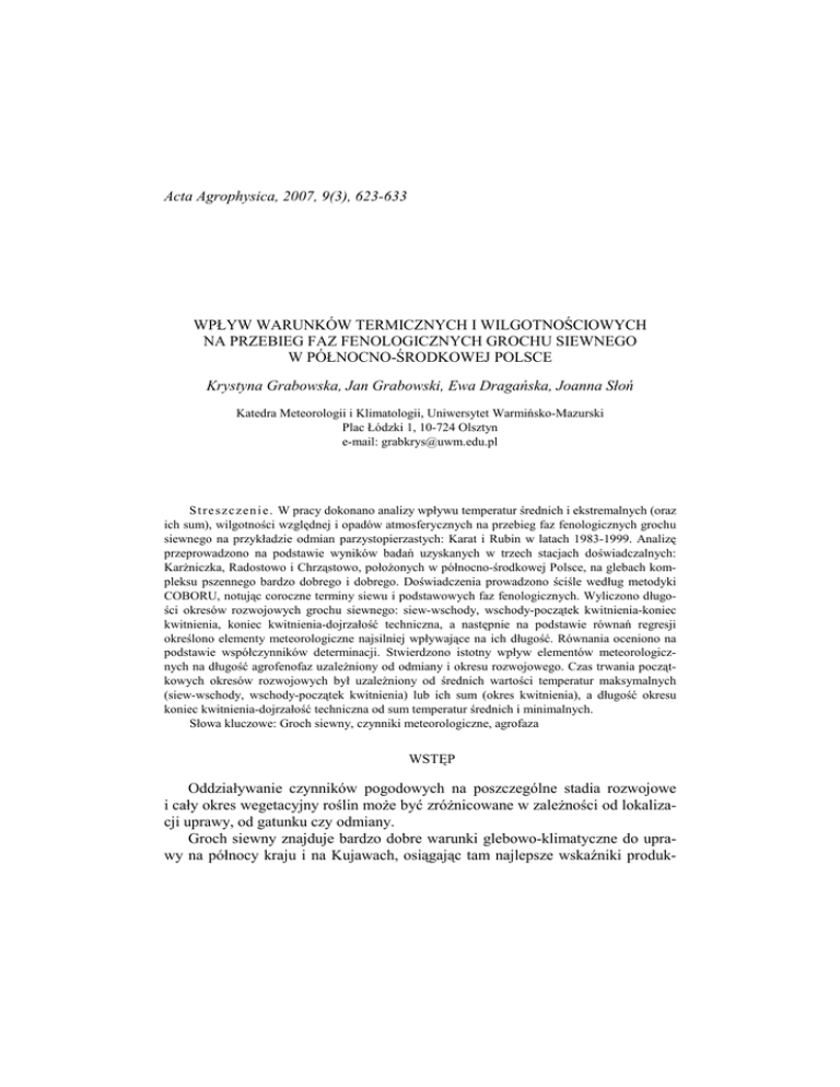Acta Agrophysica, 2007, 9(3), 623-633 WPŁYW WARUNKÓW TERMICZNYCH I WILGOTNOŚCIOWYCH NA PRZEBIEG FAZ FENOLOGICZNYCH GROCHU SIEWNEGO W PÓŁNOCNO-ŚRODKOWEJ POLSCE Krystyna Grabowska, Jan Grabowski, Ewa Dragańska, Joanna Słoń Katedra Meteorologii i Klimatologii, Uniwersytet Warmińsko-Mazurski Plac Łódzki 1, 10-724 Olsztyn e-mail: [email protected] S t r e s z c z e n i e . W pracy dokonano analizy wpływu temperatur średnich i ekstremalnych (oraz ich sum), wilgotności względnej i opadów atmosferycznych na przebieg faz fenologicznych grochu siewnego na przykładzie odmian parzystopierzastych: Karat i Rubin w latach 1983-1999. Analizę przeprowadzono na podstawie wyników badań uzyskanych w trzech stacjach doświadczalnych: KarŜniczka, Radostowo i Chrząstowo, połoŜonych w północno-środkowej Polsce, na glebach kompleksu pszennego bardzo dobrego i dobrego. Doświadczenia prowadzono ściśle według metodyki COBORU, notując coroczne terminy siewu i podstawowych faz fenologicznych. Wyliczono długości okresów rozwojowych grochu siewnego: siew-wschody, wschody-początek kwitnienia-koniec kwitnienia, koniec kwitnienia-dojrzałość techniczna, a następnie na podstawie równań regresji określono elementy meteorologiczne najsilniej wpływające na ich długość. Równania oceniono na podstawie współczynników determinacji. Stwierdzono istotny wpływ elementów meteorologicznych na długość agrofenofaz uzaleŜniony od odmiany i okresu rozwojowego. Czas trwania początkowych okresów rozwojowych był uzaleŜniony od średnich wartości temperatur maksymalnych (siew-wschody, wschody-początek kwitnienia) lub ich sum (okres kwitnienia), a długość okresu koniec kwitnienia-dojrzałość techniczna od sum temperatur średnich i minimalnych. Słowa kluczowe: Groch siewny, czynniki meteorologiczne, agrofaza WSTĘP Oddziaływanie czynników pogodowych na poszczególne stadia rozwojowe i cały okres wegetacyjny roślin moŜe być zróŜnicowane w zaleŜności od lokalizacji uprawy, od gatunku czy odmiany. Groch siewny znajduje bardzo dobre warunki glebowo-klimatyczne do uprawy na północy kraju i na Kujawach, osiągając tam najlepsze wskaźniki produk- 624 K. GRABOWSKA i in. cyjne (Krzymuski 1977). Dlatego wpływ elementów meteorologicznych na przebieg jego okresów rozwojowych przedstawiono na podstawie wyników badań odmianowych z tego obszaru. Wśród odmian grochu siewnego rozróŜnia się formy parzystopierzaste i wąsolistne. Reakcję odmian wąsolistnych (Agra i Piast) przedstawiono we wcześniejszym opracowaniu Grabowskiej i in. (2007), natomiast w niniejszej pracy podjęto próbę ilościowego określenia tych zaleŜności dla odmian parzystopierzastych Karat i Rubin. MATERIAŁ I METODY Materiały wykorzystane w pracy obejmowały dane o warunkach uprawy oraz wzrostu i rozwoju grochu siewnego uzyskane w ścisłych doświadczeniach odmianowych prowadzonych w stacjach doświadczalnych połoŜonych w północnośrodkowej Polsce (tab. 1). Udostępnione przez COBORU (Instrukcja… 1983) informacje dotyczyły kompleksu przydatności rolniczej gleb pod doświadczeniem (pszenny dobry – w KarŜniczce i Chrząstowie oraz pszenny bardzo dobry w Radostowie), poziomu stosowanej agrotechniki oraz terminów siewu i wystąpienia podstawowych faz fenologicznych w latach 1983-1999. Tabela 1. Stacje doświadczalne/meteorologiczne oraz lata doświadczeń Table 1. Experimental/meteorological stations and the years of conducted experiments Stacja – Station Odmiany – Variety / Lata – Years Karat Rubin KarŜniczka (ф 54˚ 29′, λ 17˚ 14′) 1987-1997 1987-1999 Radostowo (ф 53˚ 59′, λ 18˚ 45′) 1983-1997 1987-1998 Chrząstowo (ф 53˚ 11′, λ 17˚ 35′) 1986-1997 1987-1999 Dane o warunkach meteorologicznych (temperaturach średnich i ekstremalnych oraz ich sumach, wilgotności względnej i opadach atmosferycznych) charakteryzujących miejsca doświadczeń pozyskano z IMGW. W obliczeniach posłuŜono się metodą regresji wielokrotnej z uŜyciem funkcji liniowej z krokowym wyborem zmiennych. Dopasowanie modeli oceniono za pomocą współczynników determinacji. Równania regresji utworzono dla poszczególnych okresów rozwojowych wyróŜnionych w wegetacji rośliny (siewwschody, wschody-początek kwitnienia, początek kwitnienia-koniec kwitnienia, koniec kwitnienia-dojrzałość techniczna). WPŁYW WARUNKÓW TERMICZNYCH I WILGOTNOŚCIOWYCH 625 WYNIKI I DYSKUSJA W badanych latach średni termin siewu grochu badanych odmian Karat i Rubin przypadał na 9 kwietnia w KarŜniczce i w Chrząstowie lub 11 kwietnia w Radostowie. Najwcześniej groch wysiewano 22 marca w Radostowie, dzień później w Chrząstowie, a 26 marca w KarŜniczce. Najpóźniejszy termin siewu we wszystkich miejscowościach przypadł na 24 kwietnia (tab. 2). Średnio po ok. 3 tygodniach od siewu (tj. pod koniec kwietnia) obserwowano wschody (tab. 3). Najwcześniej zanotowano je w Radostowie, w zaleŜności od odmiany odpowiednio 13 lub 14 kwietnia, następnie w Chrząstowie (17, 18 kwietnia), a w KarŜniczce dopiero 20, 21 kwietnia; najpóźniej wzeszły – 9, 11 maja – takŜe w Radostowie. Początek kwitnienia zwykle mieścił się w czasie od 10 (Chrząstowo) do 17 czerwca w KarŜniczce, stacji połoŜonej najdalej na północy kraju. Najwcześniej (29, 30.V) rozpoczynało się ono w Radostowie i Chrząstowie, a dopiero 8 czerwca w KarŜniczce. Okres wschody-początek kwitnienia trwał przeciętnie od 42 do 49 dni (tab. 2). Skrajnie długi (64 dni) był w KarŜniczce, przy czym dłuŜszy średnio o 3-5 dni dotyczył odmiany Rubin. Najkrótszą długością (33 dni) tego okresu charakteryzowały się uprawy na stacjach w Chrząstowie (odm. Rubin) i Radostowie (odm. Karat). Koniec kwitnienia obserwowano średnio 26 czerwca w Chrząstowie, 2-4 lipca w Radostowie, a 8, 9 lipca w KarŜniczce. Kwitnienie trwało przeciętnie od 16 dni w Chrząstowie do ok. 3 tygodni w Radostowie i KarŜniczce. Dojrzało