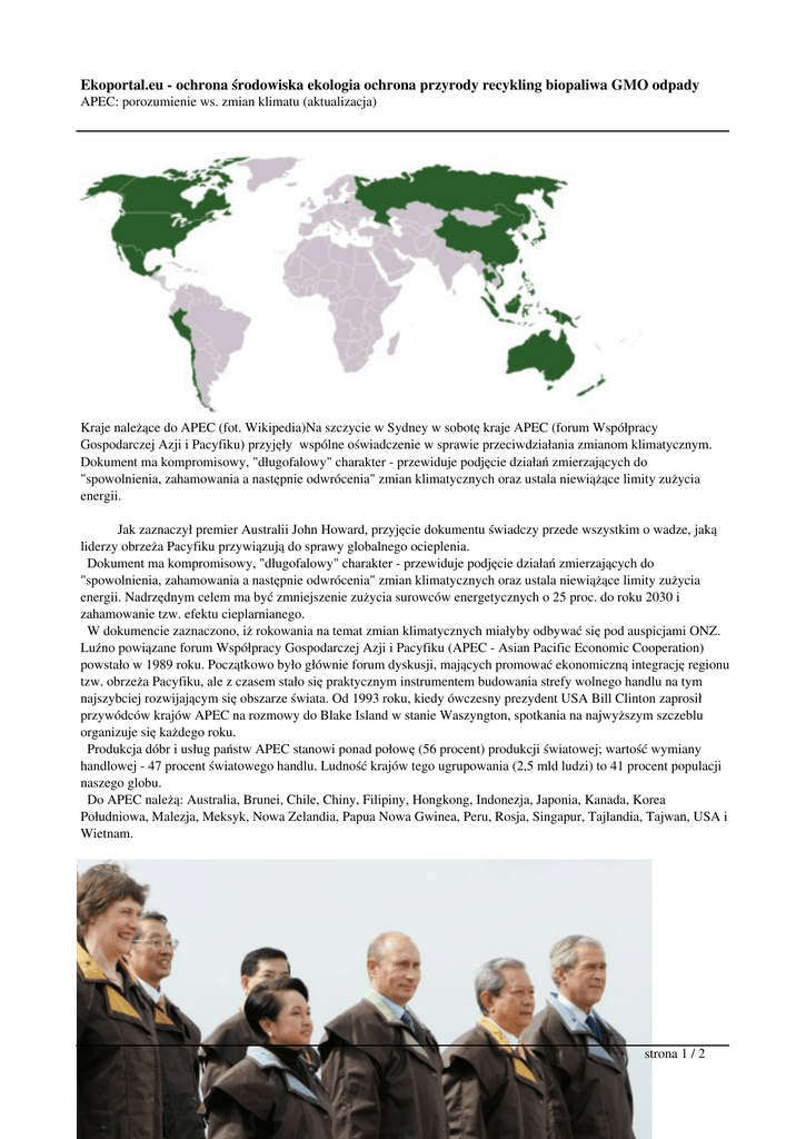 Ekoportal.eu - ochrona środowiska ekologia ochrona przyrody recykling biopaliwa GMO odpady APEC: porozumienie ws. zmian klimatu (aktualizacja) Kraje należące do APEC (fot. Wikipedia)Na szczycie w Sydney w sobotę kraje APEC (forum Współpracy Gospodarczej Azji i Pacyfiku) przyjęły wspólne oświadczenie w sprawie przeciwdziałania zmianom klimatycznym. Dokument ma kompromisowy, "długofalowy" charakter - przewiduje podjęcie działań zmierzających do "spowolnienia, zahamowania a następnie odwrócenia" zmian klimatycznych oraz ustala niewiążące limity zużycia energii. Jak zaznaczył premier Australii John Howard, przyjęcie dokumentu świadczy przede wszystkim o wadze, jaką liderzy obrzeża Pacyfiku przywiązują do sprawy globalnego ocieplenia. Dokument ma kompromisowy, "długofalowy" charakter - przewiduje podjęcie działań zmierzających do "spowolnienia, zahamowania a następnie odwrócenia" zmian klimatycznych oraz ustala niewiążące limity zużycia energii. Nadrzędnym celem ma być zmniejszenie zużycia surowców energetycznych o 25 proc. do roku 2030 i zahamowanie tzw. efektu cieplarnianego. W dokumencie zaznaczono, iż rokowania na temat zmian klimatycznych miałyby odbywać się pod auspicjami ONZ. Luźno powiązane forum Współpracy Gospodarczej Azji i Pacyfiku (APEC - Asian Pacific Economic Cooperation) powstało w 1989 roku. Początkowo było głównie forum dyskusji, mających promować ekonomiczną integrację regionu tzw. obrzeża Pacyfiku, ale z czasem stało się praktycznym instrumentem budowania strefy wolnego handlu na tym najszybciej rozwijającym się obszarze świata. Od 1993 roku, kiedy ówczesny prezydent USA Bill Clinton zaprosił przywódców krajów APEC na rozmowy do Blake Island w stanie Waszyngton, spotkania na najwyższym szczeblu organizuje się każdego roku. Produkcja dóbr i usług państw APEC stanowi ponad połowę (56 procent) produkcji światowej; wartość wymiany handlowej - 47 procent światowego handlu. Ludność krajów tego ugrupowania (2,5 mld ludzi) to 41 procent populacji naszego globu. Do APEC należą: Australia, Brunei, Chile, Chiny, Filipiny, Hongkong, Indonezja, Japonia, Kanada, Korea Południowa, Malezja, Meksyk, Nowa Zelandia, Papua Nowa Gwinea, Peru, Rosja, Singapur, Tajlandia, Tajwan, USA i Wietnam. strona 1 / 2 Ekoportal.eu - ochrona środowiska ekologia ochrona przyrody recykling biopaliwa GMO odpady APEC: porozumienie ws. zmian klimatu (aktualizacja) Na szczycie APEC w Sydney zjawili się przedstwiciele najważniejszych i najbogatszych krajów świata (fot. APEC) Źródło: PAP strona 2 / 2