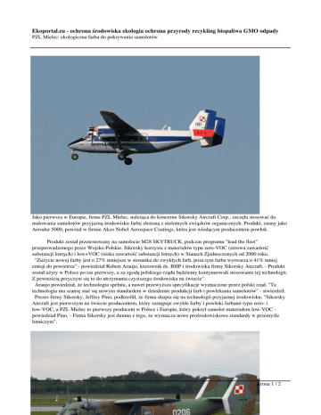Ekoportal.eu - ochrona środowiska ekologia ochrona przyrody recykling biopaliwa GMO odpady PZL Mielec: ekologiczna farba do pokrywania samolotów Jako pierwsza w Europie, firma PZL Mielec, należąca do koncernu Sikorsky Aircraft Corp., zaczęła stosować do malowania samolotów przyjazną środowisku farbę złożoną z nielotnych związków organicznych. Produkt, znany jako Aerodur 5000, powstał w firmie Akzo Nobel Aerospace Coatings, która jest wiodącym producentem powłok. Produkt został przetestowany na samolocie M28 SKYTRUCK, podczas programu "lead the fleet" przeprowadzonego przez Wojsko Polskie. Sikorsky korzysta z materiałów typu zero-VOC (zerowa zawartość substancji lotnych) i low+VOC (niska zawartość substancji lotnych) w Stanach Zjednoczonych od 2000 roku. "Zużycie nowej farby jest o 27% mniejsze w stosunku do zwykłych farb, poza tym farba wytwarza o 41% mniej emisji do powietrza" - powiedział Robert Araujo, kierownik ds. BHP i środowiska firmy Sikorsky Aircraft. - Produkt został użyty w Polsce po raz pierwszy, a za zgodą polskiego rządu będziemy kontynuowali stosowanie tej technologii. Z pewnością przyczyni się to do utrzymania czystszego środowiska na świecie". Araujo powiedział, że technologia spełnia, a nawet przewyższa specyfikacje wyznaczone przez polski rząd. "Ta technologia ma szansę stać się nowym standardem w dziedzinie produkcji farb i powlekania samolotów" - stwierdził. Prezes firmy Sikorsky, Jeffrey Pino, podkreślił, że firma skupia się na technologii przyjaznej środowisku. "Sikorsky Aircraft jest pierwszym na świecie producentem, który zastępuje zwykłe farby i powłoki farbami typu zero- i low-VOC, a PZL Mielec to pierwszy producent w Polsce i Europie, który pokrył samolot materiałem low-VOC powiedział Pino. - Firma Sikorsky jest dumna z tego, że wyznacza nowe prośrodowiskowe standardy w przemyśle lotniczym". strona 1 / 2 Ekoportal.eu - ochrona środowiska ekologia ochrona przyrody recykling biopaliwa GMO odpady PZL Mielec: ekologiczna farba do pokrywania samolotów M28 Skytruck produkowany w zakładach w Mielcu Źródło: własne strona 2 / 2