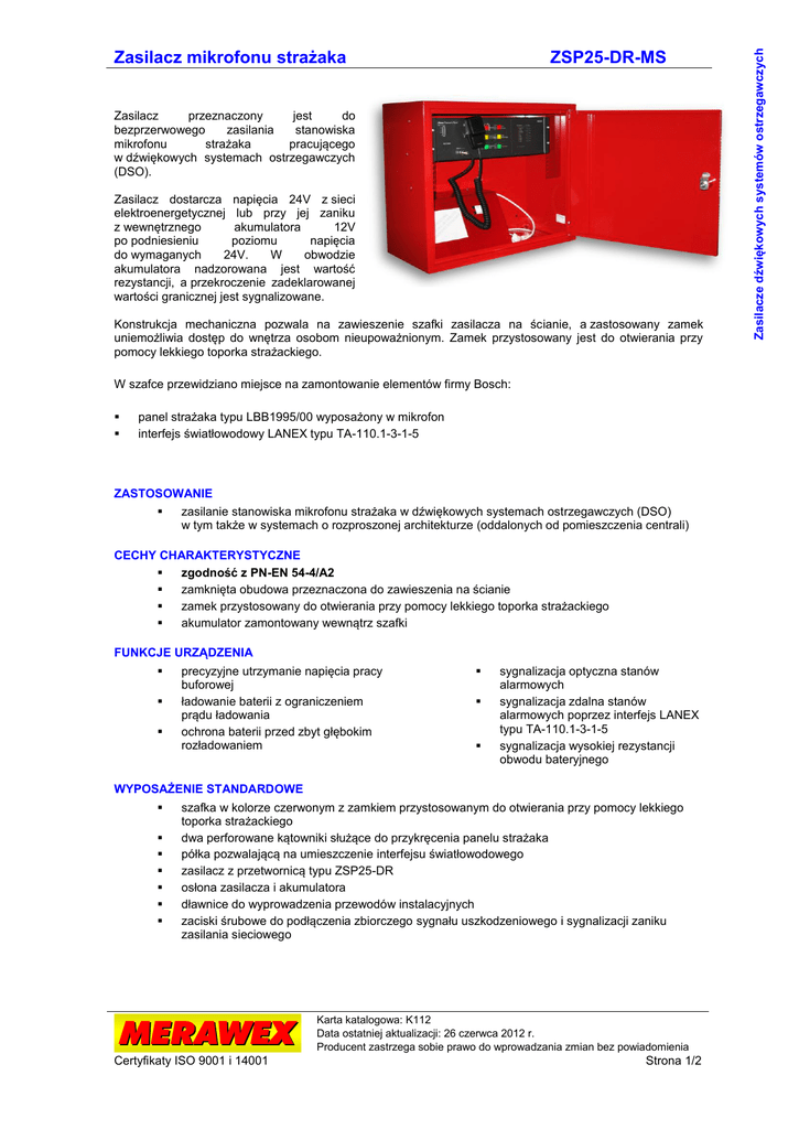 ZSP25-DR-MS Zasilacz przeznaczony jest do bezprzerwowego zasilania stanowiska mikrofonu strażaka pracującego w dźwiękowych systemach ostrzegawczych (DSO). Zasilacz dostarcza napięcia 24V z sieci elektroenergetycznej lub przy jej zaniku z wewnętrznego akumulatora 12V po podniesieniu poziomu napięcia do wymaganych 24V. W obwodzie akumulatora nadzorowana jest wartość rezystancji, a przekroczenie zadeklarowanej wartości granicznej jest sygnalizowane. Konstrukcja mechaniczna pozwala na zawieszenie szafki zasilacza na ścianie, a zastosowany zamek uniemożliwia dostęp do wnętrza osobom nieupoważnionym. Zamek przystosowany jest do otwierania przy pomocy lekkiego toporka strażackiego. W szafce przewidziano miejsce na zamontowanie elementów firmy Bosch: panel strażaka typu LBB1995/00 wyposażony w mikrofon interfejs światłowodowy LANEX typu TA-110.1-3-1-5 ZASTOSOWANIE zasilanie stanowiska mikrofonu strażaka w dźwiękowych systemach ostrzegawczych (DSO) w tym także w systemach o rozproszonej architekturze (oddalonych od pomieszczenia centrali) CECHY CHARAKTERYSTYCZNE zgodność z PN-EN 54-4/A2 zamknięta obudowa przeznaczona do zawieszenia na ścianie zamek przystosowany do otwierania przy pomocy lekkiego toporka strażackiego akumulator zamontowany wewnątrz szafki FUNKCJE URZĄDZENIA precyzyjne utrzymanie napięcia pracy buforowej ładowanie baterii z ograniczeniem prądu ładowania ochrona baterii przed zbyt głębokim rozładowaniem sygnalizacja optyczna stanów alarmowych sygnalizacja zdalna stanów alarmowych poprzez interfejs LANEX typu TA-110.1-3-1-5 sygnalizacja wysokiej rezystancji obwodu bateryjnego WYPOSAŻENIE STANDARDOWE szafka w kolorze czerwonym z zamkiem przystosowanym do otwierania przy pomocy lekkiego toporka strażackiego dwa perforowane kątowniki służące do przykręcenia panelu strażaka półka pozwalającą na umieszczenie interfejsu światłowodowego zasilacz z przetwornicą typu ZSP25-DR osłona zasilacza i akumulatora dławnice do wyprowadzenia przewodów instalacyjnych zaciski śrubowe do podłączenia zbiorczego sygnału uszkodzeniowego i sygnalizacji zaniku zasilania sieciowego MERAWEX Certyfikaty ISO 9001 i 14001 Karta katalogowa: K112 Data ostatniej aktualizacji: 26 czerwca 2012 r. Producent zastrzega sobie prawo do wprowadzania zmian bez powiadomienia Strona 1/2 Zasilacze dźwiękowych systemów ostrzegawczych Zasilacz mikrofonu strażaka Zasilacze dźwiękowych systemów ostrzegawczych Zasilacz mikrofonu strażaka ZSP25-DR-MS WYPOSAŻENIE OPCJONALNE akumulator 12V/28Ah dedykowany klucz do zamka szafki PODSTAWOWE PARAMETRY ZASILACZA Parametry wejściowe Napięcie zasilania Częstotliwość Pobór prądu Parametry wyjściowe Napięcie wyjściowe Prąd obciążenia Akumulator (wewnętrzny) Napięcie pracy buforowej Napięcie sygnalizacji rozładowanego akumulatora Minimalne napięcie akumulatora – odłączenie baterii Maksymalna rezystancja obwodu akumulatora *1) Maksymalny prąd ładowania akumulatora Podtrzymanie napięcia 48V po zaniku zasilania sieciowego - czas czuwania - czas alarmowania Zgodność z normami Bezpieczeństwo elektryczne Zaburzenia radioelektryczne Odporność EMC Ogólne 230VAC +10% -20% 47...63 Hz max 0,4A 23,5…24,5V 0,4 A 12V / 28Ah 13,6V 10,8V 10,0V 150mΩ 1,2…1,5A 24h 0,5h I kl. wg PN-EN 60950-1:2007 PN-EN 55022 poziom B PN-EN 50130-4:2002/A2:2007 -5 40C IP30 Zakres temperatur pracy Stopień ochrony 600 500 300 mm Wymiary (SWG) 28kg *2) Masa z baterią akumulatorów *1) Gwarantowana wartość rezystancji obwodu akumulatora, przy której zostanie uruchomiona sygnalizacja alarmu. *2) Masa z elementami systemu PLENA 33 kg. Przykład zamówienia Zasilacz mikrofonu strażaka ZSP25-DR-MS PRODUCENT UWAGI MERAWEX Sp. z o.o. Toruńska 8, 44-122 Gliwice NIP 631-000-04-40 www.merawex.com.pl [email protected] tel. 32 23 39 400 fax 32 23 39 409 MERAWEX Certyfikaty ISO 9001 i 14001 Karta katalogowa: K112 Data ostatniej aktualizacji: 26 czerwca 2012 r. Producent zastrzega sobie prawo do wprowadzania zmian bez powiadomienia Strona 2/2