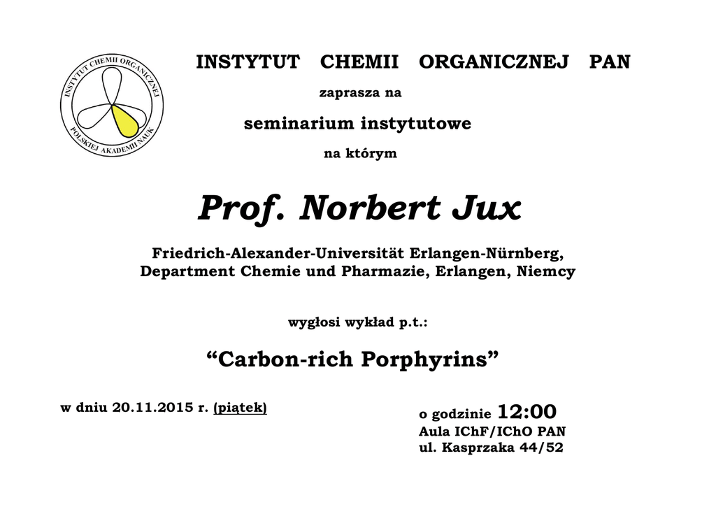 INSTYTUT CHEMII ORGANICZNEJ zaprasza na seminarium instytutowe na którym Prof. Norbert Jux Friedrich-Alexander-Universität Erlangen-Nürnberg, Department Chemie und Pharmazie, Erlangen, Niemcy wygłosi wykład p.t.: “Carbon-rich Porphyrins” w dniu 20.11.2015 r. (piątek) o godzinie 12:00 Aula IChF/IChO PAN ul. Kasprzaka 44/52 PAN