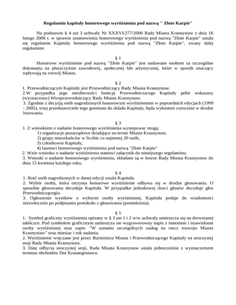 Regulamin kapituły honorowego wyróżnienia pod nazwą " Złote Karpie" Na podstawie § 4 ust 3 uchwały Nr XXXVI/277/2006 Rady Miasta Krasnystaw z dnia 16 lutego 2006 r. w sprawie ustanowienia honorowego wyróżnienia pod nazwą "Złote Karpie" ustala się regulamin Kapituły honorowego wyróżnienia pod nazwą "Złote Karpie", zwany dalej regulamine. §1 Honorowe wyróżnienie pod nazwą "Złote Karpie" jest nadawane osobom za szczególne dokonania na płaszczyźnie zawodowej, społecznej lub artystycznej, które w sposób znaczący wpływają na rozwój Miasta. §2 1. Przewodniczącym Kapituły jest Przewodniczący Rady Miasta Krasnystaw. 2.W przypadku jego nieobecności funkcję Przewodniczacego Kapituły pełni wskazany (wyznaczony) Wiceprzewodniczący Rady Miasta Krasnystaw. 3. Zgodnie z decyzją osób nagrodzonych honorowym wyróżnieniem w poprzednich edycjach (1999 - 2005), trzej przedstawiciele tego gremium do składu Kapituły, będa wyłonieni corocznie w drodze losowania. §3 1. Z wnioskiem o nadanie honorowego wyróżnienia wystepowac mogą: 1) organizacje pozarządowe działające na ternie Miasta Krasnystaw, 2) grupy mieszkańców w liczbie co najmniej 20 osób, 3) członkowie Kapituły, 4) laureaci honorowego wyróżnienia pod nazwą "Złote Karpie" 2. Wzór wniosku o nadanie wyróżnienia stanowi załącznik do niniejszego regulaminu. 3. Wnioski o nadanie honorowego wyróżnienia, składane są w biurze Rady Miasta Krasnystaw do dnia 15 kwietnia każdego roku. §4 1. Ilość osób nagrodzonych w danej edycji ustala Kapituła. 2. Wybór osoby, która otrzyma honorowe wyróżnienie odbywa się w drodze głosowania. O sposobie głosowania decyduje Kapituła. W przypadku jednakowej ilosci głosów decyduje głos Przewodniczącegio. 3. Ogłoszenie wyników o wyborze osoby wyróżnionej, Kapituła podaje do wiadomości niezwłocznie po podpisaniu protokołu z głosowania (posiedzenia). §5 1. Symbol graficzny wyróżnienia opisany w § 3 ust 1 i 2 w/w uchwały umieszcza się na drewnianej tabliczce. Pod symbolem graficznym umieszcza sie wygrawerowny napis z imieniem i nzawiskiem osoby wyróżnionej oraz zapis: "W uznaniu szczególnych zasług na rzecz rozwoju Miasta Krasnystaw" oraz miesiac i rok nadania. 2. Wyróżnienie wręczane jest przez Burmistrza Miasta i Przewodniczącego Kapituły na uroczystej sesji Rady Miasta Krasnystaw. 3. Datę odbycia uroczystej sesji, Rada Miasta Krasnystaw ustala jednocześnie z wyznaczeniem terminu obchodów Dni Krasnegostawu.
