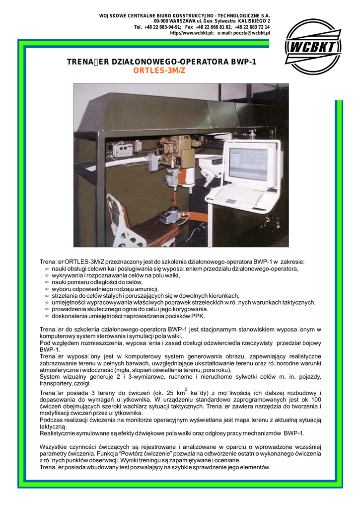WOJSKOWE CENTRALNE BIURO KONSTRUKCYJNO - TECHNOLOGICZNE S.A. 00-908 WARSZAWA ul. Gen. Sylwestra KALISKIEGO 2 Tel. +48 22 683-94-91; Fax +48 22 666 81 62, +48 22 683 72 14 http://www.wcbkt.pl; e-mail: [email protected] TRENAŻER DZIAŁONOWEGO-OPERATORA BWP-1 ORTLES-3M/Z Trenażer ORTLES-3M/Z przeznaczony jest do szkolenia działonowego-operatora BWP-1 w zakresie: • nauki obsługi celownika i posługiwania się wyposażeniem przedziału działonowego-operatora, • wykrywania i rozpoznawania celów na polu walki, • nauki pomiaru odległości do celów, • wyboru odpowiedniego rodzaju amunicji, • strzelania do celów stałych i poruszających się w dowolnych kierunkach, • umiejętności wypracowywania właściwych poprawek strzeleckich w różnych warunkach taktycznych, • prowadzenia skutecznego ognia do celu i jego korygowania. • doskonalenia umiejętności naprowadzania pocisków PPK. Trenażer do szkolenia działonowego-operatora BWP-1 jest stacjonarnym stanowiskiem wyposażonym w komputerowy system sterowania i symulacji pola walki. Pod względem rozmieszczenia, wyposażenia i zasad obsługi odzwierciedla rzeczywisty przedział bojowy BWP-1. Trenażer wyposażony jest w komputerowy system generowania obrazu, zapewniający realistyczne zobrazowanie terenu w pełnych barwach, uwzględniające ukształtowanie terenu oraz różnorodne warunki atmosferyczne i widoczność (mgła, stopień oświetlenia terenu, pora roku). System wizualny generuje 2 i 3-wymiarowe, ruchome i nieruchome sylwetki celów m. in. pojazdy, transportery, czołgi. 2 Trenażer posiada 3 tereny do ćwiczeń (ok. 25 km każdy) z możliwością ich dalszej rozbudowy i dopasowania do wymagań użytkownika. W urządzeniu standardowo zaprogramowanych jest ok 100 ćwiczeń obejmujących szeroki wachlarz sytuacji taktycznych. Trenażer zawiera narzędzia do tworzenia i modyfikacji ćwiczeń przez użytkownika. Podczas realizacji ćwiczenia na monitorze operacyjnym wyświetlana jest mapa terenu z aktualną sytuacją taktyczną. Realistycznie symulowane są efekty dźwiękowe pola walki oraz odgłosy pracy mechanizmów BWP-1. Wszystkie czynności ćwiczących są rejestrowane i analizowane w oparciu o wprowadzone wcześniej parametry ćwiczenia. Funkcja “Powtórz ćwiczenie” pozwala na odtworzenie ostatnio wykonanego ćwiczenia z różnych punktów obserwacji. Wyniki treningu są zapamiętywane i oceniane. Trenażer posiada wbudowany test pozwalający na szybkie sprawdzenie jego elementów. WOJSKOWE CENTRALNE BIURO KONSTRUKCYJNO - TECHNOLOGICZNE S.A. 00-908 WARSZAWA ul. Gen. Sylwestra KALISKIEGO 2 Tel. +48 22 683-94-91; Fax +48 22 666 81 62, +48 22 683 72 14 http://www.wcbkt.pl; e-mail: [email protected] TRENAŻER DZIAŁONOWEGO-OPERATORA BWP-1 ORTLES-3M/Z Baza danych żołnierzy: W bazie danych zapamiętywane są informacje o żołnierzach szkolonych za pomocą trenażera, pozwalające na identyfikację działonowego-operatora wykonującego ćwiczenie i śledzenie postępów szkolenia. Wprowadzane parametry: • dane atmosferyczne (kierunek i prędkość wiatru, ciśnienie atmosferyczne, oświetlenie, temperatura powietrza, zamglenie), • załadowana jednostka ognia, • ilość celów i dane o nich (sylwetka, odległość, miejsce pojawienia się, prędkość i tor ruchu, czas ekspozycji). Ocena treningu: • automatycznie po zakończeniu ćwiczenia, • szczegółowy raport z wybranego ćwiczenia, • raport dzienny lub okresowy, oceniający postępy w szkoleniu. Parametry techniczne: • zasilanie: sieć energetyczna • pobór mocy: • zakres temperatur pracy: • wilgotność względna pracy (bez kondensacji) • wilgotność względna przechowywania (bez kondensacji) • wymiary (dł. x szer. x wys) z zamontowanym monitorem operacyjnym: • masa trenażera 230 V / 50Hz 2,3 kW 13°C ÷ 35°C 10% ÷ 80% 10% ÷ 95% 2270x1300x1620 mm około 250 kg