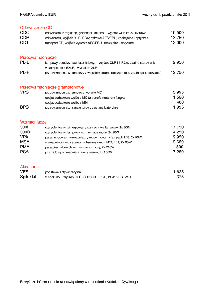 NAGRA cennik w EUR$ ważny od 1. października 2011 Odtwarzacze CD CDC! ! odtwarzacz z regulacją głośności i balansu, wyjścia XLR,RCA i cyfrowe ! CDP! ! odtwarzacz, wyjścia XLR, RCA; cyfrowe AES/EBU, koaksjalne i optyczne$ CDT! ! transport CD, wyjścia cyfrowe AES/EBU, koaksjalne i optyczne! ! ! $ ! Przedwzmacniacze PL-L! ! lampowy przedwzmacniacz liniowy, 1 wejście XLR i 3 RCA, zdalne sterowanie$ ! ! ! w komplecie z BXLR - wyjściem XLR PL-P! ! przedwzmacniacz lampowy z wejściem gramofonowym (bez zdalnego sterowania)$ Przedwzmacniacze gramofonowe VPS! ! przedwzmacniacz lampowy, wejście MC! ! ! ! ! opcja: dodatkowe wejście MC (z transformatorem Nagra)! ! ! opcja: dodatkowe wejście MM ! ! ! ! BPS! ! przedwzmacniacz tranzystorowy zasilany bateryjnie! ! ! ! ! ! ! ! ! ! 16 500 13 750 12 000 9 950 12 750 ! ! ! ! 5 995 1 550 400 1 995 Wzmacniacze 300i! ! stereofoniczny, zintegrowany wzmacniacz lampowy, 2x 20W $ 300B $ ! stereofoniczny, lampowy wzmacniacz mocy, 2x 20W !! ! VPA! ! para lampowych wzmacniaczy mocy mono na lampach 845, 2x 50W$ MSA! ! wzmacniacz mocy stereo na tranzystorach MOSFET, 2x 60W!! PMA! ! para piramidowych wzmacniaczy mocy, 2x 200W ! ! ! PSA! ! piramidowy wzmacniacz mocy stereo, 2x 100W! ! ! $ $ ! ! ! ! ! ! ! ! ! ! 17 750 14 250 19 950 9 650 11 500 7 250 Akcesoria VFS! ! Spike kit! ! ! ! ! 1 625 375 podstawa antywibracyjna! ! ! ! ! ! 3 nóżki do urządzeń CDC, CDP, CDT, PL-L, PL-P, VPS, MSA !! Powyższe informacje nie stanowią oferty w rozumieniu Kodeksu Cywilnego