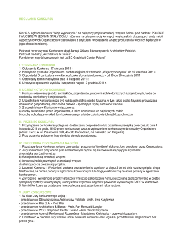 REGULAMIN KONKURSU Kler S.A. ogłasza Konkurs "Wizja wypoczynku" na najlepszy projekt aranżacji wnętrza Salonu pod hasłem : POLSKIE I WŁOSKIE W JEDNYM STAŁY DOMU, który ma na celu promocję koncepcji wnętrzarskich ukazujących atuty mebli wypoczynkowych Organizatora w zestawieniu z artykułami wyposażenia wnętrz producentów włoskich będących w jego ofercie handlowej. Patronat honorowy nad Konkursem objął Zarząd Główny Stowarzyszenia Architektów Polskich. Patronat medialny „Architektura & Biznes” Fundatorem nagród rzeczowych jest „WSC Graphisoft Center Poland” I. TERMINARZ KONKURSU 1. Ogłoszenie Konkursu 17 sierpnia 2011 r. 2. Nadsyłanie pytań do Organizatora [email protected] w temacie „Wizja wypoczynku” do 10 września 2011 r. 3. Odpowiedzi Organizatora www.kler.eu/konkurs/pytaniaiodpowiedzi - od 10 do 30 września 2011 4. Ostateczny termin nadsyłania prac 4 listopada 2011 r. 5. Uroczyste ogłoszenie wyników i wręczenie nagród 2 grudnia 2011 r. II. UCZESTNICTWO W KONKURSIE 1. Konkurs skierowany jest do: architektów, projektantów, pracowni architektonicznych i projektowych, także do studentów architektury i projektowania. 2. Uczestnikiem Konkursu może być każda pełnoletnia osoba fizyczna, w tym także osoba fizyczna prowadząca działalność gospodarczą, oraz osoba prawna - spełniająca wyżej określone warunki. 3. Z uczestnictwa w Konkursie wyłączone są: a) osoby zatrudniane przez Organizatora, a także członkowie ich najbliższych rodzin b) osoby wchodzące w skład Jury konkursowego, a także członkowie ich najbliższych rodzin III. PRZEBIEG KONKURSU 1. Przystąpienie do Konkursu polega na dostarczeniu bezpośrednio lub przesłaniu przesyłką poleconą do dnia 4 listopada 2011 do godz. 15.00 pracy konkursowej wraz ze zgłoszeniem konkursowym do siedziby Organizatora (adres: Kler S.A. ul. Piastowska 39B, 46-380 Dobrodzień, na nazwisko Jan Cegiełka). 2. Przy przesyłce poleconej liczy się data stempla pocztowego. IV. PROCEDURA PRZYZNAWANIA NAGRÓD 1. Rozstrzygnięcia Konkursu, wyboru Laureatów i przyznania Wyróżnień dokona Jury, powołane przez Organizatora. 2. Jury konkursowe przy ocenie prac konkursowych będzie się kierowało następującymi kryteriami: a) estetyką aranżacji wnętrza b) funkcjonalnością aranżacji wnętrza c) innowacyjnością rozwiązań w aranżacji wnętrza d) atrakcyjnością prezentacji projektu. 3. Laureaci Konkursu i Wyróżnieni, zostaną powiadomieni o wynikach w ciągu 2 dni od dnia rozstrzygnięcia, drogą telefoniczną na numer podany w zgłoszeniu konkursowym lub drogą elektroniczną na adres podany w zgłoszeniu konkursowym. 4. Zwycięskie i wyróżnione projekty aranżacji wnętrz po zakończeniu Konkursu zostaną zaprezentowane w postaci specjalnej wystawy towarzyszącej uroczystemu wręczeniu nagród w pawilonie wystawowym SARP w Warszawie. 5. Wyniki Konkursu są ostateczne i nie podlegają zastrzeżeniom ani reklamacjom. V. JURY KONKURSOWE 1. W skład Jury konkursowego wejdą : - przedstawiciel Stowarzyszenia Architektów Polskich - Arch. Ewa Kuryłowicz - przedstawiciel Kler S.A. - Piotr Kler - przedstawiciel Architektura & Biznes - Arch. Pan Romuald Loegler - przedstawiciel WSC Graphisoft Center Poland - Arch. Witold Szymanik - przedstawiciel Agencji Reklamowej Rozgłośnia - Magdalena Kiełkiewicz - przewodnicząca jury. 2. Dodatkowo w pracach Jury weźmie udział sekretarz konkursu Jan Cegiełka, przedstawiciel Organizatora bez prawa głosu. VI. WARUNKI KONKURSU 1. Projekt aranżacji wnętrza, przedstawiony w pracy konkursowej, musi spełniać następujące warunki: a) dotyczyć wskazanej przez organizatora kategorii aranżacji wnętrza salonu. Salon stanowi fragment budowli i może być otwarty na inne przestrzenie użytkowe, które mogą być zaaranżowane dowolnymi sprzętami z poza oferty Kler S.A., wyjątek stanowi jadalnia i sypiania, jeśli one znajdą się w obszarze opracowania powinny być wyposażone w produkty z oferty handlowej Organizatora, b) przedmiotem opracowania musi być jeden z dwóch wskazanych przez Organizatora obiektów w Warszawie lub Wrocławiu z oferty rynkowej GANT Development S.A., których dokumentacja stanowi załącznik do konkursu. c) zawierać rzut i przekrój opracowywanego fragmentu budowli wraz z salonem w skali 1:20 lub 1:50 oraz wizualizację przestrzeni wewnętrznej wykonaną dowolną techniką z dowolnym ustawieniem punktu obserwatora d) w pracy konkursowej zostaną wykorzystane wyłącznie meble wypoczynkowe Kler S.A. w zestawieniu z innymi meblami dostępnymi w jego ofercie wyposażenia wnętrz produkowanymi przez partnerów włoskich, a których specyfikacja stanowi element dokumentów konkursowych, e) do projektu powinna być dołączona lista wykorzystanych w projekcie produktów. Każdy z produktów powinien być opisany nazwą własną i nazwą producenta. 2. Prace konkursowe należy dostarczyć łącznie: a) na minimum 2 a maksimum 4 planszach w rozmiarze A2 b) w wersjach elektronicznych zapisanych na płycie CD w formatach JPG(200 DPI rozmiar A3), wizualizacje mogą być dodatkowo zapisane w postaci animacji w formacie AVI, MPG z informacją na planszach o załączonej takiej prezentacji projektu (przy czym prezentacja może ale nie musi być oceniana przez Jury konkursu) c) każda plansza oraz płyta CD muszą być opatrzone na odwrocie godłem d) w opakowaniu zawierającym prace konkursowe, należy umieścić kopertę, zawierającą zgłoszenie konkursowe, opatrzoną wyłącznie godłem oraz dopiskiem „Konkurs - Wizja wypoczynku” e) na planszach i na płycie nie mogą znajdować się żadne dane umożliwiające identyfikację Uczestnika konkursu. 3. Zgłoszenie konkursowe stanowi załącznik do niniejszego regulaminu. Formularz zgłoszenia konkursowego oraz treść regulaminu można pobrać ze strony internetowej www.kler.eu 4. Godło powinno się składać z ciągu liter i cyfr, uniemożliwiających identyfikację Uczes