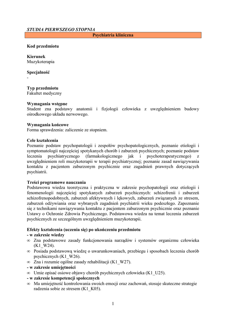 STUDIA PIERWSZEGO STOPNIA Psychiatria kliniczna Kod przedmiotu Kierunek Muzykoterapia Specjalność Typ przedmiotu Fakultet medyczny Wymagania wstępne Student zna podstawy anatomii i fizjologii człowieka z uwzględnieniem budowy ośrodkowego układu nerwowego. Wymagania końcowe Forma sprawdzenia: zaliczenie ze stopniem. Cele kształcenia Poznanie podstaw psychopatologii i zespołów psychopatologicznych, poznanie etiologii i symptomatologii najczęściej spotykanych chorób i zaburzeń psychicznych; poznanie podstaw leczenia psychiatrycznego (farmakologicznego jak i psychoterapeutycznego) z uwzględnieniem roli muzykoterapii w terapii psychiatrycznej; poznanie zasad nawiązywania kontaktu z pacjentem zaburzonym psychicznie oraz zagadnień prawnych dotyczących psychiatrii. Treści programowe nauczania Podstawowa wiedza teoretyczna i praktyczna w zakresie psychopatologii oraz etiologii i fenomenologii najczęściej spotykanych zaburzeń psychicznych: schizofrenii i zaburzeń schizofrenopodobnych, zaburzeń afektywnych i lękowych, zaburzeń związanych ze stresem, zaburzeń odżywiania oraz wybranych zagadnień psychiatrii wieku podeszłego. Zapoznanie się z technikami nawiązywania kontaktu z pacjentem zaburzonym psychicznie oraz poznanie Ustawy o Ochronie Zdrowia Psychicznego. Podstawowa wiedza na temat leczenia zaburzeń psychicznych ze szczególnym uwzględnieniem muzykoterapii. Efekty kształcenia (uczenia się) po ukończeniu przedmiotu - w zakresie wiedzy • Zna podstawowe zasady funkcjonowania narządów i systemów organizmu człowieka (K1_W24). • Posiada podstawową wiedzę o uwarunkowaniach, przebiegu i sposobach leczenia chorób psychicznych (K1_W26). • Zna i rozumie ogólne zasady rehabilitacji (K1_W27). - w zakresie umiejętności • Umie opisać osiowe objawy chorób psychicznych człowieka (K1_U25). - w zakresie kompetencji społecznych • Ma umiejętność kontrolowania swoich emocji oraz zachowań, stosuje skuteczne strategie radzenia sobie ze stresem (K1_K05). 1 • • • • • • Jest zdolny do definiowania własnych sądów na tematy społeczne, kulturowe i etyczne w kontekście własnej pracy terapeutycznej (K1_K06). Posiada umiejętności skutecznego komunikowania się z innymi, w tym także z personelem medycznym i pacjentami (K1_K07). Posiada umiejętność współpracy podczas realizacji zespołowych działań (K1_K08). Ma potrzebę ciągłego rozwoju własnego i rozwoju kompetencji zawodowych muzykoterapeuty (K1_K12). Rozumie znaczenie komunikacji werbalnej i niewerbalnej w procesie komunikowania się z pacjentami oraz pojęcie zaufania w interakcji z pacjentem. Potrafi nawiązać i utrzymać głęboki i pełen szacunku kontakt z chorym. Metody nauczania Wykład, prezentacja multimedialna, dyskusja, analiza przypadków pacjentów. Nakład pracy studenta potrzebny do osiągnięcia efektów uczenia się ROK SEMESTR I 1 II 2 3 III 4 Punkty ECTS Ilość godzin w semestrze Rodzaj zaliczenia LEGENDA 5 6 2 2 16 16 zal zs zal – zaliczony; zs – zaliczenie ze stopniem; egz – egzamin; ed – egzamin dyplomowy Kryteria oceny Metodą weryfikacji wiedzy zdobytej przez studenta będzie TEST jednokrotnego wyboru na ocenę. Literatura (piśmiennictwo) Kępiński A., Podstawowe zagadnienia współczesnej psychiatrii, wyd. 1., Wydawnictwo Literackie, Kraków 2003. Marek Jarema, Jolanta Rabe-Jabłońska, Psychiatria, Podręcznik dla studentów medycyny. Wydawnictwo Lekarskie PZWL. Warszawa, 2011. Język wykładowy Polski, w/w zajęcia pedagog może prowadzić w języku angielskim. Imię i nazwisko wykładowcy dr n. med. Piotr Wierzbiński 2