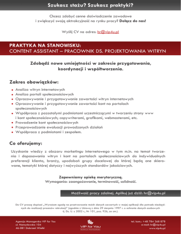 Szukasz stażu? Szukasz praktyki? Chcesz zdobyć cenne doświadczenie zawodowe i zwiększyć swoją aktrakcyjność na rynku pracy? Dołącz do nas! Wyślij CV na adres: [email protected] PRAKTYKA NA STANOWISKU: CONTENT ASSISTANT – PRACOWNIK DS. PROJEKTOWANIA WITRYN Zdobądź nowe umiejętności w zakresie przygotowania, koordynacji i współtworzenia. Zakres obowiązków: Analiza witryn internetowych Analiza portali społecznościowych Opracowywanie i przygotowywanie zawartości witryn internetowych Opracowywanie i przygotowywanie zawartości kont na portalach społecznościowych Współpraca z pozostałymi podmiotami uczestniczącymi w tworzeniu strony www i kont społecznościowych; copywriterami, grafikami, webmasterami, etc. Prowadzenie kont społecznościowych Przeprowadzanie ewaluacji prowadzonych działań Współpraca z podmiotami i zespołem. Co oferujemy: Uzyskanie wiedzy z obszaru marketingu internetowego w tym m.in. na temat tworzenia i dopasowania witryn i kont na portalach społecznościowych do indywidualnych preferencji klienta, branży, upodobań grupy docelowej do której będą one skierowane, tematyki której dotyczy i najwyższych standardów jakościowych. Zapewniamy opiekę merytoryczną. Wymagania: zaangażowanie, terminowość, solidność. Możliwość pracy zdalnej. Aplikuj już dziś!: [email protected] Do CV proszę dopisać ,,Wyrażam zgodę na przetwarzanie moich danych zawartych w mojej aplikacji dla potrzeb niezbędnych do realizacji procesów rekrutacji” (zgodnie z Ustawą z dnia 29 sierpnia 1997 r. o ochronie danych osobowych tj. Dz. U. z 2002 r., Nr 101, poz. 926, ze zm.). Agencja Managerska VIP for You ul. Namysłowska 104 46-081 Dobrzeń Wielki tel. kom.: +48 784 368 878 e-mail: [email protected] www.vip4u.pl