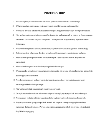 PRZEPISY BHP 1. W czasie pracy w laboratorium zalecane jest noszenie fartucha ochronnego. 2. W laboratorium zabronione jest spożywanie posiłków oraz picie napojów. 3. W trakcie trwania laboratorium zabronione jest przyjmowanie wizyt osób postronnych. 4. Nie wolno wykonywać eksperymentów i prac nie wchodzących w zakres wykonywanego ćwiczenia. Nie wolno używać urządzeń i odczynników innych niż są zaplanowane w ćwiczeniu. 5. Wszystkie urządzenia elektryczne należy użytkować wyłącznie zgodnie z instrukcją. 6. Zabronione jest włączanie do sieci urządzeń elektrycznych z uszkodzoną izolacją. 7. Nie wolno używać przewodów nieizolowanych i bez wtyczek nawet przy niskich napięciach. 8. Nie wolno korzystać z uszkodzonych gniazd sieciowych. 9. W przypadku urządzeń wymagających uziemienia, nie wolno ich podłączać do gniazd nie posiadających uziemienia. 10. Przed rozpoczęciem wykonywania ćwiczenia prowadzący sprawdzi poprawność złożonego układu elektrycznego. 11. Nie wolno dotykać rozgrzanych pieców oporowych. 12. Do wykonywania ćwiczeń nie wolno używać naczyń pękniętych lub uszkodzonych. 13. Prowadzący wskaże jakie ćwiczenia należy wykonywać w okularach ochronnych. 14. Przy wyjmowaniu gorących próbek metali lub stopów z rozgrzanego pieca należy zachować dużą ostrożność. Po wyjęciu z pieca gorących próbek nie wolno ich dotykać dopóki nie wystygną.