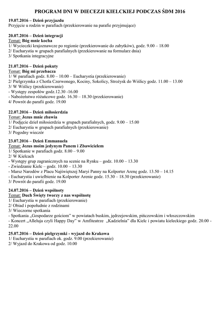 PROGRAM DNI W DIECEZJI KIELCKIEJ PODCZAS ŚDM 2016 19.07.2016 – Dzień przyjazdu Przyjęcie u rodzin w parafiach (przekierowanie na parafie przyjmujące) 20.07.2016 – Dzień integracji Temat: Bóg mnie kocha 1/ Wycieczki krajoznawcze po regionie (przekierowanie do zabytków), godz. 9.00 – 18.00 2/ Eucharystia w grupach parafialnych (przekierowanie na formularz dnia) 3/ Spotkania integracyjne 21.07.2016 – Dzień pokuty Temat: Bóg mi przebacza 1/ W parafiach godz. 8.00 – 10.00 – Eucharystia (przekierowanie) 2/ Pielgrzymka z Chotla Czerwonego, Kociny, Sokolicy, Strożysk do Wiślicy godz. 11.00 – 13.00 3/ W Wiślicy (przekierowanie) - Występy zespołów godz.12.30 -16.00 - Nabożeństwo różańcowe godz. 16.30 – 18.30 (przekierowanie) 4/ Powrót do parafii godz. 19.00 22.07.2016 – Dzień miłosierdzia Temat: Jezus mnie zbawia 1/ Podjęcie dzieł miłosierdzia w grupach parafialnych, godz. 9.00 – 15.00 2/ Eucharystia w grupach parafialnych (przekierowanie) 3/ Pogodny wieczór 23.07.2016 – Dzień Emmanuela Temat: Jezus moim jedynym Panem i Zbawicielem 1/ Spotkanie w parafiach godz. 8.00 – 9.00 2/ W Kielcach - Występy grup zagranicznych na scenie na Rynku – godz. 10.00 – 13.30 - Zwiedzanie Kielc – godz. 10.00 – 13.30 - Marsz Narodów z Placu Najświętszej Maryi Panny na Kolporter Arenę godz. 13.50 – 14.15 - Eucharystia i uwielbienie na Kolporter Arenie godz. 15.30 – 18.30 (przekierowanie) 3/ Powrót do parafii godz. 19.00 24.07.2016 – Dzień wspólnoty Temat: Duch Święty tworzy z nas wspólnotę 1/ Eucharystia w parafiach (przekierowanie) 2/ Obiad i popołudnie z rodzinami 3/ Wieczorne spotkania - Spotkania „Gospodarze gościom” w powiatach buskim, jędrzejowskim, pińczowskim i włoszczowskim - Koncert „Alleluja czyli Happy Day” w Amfiteatrze „Kadzielnia” dla Kielc i powiatu kieleckiego godz. 20.00 22.00 25.07.2016 – Dzień pielgrzymki - wyjazd do Krakowa 1/ Eucharystia w parafiach ok. godz. 9.00 (przekierowanie) 2/ Wyjazd do Krakowa od godz. 10.00