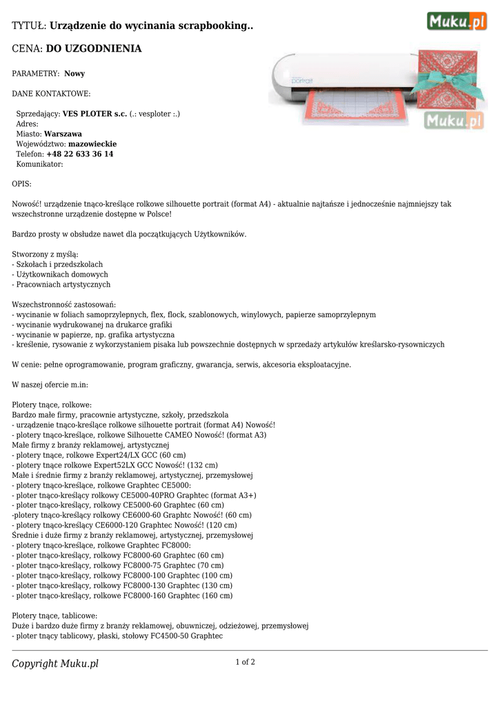 TYTUŁ: Urządzenie do wycinania scrapbooking.. CENA: DO UZGODNIENIA PARAMETRY: Nowy DANE KONTAKTOWE: Sprzedający: VES PLOTER s.c. (.: vesploter :.) Adres: Miasto: Warszawa Województwo: mazowieckie Telefon: +48 22 633 36 14 Komunikator: OPIS: Nowość! urządzenie tnąco-kreślące rolkowe silhouette portrait (format A4) - aktualnie najtańsze i jednocześnie najmniejszy tak wszechstronne urządzenie dostępne w Polsce! Bardzo prosty w obsłudze nawet dla początkujących Użytkowników. Stworzony z myślą: - Szkołach i przedszkolach - Użytkownikach domowych - Pracowniach artystycznych Wszechstronność zastosowań: - wycinanie w foliach samoprzylepnych, flex, flock, szablonowych, winylowych, papierze samoprzylepnym - wycinanie wydrukowanej na drukarce grafiki - wycinanie w papierze, np. grafika artystyczna - kreślenie, rysowanie z wykorzystaniem pisaka lub powszechnie dostępnych w sprzedaży artykułów kreślarsko-rysowniczych W cenie: pełne oprogramowanie, program graficzny, gwarancja, serwis, akcesoria eksploatacyjne. W naszej ofercie m.in: Plotery tnące, rolkowe: Bardzo małe firmy, pracownie artystyczne, szkoły, przedszkola - urządzenie tnąco-kreślące rolkowe silhouette portrait (format A4) Nowość! - plotery tnąco-kreślące, rolkowe Silhouette CAMEO Nowość! (format A3) Małe firmy z branży reklamowej, artystycznej - plotery tnące, rolkowe Expert24/LX GCC (60 cm) - plotery tnące rolkowe Expert52LX GCC Nowość! (132 cm) Małe i średnie firmy z branży reklamowej, artystycznej, przemysłowej - plotery tnąco-kreślące, rolkowe Graphtec CE5000: - ploter tnąco-kreślący rolkowy CE5000-40PRO Graphtec (format A3+) - ploter tnąco-kreślący, rolkowy CE5000-60 Graphtec (60 cm) -plotery tnąco-kreślący rolkowy CE6000-60 Graphtc Nowość! (60 cm) - plotery tnąco-kreślący CE6000-120 Graphtec Nowość! (120 cm) Średnie i duże firmy z branży reklamowej, artystycznej, przemysłowej - plotery tnąco-kreślące, rolkowe Graphtec FC8000: - ploter tnąco-kreślący, rolkowy FC8000-60 Graphtec (60 cm) - ploter tnąco-kreślący, rolkowy FC8000-75 Graphtec (70 cm) - ploter tnąco-kreślący, rolkowy FC8000-100 Graphtec (100 cm) - ploter tnąco-kreślący, rolkowy FC8000-130 Graphtec (130 cm) - ploter tnąco-kreślący, rolkowe FC8000-160 Graphtec (160 cm) Plotery tnące, tablicowe: Duże i bardzo duże firmy z branży reklamowej, obuwniczej, odzieżowej, przemysłowej - ploter tnący tablicowy, płaski, stołowy FC4500-50 Graphtec Copyright Muku.pl 1 of 2 - ploter tnący tablicowy, płaski, stołowy FC4200-60 Graphtec - ploter tnący tablicowy, płaski, stołowy FC4510-60 Graphtec - ploter tnący tablicowy, płaski, stołowy FC2250-60VC Graphtec - ploter tnący tablicowy, płaski, stołowy FC2250-120VC Graphtec - ploter tnący tablicowy, płaski, stołowy FC2250-120ES Graphtec - ploter tnący tablicowy, płaski, stołowy FC2250-180ES Graphtec - ploter tnący tablicowy, płaski, stołowy FC2250-180VC Graphtec Plotery drukujące: - ploter drukujący VersaArt RS-540 oraz RS-640 Roland - ploter drukujący SOLJET PRO XJ - 640 / 740 Roland - ploter drukujący AdwancedJET AJ-1000/AJ-740 Roland - ploter drukując-tnący Roland Versa UV LEC-300 Roland - ploter drukujący HI-FI Express FP-740 Roland - ploter drukująco-tnący VersaCAMM VP-540 / VP-300 Roland - ploter drukująco-tnący SOLJET PRO III XC-540 - ploter drukujący NANIVA NOWOŚĆ! - drukarki wielkoformatowe: - drukarka wielkoformatowa Canon iPF605 - drukarka wielkoformatowa Canon iPF610 - drukarka wielkoformatowa Canon iPF650 - drukarka wielkoformatowa Canon iPF655 - drukarka wielkoformatowa Canon iPF750 - drukarka wielkoformatowa Canon iPF755 - drukarka wielkoformatowa Canon iPF810 - drukarka wielkoformatowa Canon LP17 - drukarka wielkoformatowa Canon iPF5100 - drukarka wielkoformatowa Canon iPF6100 - drukarka wielkoformatowa Canon iPF6200 - drukarka wielkoformatowa Canon iPF8100 - drukarka wielkoformatowa Canon iPF9100 - drukarka wielkoformatowa Canon iPF6000S - drukarka wielkoformatowa Canon iPF8000S - drukarka wielkoformatowa Canon iPF9000S Skanery wielkoformatowe: - skaner wielkoformatowy CSX300 Graphtec Rejestratory: - rejestrator GRAPHTEC GL220 - wielokanałowy rejestrator GRAPHTEC GL820 - rejestrator GRAPHTEC GL900 - rejestrator GRAPHTEC MT100 - rejestrator GRAPHTEC WR300/WR310 Graphtec, Roland, Summa, GCC, Silhouette, Mutoh, Mimaki plotery tnące rolkowe, plotery tnąco-kreślące, rolkowe, plotery tnące tablicowe, plotery drukujące, plotery drukująco-tnące, skanery wielkoformatowe, rejestratory, części i akcesoria do ploterów Graphtec, GCC, Silhouette Więcej informacji: VES PLOTER s.c. - plotery tnące, drukujące, drukująco-tnące, skanery, rejestratory za rozsądną cenę! e-mail: [email protected], tel. +48 22 633 36 14 www.vesploter.pl Copyright Muku.pl 2 of 2