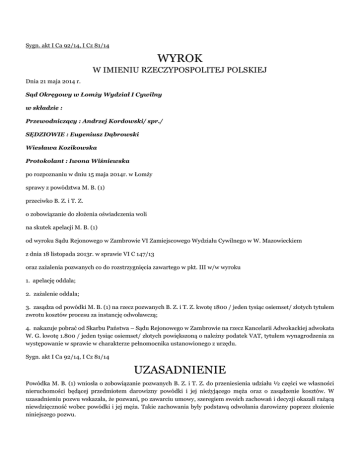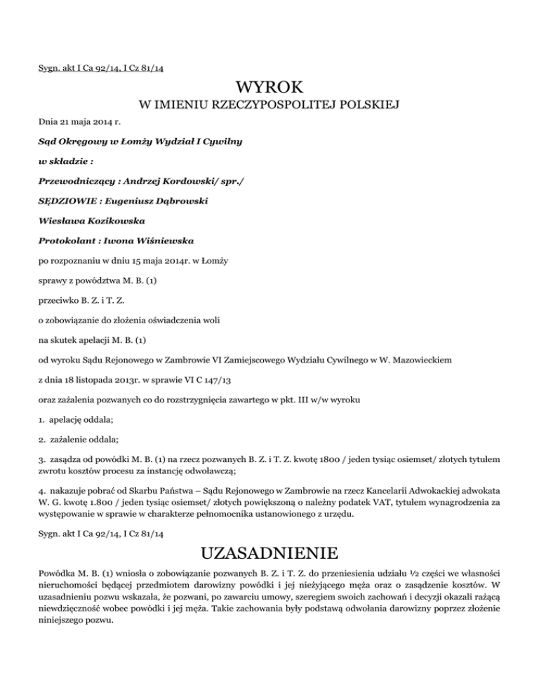 Sygn. akt I Ca 92/14, I Cz 81/14 WYROK W IMIENIU RZECZYPOSPOLITEJ POLSKIEJ Dnia 21 maja 2014 r. Sąd Okręgowy w Łomży Wydział I Cywilny w składzie : Przewodniczący : Andrzej Kordowski/ spr./ SĘDZIOWIE : Eugeniusz Dąbrowski Wiesława Kozikowska Protokolant : Iwona Wiśniewska po rozpoznaniu w dniu 15 maja 2014r. w Łomży sprawy z powództwa M. B. (1) przeciwko B. Z. i T. Z. o zobowiązanie do złożenia oświadczenia woli na skutek apelacji M. B. (1) od wyroku Sądu Rejonowego w Zambrowie VI Zamiejscowego Wydziału Cywilnego w W. Mazowieckiem z dnia 18 listopada 2013r. w sprawie VI C 147/13 oraz zażalenia pozwanych co do rozstrzygnięcia zawartego w pkt. III w/w wyroku 1. apelację oddala; 2. zażalenie oddala; 3. zasądza od powódki M. B. (1) na rzecz pozwanych B. Z. i T. Z. kwotę 1800 / jeden tysiąc osiemset/ złotych tytułem zwrotu kosztów procesu za instancję odwoławczą; 4. nakazuje pobrać od Skarbu Państwa – Sądu Rejonowego w Zambrowie na rzecz Kancelarii Adwokackiej adwokata W. G. kwotę 1.800 / jeden tysiąc osiemset/ złotych powiększoną o należny podatek VAT, tytułem wynagrodzenia za występowanie w sprawie w charakterze pełnomocnika ustanowionego z urzędu. Sygn. akt I Ca 92/14, I Cz 81/14 UZASADNIENIE Powódka M. B. (1) wniosła o zobowiązanie pozwanych B. Z. i T. Z. do przeniesienia udziału ½ części we własności nieruchomości będącej przedmiotem darowizny powódki i jej nieżyjącego męża oraz o zasądzenie kosztów. W uzasadnieniu pozwu wskazała, że pozwani, po zawarciu umowy, szeregiem swoich zachowań i decyzji okazali rażącą niewdzięczność wobec powódki i jej męża. Takie zachowania były podstawą odwołania darowizny poprzez złożenie niniejszego pozwu. Pozwani wnieśli o oddalenie powództwa w całości i zasądzenie kosztów procesu. W uzasadnieniu odpowiedzi na pozew podnieśli, że doszło do przedawnienia roszczenia, a nadto wszystkie nieporozumienia wynikały z niewłaściwego zachowania powódki i jej syna R.. Sąd Rejonowy w Zambrowie Zamiejscowy Wydział Cywilny w W. Mazowieckiem wyrokiem z dnia 18 listopada 2013 r. sygn. akt VI C 147/13 powództwo oddalił (pkt I wyroku). W pkt II wyroku Sąd zasądził od Skarbu Państwa (Sąd Rejonowy w Zambrowie) na rzecz adwokata W. G. tytułem pomocy prawnej udzielonej z urzędu kwotę 4.428 zł, w tym kwotę 828 zł tytułem podatku VAT. W pkt III wyroku Sąd odstąpił od obciążania powódki M. B. (1) kosztami procesu. Poczynione zostały następujące ustalenia faktyczne i ocena prawna. W dniu 16 września 1991 r. powódka oraz jej mąż W. B. w umowie darowizny przenieśli udział ½ części we własności nieruchomości w postaci działek o nr (...) o pow. 4.7550 ha wraz z zabudowaniami na rzecz pozwanych. Jednocześnie w tej umowie została ustanowiona na rzecz darczyńców służebność mieszkania, polegająca na korzystaniu z całego domu oraz pomieszczeń gospodarczych w zakresie niezbędnym do zaspokajania potrzeb i prawo użytkowania działki nr (...). Mąż powódki zmarł w 2001 r. W 2010 r. pozwana nie pozwoliła powódce korzystać z ogrodu, zagrodziła bramą i nie pozwalała obsiewać, została też pozbawiona możliwości hodowania zwierząt. Pozwani uniemożliwiają też powódce korzystanie z piwnicy. Między powódką a pozwanymi istnieje konflikt. Sąd Rejonowy wskazał, iż z treści art. 898 § 1 k.c. wynika, iż uprawnienie do odwołania darowizny jest uzależnione od dopuszczenia się rażącej niewdzięczności obdarowanego wobec darczyńcy. Pod pojęcie to podpada tylko takie zachowanie się obdarowanego, polegające na działaniu lub zaniechaniu skierowanym bezpośrednio lub nawet pośrednio przeciwko darczyńcy, które oceniając rzecz rozsądnie, musi być uznane za wysoce niewłaściwe i krzywdzące darczyńcę. Chodzi tu przede wszystkim o popełnienie przestępstwa przeciwko życiu, zdrowiu lub czci albo mieniu darczyńcy oraz o naruszenie przez obdarowanego spoczywających na nim obowiązków wynikających ze stosunków osobistych (rodzinnych) łączących go z darczyńcą oraz obowiązku wdzięczności (orzecz. z dn. 7 maja 2003 r., sygn. IV CKN 115/01). Rażącą niewdzięczność musi cechować znaczne nasilenie złej woli skierowanej na wyrządzenie darczyńcy krzywdy lub szkody majątkowej (tak Komentarz do KC. pod red. A. Kidyby, LEX 2010). Zdaniem Sądu Rejonowego w niniejszej sprawie strony pozostają w konflikcie, a zachowanie pozwanych można ocenić jako rażącą niewdzięczność. Fakt konfliktu potwierdzają w swych zeznaniach świadkowie M. B. (2) (k. 83v) i W. J. (k. 83v). Pozwani uniemożliwiają powódce korzystanie z jej uprawnień, zapisanych w umowie darowizny, a polegających na korzystaniu z całego domu, zatem także z piwnicy, oraz uniemożliwiają korzystanie z ogrodu poprzez postawienie płotu. Potwierdzają to zeznania świadków: R. B. (k. 44v), E. J. (k. 60v), R. W. (k. 61), J. J. (k. 61-61 v), T. P. (k. 61 v). W ocenie Sądu I instancji takie zachowanie wobec starszej schorowanej osoby wyczerpuje przesłanki rażącej niewdzięczności. To przecież m.in. pozwani jako obdarowani w ramach umowy darowizny ustanowili służebność, której obecnie nie respektują, nie mówiąc już o obowiązku wdzięczności i pomocy osobie starszej i schorowanej, mającej specyficzne potrzeby, choćby te związane z korzystaniem z ogródka, gdzie na potrzeby własnej diety uprawiała warzywa. Pozwani mają obowiązek prawny i moralny umożliwiać powódce poruszanie się w sposób swobodny po domu i tym bardziej nie mogą stawiać fizycznych barier starszej kobiecie, by nie mogła zejść do piwnicy. Niewątpliwie takie zachowania, jak też postawienie płotu, uniemożliwiającego korzystanie z działki, stanowią zachowania cechujące się znacznym nasileniem złej woli. Sąd Rejonowy uznał, iż wobec tego powódka mogła dokonać aktu odwołania darowizny w zakresie udziału we własności, który przeniosła na pozwa