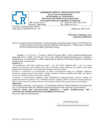 RADOMSKI SZPITAL SPECJALISTYCZNY im. dr Tytusa Chałubińskiego 26-610 Radom, ul. Tochtermana 1 Dział Zamówień Publicznych i Zaopatrzenia www.szpital.radom.pl; [email protected] NIP: 796-00-12-187 tel.: (048) 361-52-85, 361-52-84 REGON: 000315086 fax.: (048) 361-52-13 Centralny nr postępowania: 100/07 Znak sprawy: RSS/ZPiZ/P-64/…/07 Radom, dn. 2007.10.19 Wykonawcy ubiegający się o udzielenie zamówienia dotyczy: postępowania prowadzonego w trybie przetargu nieograniczonego poniżej 5.278.000 Euro na wymianę pokrycia dachowego budynku Oddziału Ginekologiczno – Położniczego i budynku Kotłowni Radomskiego Szpitala Specjalistycznego. Zgodnie z rt. 38, ust. 1 i 2 ustawy z dnia 29 stycznia 2004 r. Prawo zamówień publicznych (tekst jedn. Dz. U. z 2006 r. Nr 164, poz. 1163 ze zm.), Radomski Szpital Specjalistyczny z siedzibą w Radomiu przy ul. Tochtermana 1, udziela odpowiedzi na zapytania Wykonawcy złożone w niniejszym postępowaniu, a mianowicie: Pytanie nr 1: „W przedmiarze robót dział „budynek wysoki” – poz. 10 i dział „budynek niski” – poz. 6 w opisie pozycji kosztorysowej przewidziane jest pokrycie dachów papą asfaltową na tekturze jako papa podkładowa natomiast do wierzchniego krycia papa termozgrzewalna. Prosimy o wyjaśnienie co przemawiało za takim rozwiązaniem, mając na względzie odmienne parametry proponowanych materiałów, krótką żywotność obecnie produkowanej papy na tekturze oraz to, że zostało zerwane stare pokrycie dachu. Uważamy, że zastosowanie najtańszej papy podkładowej termozgrzewalnej niewiele wpłynie na podniesienie kosztów pokrycia 1m2, natomiast znacznie zwiększy jakość i żywotność nowego pokrycia. W przyszłości pozwoli to jednocześnie na renowację bez konieczności ponownego zrywania papy.” Odpowiedź: Zamawiający informuje, iż opis pozycji 1.10 przedmiaru robót dot. Dachu Oddziału Ginekologii oraz poz. 1.6 przedmiaru robót dot. Oddziału Ginekologii budynek niski otrzymuje nowe brzmienie: „Pokrycie dachu papą termozgrzewalną podkładową z asfaltu modyfikowanego SBS z zastosowaniem włókniny poliestrowej (na podkładzie betonowym). Powyższy zapis jest obowiązujący. Andrzej Pawluczyk …………………………………………….. Dyrektor Radomskiego Szpitala Specjalistycznego Sporządziła: Anna Skwarczyńska