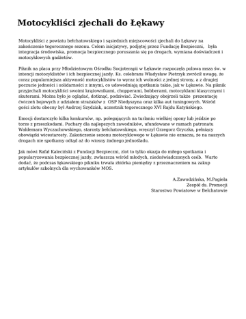 Motocykliści zjechali do Łękawy Motocykliści z powiatu bełchatowskiego i sąsiednich miejscowości zjechali do Łękawy na zakończenie tegorocznego sezonu. Celem inicjatywy, podjętej przez Fundację Bezpieczni, była integracja środowiska, promocja bezpiecznego poruszania się po drogach, wymiana doświadczeń i motocyklowych gadżetów. Piknik na placu przy Młodzieżowym Ośrodku Socjoterapii w Łękawie rozpoczęła polowa msza św. w intencji motocyklistów i ich bezpiecznej jazdy. Ks. celebrans Władysław Pietrzyk zwrócił uwagę, że coraz popularniejsza aktywność motocyklistów to wyraz ich wolności z jednej strony, a z drugiej poczucie jedności i solidarności z innymi, co udowodniają spotkania takie, jak w Łękawie. Na piknik przyjechali motocykliści swoimi krążownikami, chopperami, bobberami, motocyklami klasycznymi i skuterami. Można było je oglądać, dotknąć, podziwiać. Zwiedzający obejrzeli także prezentację ćwiczeń bojowych z udziałem strażaków z OSP Niedyszyna oraz kilka aut tuningowych. Wśród gości zlotu obecny był Andrzej Szydziak, uczestnik tegorocznego XVI Rajdu Katyńskiego. Emocji dostarczyło kilka konkursów, np. polegających na turlaniu wielkiej opony lub jeździe po torze z przeszkodami. Puchary dla najlepszych zawodników, ufundowane w ramach patronatu Waldemara Wyczachowskiego, starosty bełchatowskiego, wręczył Grzegorz Gryczka, pełniący obowiązki wicestarosty. Zakończenie sezonu motocyklowego w Łękawie nie oznacza, że na naszych drogach nie spotkamy odtąd aż do wiosny żadnego jednośladu. Jak mówi Rafał Kaleciński z Fundacji Bezpieczni, zlot to tylko okazja do miłego spotkania i popularyzowania bezpiecznej jazdy, zwłaszcza wśród młodych, niedoświadczonych osób. Warto dodać, że podczas łękawskiego pikniku trwała zbiórka pieniędzy z przeznaczeniem na zakup artykułów szkolnych dla wychowanków MOS. A.Zawodzińska, M.Pagiela Zespół ds. Promocji Starostwo Powiatowe w Belchatowie
