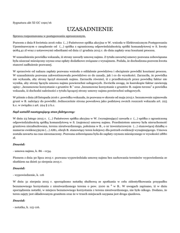 Sygnatura akt XI GC 1190/16 UZASADNIENIE Sprawa rozpoznawana w postępowaniu uproszczonym. Pozwem z dnia 8 kwietnia 2016 roku (...) Państwowe spółka akcyjna w W. wniosła w Elektronicznym Postępowaniu Upominawczym o zasądzenie od (...) spółka z ograniczoną odpowiedzialnością spółki komandytowej w S. kwoty 9084,41 zł wraz z ustawowymi odsetkami od dnia 17 grudnia 2015 r. do dnia zapłaty oraz kosztami procesu. W uzasadnieniu powódka wskazała, iż strony zawarły umowę najmu. Z tytułu zawartej umowy pozwana zobowiązana była uiszczać miesięczny czynsz oraz opłaty dodatkowe związane z wynajmem. Podała, że dochodzona pozwem kwota stanowi zadłużenie pozwanej. W sprzeciwie od nakazu zapłaty pozwana wniosła o oddalenie powództwa i obciążenie powódki kosztami procesu. W uzasadnieniu pozwana zakwestionowała powództwo co do zasady, jak i co do wysokości. Zarzuciła, że powódka nie wykazała, aby strony łączył stosunek najmu. Zarzuciła również, iż z przedłożonych przez powódkę faktur nie wynika, aby strony łączyła umowa najmu powierzchni usługowych. Zwróciła uwagę, że kserokopie faktur zawierają opisy: „bezumowne korzystanie z gruntów B.” oraz „bezumowne korzystanie z gruntów B.-najem terenu” a powódka wskazała, iż dochodzi należności z tytułu łączącej strony umowy najmu powierzchni usługowych. W piśmie z dnia 28 listopada 2016 r. powódka wskazała, że pozwana w okresie od maja 2015 r. bezumownie zajmowała grunt w B. należący do powódki. Jednocześnie strona powodowa jako podstawę swoich roszczeń wskazała art. 225 k.c. w związku z art. 224 § 2 k.c. Sąd ustalił następujący stan faktyczny: W dniu 23 lutego 2015 r. (...) Państwowe spółka akcyjna w W. (wynajmujący) zawarła z (...) spółka z ograniczoną odpowiedzialnością spółką komandytową w S. (najemca) umowę najmu. Przedmiotem umowy była nieruchomość gruntowa niezabudowana, terenu nieutwardzonego, położona w B., o nr inwentarzowym (...) stanowiącej działkę o numerze ewidencyjnym (...) AM1, obręb B. stanowiący teren kolejowy dla potrzeb ewidencji wynajmującego. Umowa została zawarta na czas nieoznaczony. Pozwana zobowiązana była do zapłaty czynszu miesięcznego w wysokości 2880 zł. Dowód: - umowa najmu, k. 86 –1134. Pismem z dnia 30 lipca 2015 r. pozwana wypowiedziała umowę najmu bez zachowania terminów wypowiedzenia ze skutkiem na dzień 31 sierpnia 2015 r. Dowód: - wypowiedzenie, k. 116 W dniu 31 sierpnia 2015 r. sporządzono notatkę służbową ze spotkania w celu zidentyfikowania przypadku bezumownego korzystania z nieutwardzonego terenu o pow. 2100 m 2 w B.. W uwagach zapisano, iż w dniu sporządzenia notatki, w miejscu bezumownego korzystania z terenu nieutwardzonego, nie było nikogo. Dodano, że teren zajęty jest składowanym granitem oraz że w trzech miejscach usypana jest droga zjazdowa. Dowód: - notatka, k. 115-116. Z tytułu zawartej umowy powódka wystawiła pozwanej fakturę VAT nr (...) z dnia 2 grudnia 2015 r. na kwotę 1999,61 z terminem płatności określnym na dzień 16 grudnia 2015 r. W fakturze wskazano, iż obejmuje ona należność z tytułu bezumownego korzystania z gruntu B. – teren o pow. 2100 m2 w okresie od 1 listopada 2015 r. do 30 listopada 2015 r. W dniu 2 grudnia 2015 r. powódka wystawiła pozwanej również fakturę VAT nr (...) z dnia 2 grudnia 2015 r. na kwotę (...),80 z terminem płatności określnym na dzień 16 grudnia 2015 r. W fakturze wskazano, iż obejmuje ona należność z tytułu bezumownego korzystania z gruntu B. – najem terenu o pow. 3600 m2 w okresie od 1 listopada 2015 r. do 30 listopada 2015 r. Dowód: - faktury VAT, k. 31-32, Pismem z dnia 17 marca 2016 r. powódka wezwała pozwaną do zapłaty kwoty 9084,41 zł tytułem należności głównej oraz kwoty 211,92 zł tytułem odsetek. Dowód: - wezwanie, k. 33. Sąd zważył, co następuje: Powództwo okazało się nieuzasadnione. Sprawa niniejsza ze względu na treść pozwu zakwalifikowana została do postępowania uproszczonego. Zgodnie z art. 5054 § 1 zd. 1 k.p.c. zmiana powództwa jest niedopuszczalna. Postępowanie uproszczone ma przebiegać szybko, bez zbędnych komplikacji procesowych, w związku z czym przepisy zostały tak sformułowane, aby realne było załatwienie sprawy na jednym (pierwszym) posiedzeniu Zakaz przedmiotowej zmiany powództwa jest zakazem bezwzględnym, co oznacza, że dotyczy zarówno zmiany żądania, jak i zmiany podstawy faktycznej żądania zgłoszonego w pozwie. W konsekwencji należy też przyjąć, że czynność procesowa powoda zmierzająca do przedmiotowej zmiany powództwa jest bezskuteczna nawet wtedy, gdy nowe żądanie nadaje się również do rozpoznania w postępowaniu uproszczonym. Ze względu na istotę postępowania uproszczonego nie ma też żadnych podstaw do przekazywania „zmienionego" powództwa do rozpoznania w innej, oddzielnej sprawie. Powódka w pozwie wskazała, że dochodzi roszczenia z umowy najmu zawartej z pozwaną, a w trakcie postępowania okazało się – co w kolejnym piśmie procesowym powódka tez przyznała – że roszczenie wynika z art. 225 k.c. w związku z art. 224 § 2 k.c.. Zgodnie z nim od chwili, w której samoistny posiadacz w dobrej wierze dowiedział się o wytoczeniu przeciwko niemu powództwa o wydanie rzeczy, jest on obowiązany do wynagrodzenia za korzystanie z rzeczy i jest odpowiedzialny za jej zużycie, pogorszenie lub utratę, chyba że pogorszenie lub utrata nastąpiła bez jego winy. Obowiązany jest zwrócić pobrane od powyższej chwili pożytki, których nie zużył, jak również uiścić wartość tych, które zużył. Ponadto obowiązki samoistnego posiadacza w złej wierze względem właściciela są takie same jak obowiązki samoistnego posiadacza w dobrej wierze od chwili, w której ten dowiedział się o wytoczeniu przeciwko niemu powództwa o wydanie rzeczy. Jednakże samoistny posiadacz w złej wierze obow
