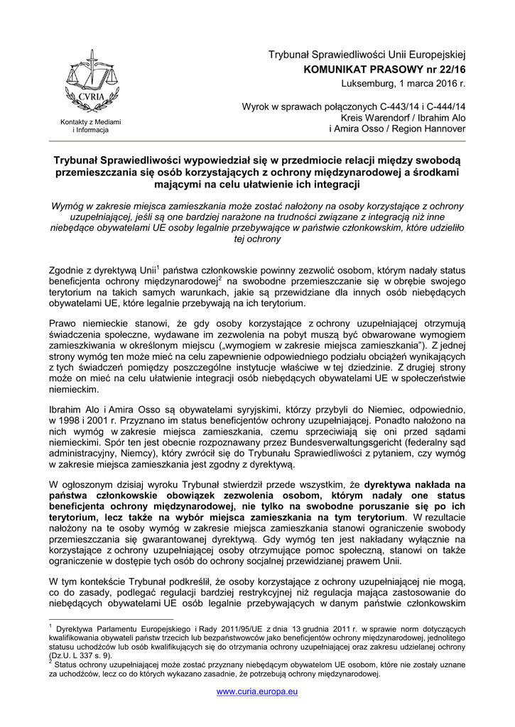 Trybunał Sprawiedliwości Unii Europejskiej KOMUNIKAT PRASOWY nr 22/16 Luksemburg, 1 marca 2016 r. Kontakty z Mediami i Informacja Wyrok w sprawach połączonych C-443/14 i C-444/14 Kreis Warendorf / Ibrahim Alo i Amira Osso / Region Hannover Trybunał Sprawiedliwości wypowiedział się w przedmiocie relacji między swobodą przemieszczania się osób korzystających z ochrony międzynarodowej a środkami mającymi na celu ułatwienie ich integracji Wymóg w zakresie miejsca zamieszkania może zostać nałożony na osoby korzystające z ochrony uzupełniającej, jeśli są one bardziej narażone na trudności związane z integracją niż inne niebędące obywatelami UE osoby legalnie przebywające w państwie członkowskim, które udzieliło tej ochrony Zgodnie z dyrektywą Unii1 państwa członkowskie powinny zezwolić osobom, którym nadały status beneficjenta ochrony międzynarodowej2 na swobodne przemieszczanie się w obrębie swojego terytorium na takich samych warunkach, jakie są przewidziane dla innych osób niebędących obywatelami UE, które legalnie przebywają na ich terytorium. Prawo niemieckie stanowi, że gdy osoby korzystające z ochrony uzupełniającej otrzymują świadczenia społeczne, wydawane im zezwolenia na pobyt muszą być obwarowane wymogiem zamieszkiwania w określonym miejscu („wymogiem w zakresie miejsca zamieszkania”). Z jednej strony wymóg ten może mieć na celu zapewnienie odpowiedniego podziału obciążeń wynikających z tych świadczeń pomiędzy poszczególne instytucje właściwe w tej dziedzinie. Z drugiej strony może on mieć na celu ułatwienie integracji osób niebędących obywatelami UE w społeczeństwie niemieckim. Ibrahim Alo i Amira Osso są obywatelami syryjskimi, którzy przybyli do Niemiec, odpowiednio, w 1998 i 2001 r. Przyznano im status beneficjentów ochrony uzupełniającej. Ponadto nałożono na nich wymóg w zakresie miejsca zamieszkania, czemu sprzeciwiają się oni przed sądami niemieckimi. Spór ten jest obecnie rozpoznawany przez Bundesverwaltungsgericht (federalny sąd administracyjny, Niemcy), który zwrócił się do Trybunału Sprawiedliwości z pytaniem, czy wymóg w zakresie miejsca zamieszkania jest zgodny z dyrektywą. W ogłoszonym dzisiaj wyroku Trybunał stwierdził przede wszystkim, że dyrektywa nakłada na państwa członkowskie obowiązek zezwolenia osobom, którym nadały one status beneficjenta ochrony międzynarodowej, nie tylko na swobodne poruszanie się po ich terytorium, lecz także na wybór miejsca zamieszkania na tym terytorium. W rezultacie nałożony na te osoby wymóg w zakresie miejsca zamieszkania stanowi ograniczenie swobody przemieszczania się gwarantowanej dyrektywą. Gdy wymóg ten jest nakładany wyłącznie na korzystające z ochrony uzupełniającej osoby otrzymujące pomoc społeczną, stanowi on także ograniczenie w dostępie tych osób do ochrony socjalnej przewidzianej prawem Unii. W tym kontekście Trybunał podkreślił, że osoby korzystające z ochrony uzupełniającej nie mogą, co do zasady, podlegać regulacji bardziej restrykcyjnej niż regulacja mająca zastosowanie do niebędących obywatelami UE osób legalnie przebywających w danym państwie członkowskim 1 Dyrektywa Parlamentu Europejskiego i Rady 2011/95/UE z dnia 13 grudnia 2011 r. w sprawie norm dotyczących kwalifikowania obywateli państw trzecich lub bezpaństwowców jako beneficjentów ochrony międzynarodowej, jednolitego statusu uchodźców lub osób kwalifikujących się do otrzymania ochrony uzupełniającej oraz zakresu udzielanej ochrony (Dz.U. L 337 s. 9). 2 Status ochrony uzupełniającej może zostać przyznany niebędącym obywatelom UE osobom, które nie zostały uznane za uchodźców, lecz co do których wykazano zasadnie, że potrzebują ochrony międzynarodowej. www.curia.europa.eu w odniesieniu do wyboru miejsca zamieszkania i regulacji mającej zastosowanie do obywateli tego państwa w odniesieniu do pomocy społecznej. Jednakże w ocenie Trybunału możliwe jest nałożenie wymogu w zakresie miejsca zamieszkania wyłącznie na osoby korzystające z ochrony uzupełniającej, jeśli nie znajdują się one, w świetle celu zamierzonego przez rozpatrywane uregulowanie krajowe, w sytuacji obiektywnie porównywalnej do sytuacji niebędących obywatelami UE osób, które legalnie przebywają w danym państwie członkowskim i obywateli tego państwa. Następnie Trybunał przyznał, że poruszanie się przez osoby korzystające ze świadczeń społecznych lub ich nierównomierne skupienie w obrębie terytorium państwa członkowskiego może pociągać za sobą nieodpowiedni podział obciążenia finansowego związanego z tymi świadczeniami pomiędzy poszczególne instytucje właściwe w tej dziedzinie. Jednakże taki nierównomierny podział obciążeń nie jest szczególnie związany z tym, że osoby otrzymujące te świadczenia społeczne są ewentualnie objęte ochroną uzupełaniającą. W tych okolicznościach dyrektywa stoi na przeszkodzie nakładaniu wymogu w zakresie miejsca zamieszkania wyłącznie na osoby korzystające ze statusu ochrony uzupełniającej w celu osiągnięcia odpowiedniego podziału obciążeń związanych z odnośnymi świadczeniami. Trybunał zauważył natomiast, że do sądu niemieckiego należy ustalenie, czy otrzymujące pomoc społeczną osoby korzystające z ochrony uzupełniającej są bardziej narażone na trudności związane z integracją niż inne niebędące obywatelami UE osoby, które legalnie przebywają w Niemczech i otrzymują pomoc społeczną. W razie, gdy te dwie kategorie osób nie znajdują się w sytuacji obiektywnie porównywalnej w świetle celu polegającego na ułatwieniu integracji osób niebędących obywatelami UE w Niemczech, dyrektywa nie stoi na przeszkodzie temu, by osoby korzystające ze statusu ochrony uzupełniającej były objęte wymogiem w zakresie miejsca zamieszkania w celu promowania ich integracji, i to nawet jeśli wym