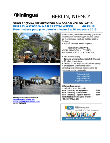 BERLIN, NIEMCY SZKOŁA JĘZYKA NIEMIECKIEGO DLA DOROSŁYCH OD LAT 16 KURS DLA OSÓB W NAJLEPSZYM WIEKU… 40 PLUS Kurs możesz podjąć w okresie między 5 a 30 września 2016 Komfortowo, bo w bardzo małej grupie i w towarzystwie rówieśniczym możesz uczyć się niemieckiego i dobrze spędzić czas w Berlinie. A JESIEŃ ZAWSZE BYWA PIĘKNA… POZIOM STARTOWY B1 MINIMUM POBYTU - TYDZIEŃ MAKSIMUM POBYTU - 4 TYGODNIE test kwalifikacyjny Zajęcia w małych grupach 3-5 osób 20 lekcji tygodniowo Dostęp do iOL czyli portalu edukacyjnego świadectwo ukończenia kursu Zajęcia popołudniowe dostosowane do wymagań grupy za dopłatą Tydzień €330 2 tygodnie €580 3 tygodnie €880 4 tygodnie €1170 Więcej informacji/rezerwacje [email protected] [email protected] tel: 22 8471487 +Zakwaterowanie: w rodzinie / koszt tygodnia pokój 1 osobowy bez wyżywienia pokój 1 osobowy ze śniadaniem pokój 1 osobowy , 2 posiłki dziennie hotele/hostele informacje na życzenie + REJESTRACJA €45 €160 €200 €240
