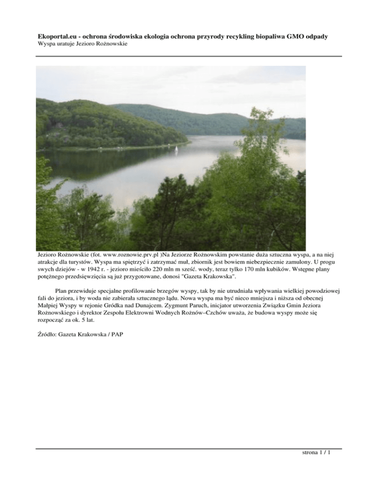 Ekoportal.eu - ochrona środowiska ekologia ochrona przyrody recykling biopaliwa GMO odpady Wyspa uratuje Jezioro Rożnowskie Jezioro Rożnowskie (fot. www.roznowie.prv.pl )Na Jeziorze Rożnowskim powstanie duża sztuczna wyspa, a na niej atrakcje dla turystów. Wyspa ma spiętrzyć i zatrzymać muł, zbiornik jest bowiem niebezpiecznie zamulony. U progu swych dziejów - w 1942 r. - jezioro mieściło 220 mln m sześć. wody, teraz tylko 170 mln kubików. Wstępne plany potężnego przedsięwzięcia są już przygotowane, donosi "Gazeta Krakowska". Plan przewiduje specjalne profilowanie brzegów wyspy, tak by nie utrudniała wpływania wielkiej powodziowej fali do jeziora, i by woda nie zabierała sztucznego lądu. Nowa wyspa ma być nieco mniejsza i niższa od obecnej Małpiej Wyspy w rejonie Gródka nad Dunajcem. Zygmunt Paruch, inicjator utworzenia Związku Gmin Jeziora Rożnowskiego i dyrektor Zespołu Elektrowni Wodnych Rożnów–Czchów uważa, że budowa wyspy może się rozpocząć za ok. 5 lat. Źródło: Gazeta Krakowska / PAP strona 1 / 1