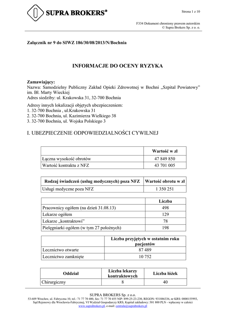 Strona 1 z 10 F334 Dokument chroniony prawem autorskim © Supra Brokers Sp. z o. o. Załącznik nr 9 do SIWZ 186/30/08/2013/N/Bochnia INFORMACJE DO OCENY RYZYKA Zamawiający: Nazwa: Samodzielny Publiczny Zakład Opieki Zdrowotnej w Bochni „Szpital Powiatowy” im. Bł. Marty Wieckiej Adres siedziby: ul. Krakowska 31, 32-700 Bochnia Adresy innych lokalizacji objętych ubezpieczeniem: 1. 32-700 Bochnia , ul.Krakowska 31 2. 32-700 Bochnia, ul. Kazimierza Wielkiego 38 3. 32-700 Bochnia, ul. Wojska Polskiego 3 I. UBEZPIECZENIE ODPOWIEDZIALNOŚCI CYWILNEJ Wartość w zł Łączna wysokość obrotów Wartość kontraktu z NFZ 47 849 850 43 701 005 Rodzaj świadczeń (usług medycznych) poza NFZ Usługi medyczne poza NFZ 1 350 251 Pracownicy ogółem (na dzień 31.08.13) Lekarze ogółem Lekarze „kontraktowi” Pielęgniarki ogółem (w tym 27 położnych) Lecznictwo otwarte Lecznictwo zamknięte Oddział Chirurgiczny Wartość obrotu w zł Liczba 498 129 78 198 Liczba przyjętych w ostatnim roku pacjentów 87 489 10 752 Liczba lekarzy kontraktowych 8 Liczba łóżek 40 SUPRA BROKERS Sp. z o.o. 53-609 Wrocław, ul. Fabryczna 10, tel.: 71 77 70 400, fax: 71 77 70 455 NIP: 899-25-23-230, REGON: 931886336, nr KRS: 0000155993, Sąd Rejonowy dla Wrocławia-Fabrycznej, VI Wydział Gospodarczy KRS, Kapitał zakładowy: 501 800 PLN - wpłacony w całości www.suprabrokers.pl, e-mail: [email protected] Strona 2 z 10 F334 Dokument chroniony prawem autorskim © Supra Brokers Sp. z o. o. Ginekologii i Położnictwa SOR Pediatrii Noworodków Wewnętrzny ZOL Okulistyka jednego dnia Anestezjologia 5 8 4 5 0 0 2 1 47 7 31 25 64 22 4 4 Sposób organizacji opieki lekarskiej podczas dyżurów: Dyżury pełnią lekarze kontraktowi OCENA RYZYKA ZAKAŻEŃ SZPITALNYCH TAK NIE 1 2 3 4 5 6 7 8 9 10 W podmiocie leczniczym działa Zespół d/s. Zakażeń Szpitalnych W podmiocie leczniczym rejestrowane są zakażenia szpitalne wszystkie wybiórczo Liczba stwierdzanych rocznie zakażeń szpitalnych krwiopochodnych (wzw B, wzw C, hiv) gronkowca innych Podmiot leczniczy zgłasza do Sanepid zakażenia szpitalne/choroby zakaźne wszystkie krwiopochodne Podmiot leczniczy posiada centralną sterylizatornię W podmiocie leczniczym używane są sterylizatory narzędzi na suche, gorące powietrze Prowadzona jest wewnętrzna kontrola procesów sterylizacji Testy używane do kontroli procesów sterylizacji i pracy sterylizatorów: wskaźniki fizyczne wydruk komputerowy testy Bowie-Dicka testy paskowe testy zintegrowane testy biologiczne Używane są puszki Schimmelbuscha jako opakowania do sterylizacji Inne opakowania używane do sterylizacji puszki kontenerowe X 0 1 40 X X X X X X X X X X X X SUPRA BROKERS Sp. z o.o. 53-609 Wrocław, ul. Fabryczna 10, tel.: 71 77 70 400, fax: 71 77 70 455 NIP: 899-25-23-230, REGON: 931886336, nr KRS: 0000155993, Sąd Rejonowy dla Wrocławia-Fabrycznej, VI Wydział Gospodarczy KRS, Kapitał zakładowy: 501 800 PLN - wpłacony w całości www.suprabrokers.pl, e-mail: [email protected] Strona 3 z 10 F334 Dokument chroniony prawem autorskim © Supra Brokers Sp. z o. o. rękawy papierowo – foliowe inne 11 12 13 14 18 X Do mycia rąk używane jest mydło w: dozownikach kostkach Do dezynfekcji rąk używany jest środek dezynfekcyjny w dozownikach Cały personel poddawany jest szkoleniom z zakresu zapobiegania infekcjom szkolenie tylko przy przyjęciu do pracy systematycznie W podmiocie leczniczym opracowane są następujące procedury postępowania mycia i dezynfekcji rąk w czasie pobierania krwi 15 16 17 X przy wykonywaniu iniekcji podczas dezynfekcji podczas sterylizacji ze sprzętem endoskopowym z zużytym sprzętem jednorazowym ze skażonym mat. biologicznym Przestrzeganie procedur jest systematycznie kontrolowane Możliwa jest izolacja pacjentów chorych zakaźnie Podmiot leczniczy posiada myjnię do endoskopów półautomatyczną automatyczną sterylizator Cały personel narażony na zakażenie wzw jest zaszczepiony przeciwko żółtaczce typu B (na podstawie dokumentacji w Zakł. Leczniczym) X X X X X X X X X X X X X X X X X X Zakres świadczonych usług medycznych Lecznictwo zamknięte Poradnie specjalistyczne Podstawowa Opieka Zdrowotna Zakład pielęgnacyjno – opiekuńczy Fizykoterapia Diagnostyka specjalistyczna Zespoły wyjazdowe: 4 Apteka szpitalna SUPRA BROKERS Sp. z o.o. 53-609 Wrocław, ul. Fabryczna 10, tel.: 71 77 70 400, fax: 71 77 70 455 NIP: 899-25-23-230, REGON: 931886336, nr KRS: 0000155993, Sąd Rejonowy dla Wrocławia-Fabrycznej, VI Wydział Gospodarczy KRS, Kapitał zakładowy: 501 800 PLN - wpłacony w całości www.suprabrokers.pl, e-mail: [email protected] Strona 4 z 10 F334 Dokument chroniony prawem autorskim © Supra Brokers Sp. z o. o. Transport chorych Zakres świadczonych usług pozamedycznych Prowadzenie pralni dla podmiotów zewnętrznych Usługi gastronomiczne dla podmiotów zewnętrznych Usługi sterylizacji dla podmiotów zewnętrznych Wynajem pomieszczeń Podmiot leczniczy : przygotowuje we własnym zakresie posiłki dla pacjentów prowadzi działalność w budynkach (pomieszczeniach) najmowanych od innych podmiotów przygotowuje w aptece szpitalnej leki robione posiada laboratorium diagnostyczne posiada laboratorium mikrobiologiczne posiada tomograf komputerowy (TK) prowadzi działalność w zakresie doskonalenia zawodowego kadr lekarskich, pielęgniarskich itp. Certyfikaty posiadane przez podmiot leczniczy Certyfikat ISO 9001 Szpital Przyjazny Dziecku Perła Medycyny Akredytacja w trakcie wdrożenia ZARZĄDZANIE RYZYKIEM OC W podmiocie leczniczym funkcjonuje Zespół do spraw minimalizacji ryzyka roszczeń medycznych. W podmiocie leczniczym został powołany Pełnomocnik (nie dotyczy pełnomocnika prawnego) do spraw postępowania z roszczeniem medycznym. W podmiocie leczniczym zastosowane są procedury nadzoru nad roszczeniem: - określania związku przyczynowo – skutkowego roszczenia, - podejmowania prób wycofania roszczenia, - postępowania w celu dop