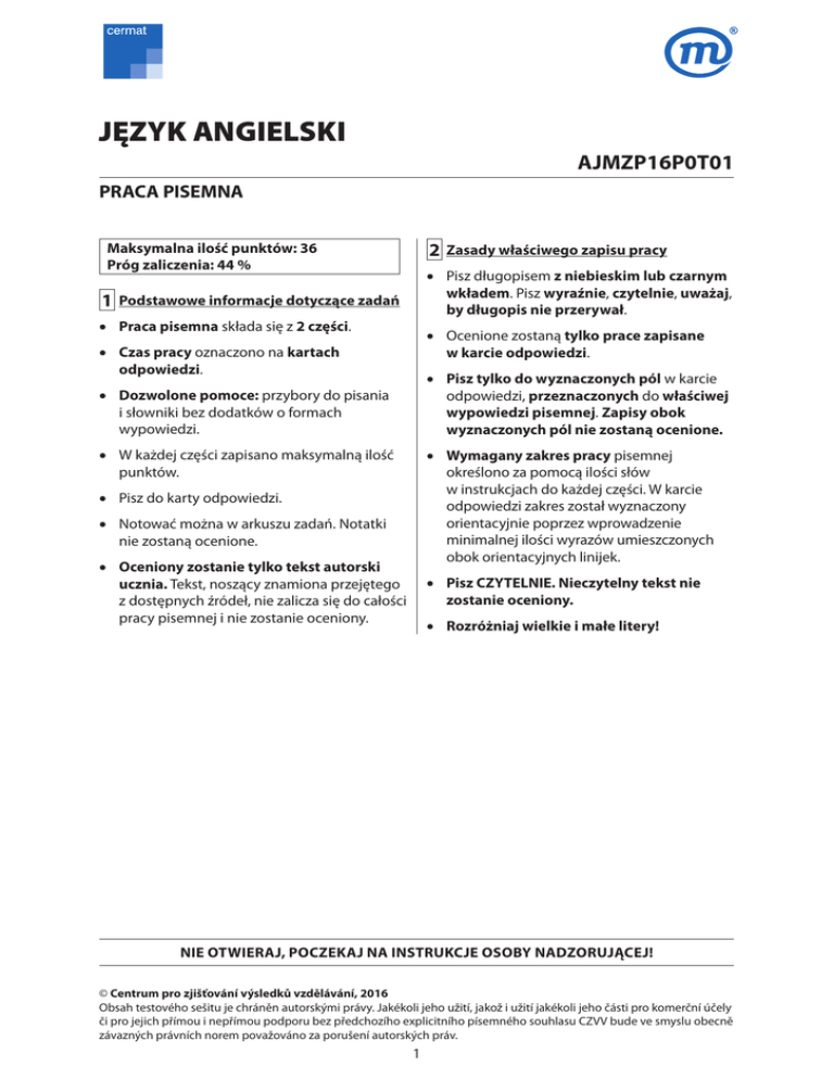 JĘZYK ANGIELSKI AJMZP16P0T01 PRACA PISEMNA Maksymalna ilość punktów: 36 Próg zaliczenia: 44 % 1 2 Zasady właściwego zapisu pracy x Pisz długopisem z niebieskim lub czarnym wkładem. Pisz wyraźnie, czytelnie, uważaj, by długopis nie przerywał. Podstawowe informacje dotyczące zadań x Praca pisemna składa się z 2 części. x Ocenione zostaną tylko prace zapisane w karcie odpowiedzi. x Czas pracy oznaczono na kartach odpowiedzi. x Pisz tylko do wyznaczonych pól w karcie odpowiedzi, przeznaczonych do właściwej wypowiedzi pisemnej. Zapisy obok wyznaczonych pól nie zostaną ocenione. x Dozwolone pomoce: przybory do pisania i słowniki bez dodatków o formach wypowiedzi. x W każdej części zapisano maksymalną ilość punktów. x Wymagany zakres pracy pisemnej określono za pomocą ilości słów w instrukcjach do każdej części. W karcie odpowiedzi zakres został wyznaczony orientacyjnie poprzez wprowadzenie minimalnej ilości wyrazów umieszczonych obok orientacyjnych linijek. x Pisz do karty odpowiedzi. x Notować można w arkuszu zadań. Notatki nie zostaną ocenione. x Oceniony zostanie tylko tekst autorski ucznia. Tekst, noszący znamiona przejętego z dostępnych źródeł, nie zalicza się do całości pracy pisemnej i nie zostanie oceniony. x Pisz CZYTELNIE. Nieczytelny tekst nie zostanie oceniony. x Rozróżniaj wielkie i małe litery! NIE OTWIERAJ, POCZEKAJ NA INSTRUKCJE OSOBY NADZORUJĄCEJ! © Centrum pro zjišťování výsledků vzdělávání, 2016 Obsah testového sešitu je chráněn autorskými právy. Jakékoli jeho užití, jakož i užití jakékoli jeho části pro komerční účely či pro jejich přímou i nepřímou podporu bez předchozího explicitního písemného souhlasu CZVV bude ve smyslu obecně závazných právních norem považováno za porušení autorských práv. 1 1. CZĘŚĆ maks. 24 punktów Niedawno obejrzałeś/-aś film i chcesz o nim poinformować czytelników rubryki kulturalnej szkolnego angielskiego pisma. Napisz artykuł składający się z 120–150 wyrazów, w którym: x p odasz prynajmniej trzy podstawowe informacje o filmie (np. tytuł, gatunek filmowy, reżyseria, obsada); x zwięźle napiszesz, o czym jest film; x napiszesz, co ci się w filmie podobało / nie podobało; x przekażesz, czy film polecasz / nie polecasz czytelnikom i wyjaśnisz, dlaczego. © Centrum pro zjišťování výsledků vzdělávání, 2016 2 2. CZĘŚĆ maks. 12 punktów Twój kolega Brandon, który mówi tylko po angielsku i mieszka w Australii, przyleci do ciebie w przyszłym tygodniu w odwiedziny. Nie możesz jednak osobiście odebrać go na lotnisku. Napisz do Brandona e-mail składający się z 60–70 wyrazów, w którym: x usprawiedliwisz się, że nie możesz po niego przyjechać na lotnisko; x wyjaśnisz, dlaczego nie możesz go na lotnisku odebrać; x poinformujesz, kto odbierze go na lotnisku zamiast ciebie i jak rozpozna tę osobę; x poinformujesz, jak się cieszysz, że niedługo z nim się zobaczysz. © Centrum pro zjišťování výsledků vzdělávání, 2016 3
