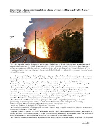 Ekoportal.eu - ochrona środowiska ekologia ochrona przyrody recykling biopaliwa GMO odpady Skutki wypadku na Ukrainie W wyniku wypadku zapaliło się 6 cystern przewożących fosforTysiące Ukraińców znalazły się we wtorek w strefie zagrożenia toksycznego, po tym gdy dzień wcześniej w wyniku wypadku pociągu z fosforem uwolniła się chmura niebezpiecznych oparów. Media i niektórzy przedstawiciele władz na Ukrainie mówią o "drugim Czarnobylu". Do wypadku pociągu towarowego jadącego z Kazachstanu do Polski doszło w poniedziałek po południu w rejonie buskim obwodu lwowskiego. Z torów wypadło i przewróciło się 15 cystern z płynnym żółtym fosforem. Sześć z nich stanęło w płomieniach. Po czterech godzinach strażakom udało się ugasić pożar. Ogień spowodował jednak powstanie chmury toksycznych substancji. Biała toksyczna chmura, przed tym gdy rozpłynęła się w powietrzu, objęła obszar niemal 90 kilometrów kwadratowych wokół wsi Ożydiw - poinformował rzecznik ukraińskiego ministerstwa zdrowia Oleh Sztangret. W rejonie bezpośredniego zagrożenia znalazło się 14 osiedli i łącznie 11 tysięcy ludzi. Po wypadku władze ogłosiły alarm chemiczny w rejonie buskim obwodu lwowskiego i ewakuowały około 900 mieszkańców okolicy - powiedział rzecznik ministerstwa ds. sytuacji nadzwyczajnych Ihor Krol. Tym, którzy odmówili opuszczenia domów zalecono, by pozamykali okna i nie wypuszczali na dwór zwierząt. Z powodu zatrucia bądź oparzenia dróg oddechowych w szpitalach do wtorkowego wieczoru znalazło się 21 osób, wśród nich mieszkańcy regionu i pracownicy pracownicy służb uczestniczących w akcji ratowniczej, głównie strażaków. Ministerstwo obrony podkreśla, że ich życiu nic nie zagraża. Jak informowali przedstawiciele ukraińskiego wojska, silne słońce i temperatura przewyższająca 30 stopni powodowały szybkie wysychanie fosforu, co może być niebezpieczne. Jednak według resortu ds. sytuacji nadzwyczajnych, aktualnie sytuacja jest pod kontrolą i nie ma niebezpieczeństwa. Wciąż nie wiadomo, co było przyczyną wykolejenia się składu. Na miejsce zdarzenia udał się wicepremier Ołeksandr Kuźmuk, który porównał wypadek do katastrofy w elektrowni atomowej w Czarnobylu z 1986 roku. Incydent wywołał w regionie falę paniki. Mieszkańcy Brodów (około 20 kilometrów od Ożydiwu i 90 kilometrów od granicy z Polską) w nocy z poniedziałku na wtorek uciekli z miasta; wielu z tych, którzy zostali, przez cały dzień nosiło maski przeciwgazowe - powiedział AFP miejscowy funkcjonariusz Wołodymyr Adamiec. We Lwowie (około 70 kilometrów od miejsca wypadku) z obawy przed zatruciem oparami rodzice zakazali dzieciom strona 1 / 4 Ekoportal.eu - ochrona środowiska ekologia ochrona przyrody recykling biopaliwa GMO odpady Skutki wypadku na Ukrainie wychodzenia z domów. Sąsiadujące z regionem kraje - Rumunia, Węgry i Polska - zaangażowały się w wymianę informacji dotyczących wypadku. Choć zanieczyszczenie nie przedostało się poza granice Ukrainy, w Bukareszcie ogłoszono stan pogotowia. Pomiary zanieczyszczeń atmosfery prowadzi także Białoruś. Dawka śmiertelna fosforu wynosi 0,10 grama. Żółty fosfor powoduje m.in. marskość wątroby. Jaskrawożółty kolor płonącego fosforu strona 2 / 4 Ekoportal.eu - ochrona środowiska ekologia ochrona przyrody recykling biopaliwa GMO odpady Skutki wypadku na Ukrainie Uszkodzeniu uległo 15 cystern przewożących płynny fosfor W akcji gaśniczej uczestniczyło wiele jednostek straży i obrony chemicznej Płonące cysterny udało się ugasić po 4 godzinach akcji strona 3 / 4 Ekoportal.eu - ochrona środowiska ekologia ochrona przyrody recykling biopaliwa GMO odpady Skutki wypadku na Ukrainie Źródło: PAP Zdjęcia: AFP strona 4 / 4