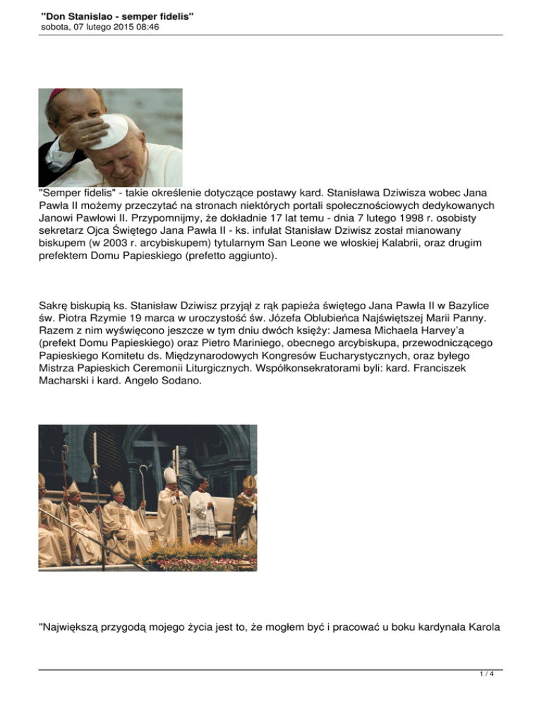 "Don Stanislao - semper fidelis" sobota, 07 lutego 2015 08:46 "Semper fidelis" - takie określenie dotyczące postawy kard. Stanisława Dziwisza wobec Jana Pawła II możemy przeczytać na stronach niektórych portali społecznościowych dedykowanych Janowi Pawłowi II. Przypomnijmy, że dokładnie 17 lat temu - dnia 7 lutego 1998 r. osobisty sekretarz Ojca Świętego Jana Pawła II - ks. infułat Stanisław Dziwisz został mianowany biskupem (w 2003 r. arcybiskupem) tytularnym San Leone we włoskiej Kalabrii, oraz drugim prefektem Domu Papieskiego (prefetto aggiunto). Sakrę biskupią ks. Stanisław Dziwisz przyjął z rąk papieża świętego Jana Pawła II w Bazylice św. Piotra Rzymie 19 marca w uroczystość św. Józefa Oblubieńca Najświętszej Marii Panny. Razem z nim wyświęcono jeszcze w tym dniu dwóch księży: Jamesa Michaela Harvey’a (prefekt Domu Papieskiego) oraz Pietro Mariniego, obecnego arcybiskupa, przewodniczącego Papieskiego Komitetu ds. Międzynarodowych Kongresów Eucharystycznych, oraz byłego Mistrza Papieskich Ceremonii Liturgicznych. Współkonsekratorami byli: kard. Franciszek Macharski i kard. Angelo Sodano. "Największą przygodą mojego życia jest to, że mogłem być i pracować u boku kardynała Karola 1/4 "Don Stanislao - semper fidelis" sobota, 07 lutego 2015 08:46 Wojtyły, a potem Papieża Jana Pawła II przez trzydzieści dziewięć lat. Wszystko zaczęło się prozaicznie pewnego dnia w 1966 roku, kiedy poprosił mnie, bym został jego sekretarzem. Miałem wtedy dwadzieścia siedem lat. Nie mogłem przypuszczać, że przez kilkadziesiąt lat, dzień po dniu, będę świadkiem życia, pracy, modlitwy i świętości człowieka, który wyrósł na jednego z wielkich, duchowych liderów współczesnego świata" mówił 19 lutego 2010 r. kard. Stanisław Dziwisz, w przemówieniu na Międzynarodowym Kongresie "Legado De Juan Pablo II El Magno!" w Bogocie. Stanisław Dziwisz poznał Karola Wojtyłę na pierwszym roku Wyższego Seminarium Duchownego w Krakowie, gdy uczestniczył w wykładach Wojtyły "Wstęp do filozofii". Z rąk biskupa Wojtyły 23 czerwca 1963 przyjął święcenia kapłańskie. 8 października 1966 został kapelanem arcybiskupa Wojtyły, a gdy Metropolita Krakowski został papieżem - jego osobistym sekretarzem. Prawie czterdzieści lat towarzyszył Ojcu świętemu w posłudze apostolskiej. Papieski sekretarz był właściwie „całym biurem” Jana Pawła II, jego prawą ręką, doradcą i powiernikiem. Jan Paweł II całkowicie polegał na jego lojalności i dyskrecji, gdy chodzi o prowadzenie spraw związanych z pontyfikatem. Niezwykle oddany i wierny, towarzyszył papieżowi zawsze i wszędzie: we wszystkich podróżach zagranicznych, po Włoszech i w odwiedzinach parafii rzymskich, podczas środowych audiencji ogólnych i niezliczonych uroczystości w Bazylice św. Piotra i na Placu św. Piotra, podczas kilku tysięcy spotkań i ceremonii liturgicznych w Watykanie; podczas spotkań oficjalnych i prywatnych, rozmów z głowami państw, wszystkich pielgrzymek, a także rekreacji. Z oddaniem troszczył się o komfort i potrzeby Ojca Świętego. W sposób dyskretny pomagał i wpierał nawet w najdrobniejszych i najzwyklejszych czynnościach: podaniu cieplejszego ubrania czy wydrukowanego przemówienia, przypomnienia nazwiska zaproszonego gościa, podania ręki. Cieszył się całkowitym zaufaniem Papieża. Razem też jeździli na nartach, modlili się oraz przeżywali chwile radosne i tragiczne. To na ręce swego osobistego sekretarza upadł Jan Paweł II, raniony przez zamachowca 13 maja 1981 r. Jego opanowanie i przytomność umysłu sprawiła, że tuż po zamachu Jan Paweł II został szybko przetransportowany do Polikliniki Gemelli. 2/4 "Don Stanislao - semper fidelis" sobota, 07 lutego 2015 08:46 Ks. Stanisław Dziwisz podczas pontyfikatu świętego Jana Pawła II był jedną z najważniejszych osobistości w Watykanie. Jako jedyny nie Włoch był jedną z siedmiu osób mających uprawnienia do stwierdzenia autentyczności papieskiego podpisu. Był obecny przy śmierci Jana Pawła II. Został wykonawcą papieskiego testamentu. "Żyłem u boku Świętego. Inaczej mówiąc, niemal przez czterdzieści lat, codziennie, widziałem z bliska świętość, o której zawsze myślałem, że taka powinna być. Dostrzegałem ją w tym człowieku, w jego tak bardzo głębokim, tak pełnym tajemnicy kontakcie, jaki miał z Bogiem. W jego głębokiej, a zarazem przejrzystej wierze. W jego odwadze, z jaką świadczył o prawdzie Chrystusa i wartości życia. I w jego miłości, z jaką zbliżał się do każdego człowieka, szanując jego godność. Widziałem świętość z bliska. Widziałem świętość zwyczajną, wpisaną w codzienność, w obowiązku i trudy każdego dnia, w spotkania z ludźmi z całego świata, w wielkie publiczne ceremonie, a także w strzeżone zazdrośnie chwile osobistego życia duchowego. Później, po latach, widziałem świętość zaznaczoną nieustannie krzyżem, jakim zresztą było całe życie Karola Wojtyły. Widziałem świętość graniczącą z heroizmem". - mówił kard. Stanisław Dziwisz w rozmowie z Gian Franco Svidercoschim. 3/4 "Don Stanislao - semper fidelis" sobota, 07 lutego 2015 08:46 Obecnie się, następnym by nauczanie pokoleniom. Krakowie, i utworzenia całe Krakowski Stąd które 2 realizuje stycznia kardynał 2006 te Stanisław zadania. papieża powołał Dziwisz Jana do istnienia oprócz Pawła "Centrum II pasterskiej było przekazywane Jana posługi troszczy "Nie "Po decyzji Kościoła Wielkiemu Jego myślą Bożego, pogrzebie wraz Bożego tworząc gotowość nas wielu wszystkich" zosobę oIItym dotyczącej się!" w tych, Centrum krakowskiego miesiącach w dzielenia Ojca życiu Rodakowi, znakiem wierności wraz wktórzy Krakowie. Świętego Kościoła - „Nie zmówił całym ze zamknięcia przyjdą przemyśleń ale Jego lękajcie mną idziedzictwo abp ludzi ipodmuch nade duchowym 