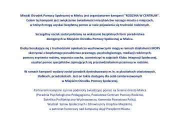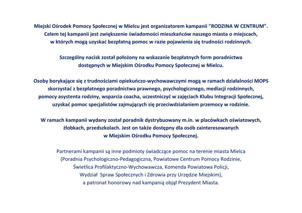 Miejski Ośrodek Pomocy Społecznej w Mielcu jest organizatorem kampanii "RODZINA W CENTRUM". Celem tej kampanii jest zwiększenie świadomości mieszkańców naszego miasta o miejscach, w których mogą uzyskać bezpłatną pomoc w razie pojawienia się trudności rodzinnych. Szczególny nacisk został położony na wskazanie bezpłatnych form poradnictwa dostępnych w Miejskim Ośrodku Pomocy Społecznej w Mielcu. Osoby borykające się z trudnościami opiekuńczo-wychowawczymi mogą w ramach działalności MOPS skorzystać z bezpłatnego poradnictwa prawnego, psychologicznego, mediacji rodzinnych, pomocy asystenta rodziny, wsparcia coacha, uczestniczyć w zajęciach Klubu Integracji Społecznej, uzyskać pomoc specjalistów zajmujących się przeciwdziałaniem przemocy w rodzinie. W ramach kampanii wydany został poradnik dystrybuowany m.in. w placówkach oświatowych, żłobkach, przedszkolach. Jest on także dostępny dla osób zainteresowanych w Miejskim Ośrodku Pomocy Społecznej. Partnerami kampanii są inne podmioty świadczące pomoc na terenie miasta Mielca (Poradnia Psychologiczno-Pedagogiczna, Powiatowe Centrum Pomocy Rodzinie, Świetlica Profilaktyczno-Wychowawcza, Komenda Powiatowa Policji, Wydział Spraw Społecznych i Zdrowia przy Urzędzie Miejskim), a patronat honorowy nad kampanią objął Prezydent Miasta.