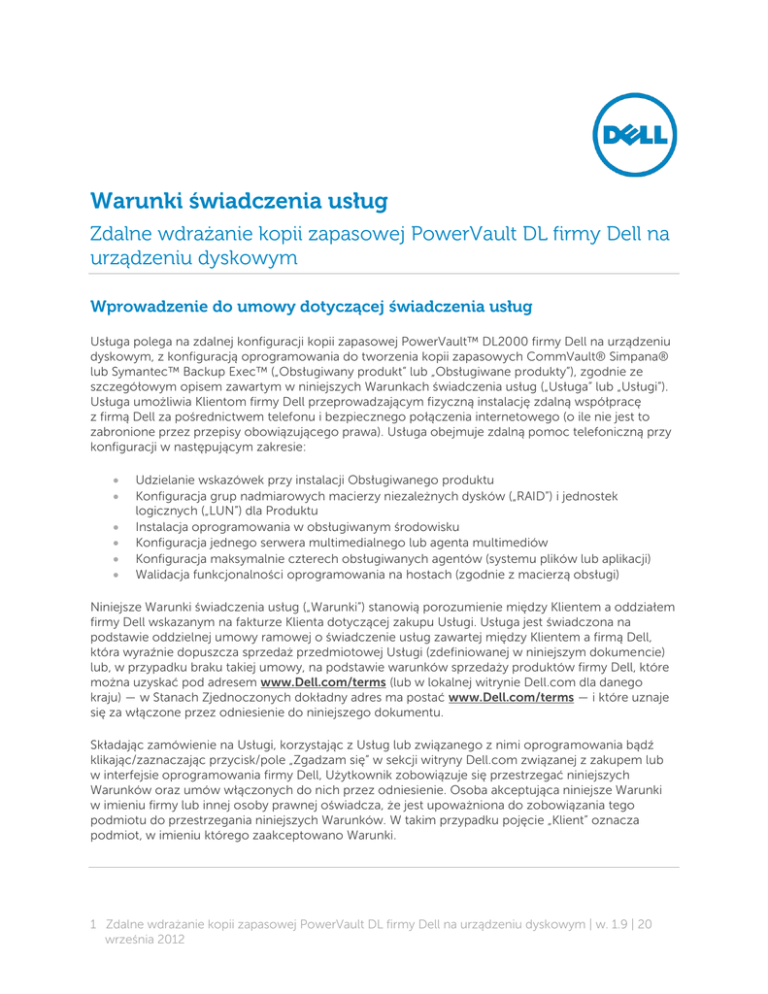 Warunki świadczenia usług Zdalne wdrażanie kopii zapasowej PowerVault DL firmy Dell na urządzeniu dyskowym Wprowadzenie do umowy dotyczącej świadczenia usług Usługa polega na zdalnej konfiguracji kopii zapasowej PowerVault™ DL2000 firmy Dell na urządzeniu dyskowym, z konfiguracją oprogramowania do tworzenia kopii zapasowych CommVault® Simpana® lub Symantec™ Backup Exec™ („Obsługiwany produkt” lub „Obsługiwane produkty”), zgodnie ze szczegółowym opisem zawartym w niniejszych Warunkach świadczenia usług („Usługa” lub „Usługi”). Usługa umożliwia Klientom firmy Dell przeprowadzającym fizyczną instalację zdalną współpracę z firmą Dell za pośrednictwem telefonu i bezpiecznego połączenia internetowego (o ile nie jest to zabronione przez przepisy obowiązującego prawa). Usługa obejmuje zdalną pomoc telefoniczną przy konfiguracji w następującym zakresie: Udzielanie wskazówek przy instalacji Obsługiwanego produktu Konfiguracja grup nadmiarowych macierzy niezależnych dysków („RAID”) i jednostek logicznych („LUN”) dla Produktu Instalacja oprogramowania w obsługiwanym środowisku Konfiguracja jednego serwera multimedialnego lub agenta multimediów Konfiguracja maksymalnie czterech obsługiwanych agentów (systemu plików lub aplikacji) Walidacja funkcjonalności oprogramowania na hostach (zgodnie z macierzą obsługi) Niniejsze Warunki świadczenia usług („Warunki”) stanowią porozumienie między Klientem a oddziałem firmy Dell wskazanym na fakturze Klienta dotyczącej zakupu Usługi. Usługa jest świadczona na podstawie oddzielnej umowy ramowej o świadczenie usług zawartej między Klientem a firmą Dell, która wyraźnie dopuszcza sprzedaż przedmiotowej Usługi (zdefiniowanej w niniejszym dokumencie) lub, w przypadku braku takiej umowy, na podstawie warunków sprzedaży produktów firmy Dell, które można uzyskać pod adresem www.Dell.com/terms (lub w lokalnej witrynie Dell.com dla danego kraju) — w Stanach Zjednoczonych dokładny adres ma postać www.Dell.com/terms — i które uznaje się za włączone przez odniesienie do niniejszego dokumentu. Składając zamówienie na Usługi, korzystając z Usług lub związanego z nimi oprogramowania bądź klikając/zaznaczając przycisk/pole „Zgadzam się” w sekcji witryny Dell.com związanej z zakupem lub w interfejsie oprogramowania firmy Dell, Użytkownik zobowiązuje się przestrzegać niniejszych Warunków oraz umów włączonych do nich przez odniesienie. Osoba akceptująca niniejsze Warunki w imieniu firmy lub innej osoby prawnej oświadcza, że jest upoważniona do zobowiązania tego podmiotu do przestrzegania niniejszych Warunków. W takim przypadku pojęcie „Klient” oznacza podmiot, w imieniu którego zaakceptowano Warunki. 1 Zdalne wdrażanie kopii zapasowej PowerVault DL firmy Dell na urządzeniu dyskowym | w. 1.9 | 20 września 2012 Zakres umowy dotyczącej świadczenia usług Kod SKU usługi Zobacz Dodatek A Usługa obejmuje następujące główne etapy: • Planowanie: 1. Uzyskanie i przegląd wymagań dotyczących środowiska i gotowości technicznej. 2. Przejrzenie niniejszych Warunków świadczenia usług w celu zapoznania się z zakresem prac. 3. Sprawdzenie, czy istniejące hosty spełniają minimalne wymagania dotyczące sprzętu i oprogramowania. 4. Walidacja środowiska sprzętu i oprogramowania. 5. Utworzenie pełnej mapy urządzeń do tworzenia kopii zapasowych na taśmie i na dysku, przyłączonych do hosta kopii zapasowej. 6. Zapewnienie zdalnego dostępu do wszystkich klientów. 7. Wykonanie czynności z listy kontrolnej gotowości: a. Zwykłe i odwrotne rozpoznawanie nazw. b. Powiązanie karty sieciowej z hostem kopii zapasowej, skonfigurowane jako pierwsze w kolejności wiązania. c. Odpowiednie dane kontaktowe na wypadek, gdyby do konfiguracji sieci lub hosta potrzebne były dodatkowe informacje. d. Istniejące zasady zapory (o ile istnieją). e. Konfiguracja zapory w oprogramowaniu CommVault i Backup Exec. f. Nazwy i adresy IP hosta kopii zapasowej oraz przyłączonych do niego klientów. g. Identyfikacja lokalizacji podstawowej kopii zapasowej DR. h. Dostęp RMU do biblioteki taśm firmy Dell. i. Sprawdzenie przepustowości sieci. j. Ocena wymagań w zakresie miejsca do magazynowania. i. Identyfikacja bibliotek magnetycznych. ii. Skonfigurowanie i sformatowanie magazynu (w razie potrzeby). iii. Dostępność wystarczającej ilości zatwierdzonych nośników taśmowych. iv. Zgodność sprzętu biblioteki. k. Identyfikacja dostępności zasobów systemowych dla harmonogramów zadań. l. Pobranie plików nośnika instalacyjnego i najnowszych dodatków Service Pack. m. Przeprowadzenie rejestracji licencji na oprogramowanie do tworzenia kopii zapasowych. 8. Zaplanowanie świadczenia Usługi z Klientem. • Wdrożenie: 1. Wykonanie czynności kreatora wstępnej konfiguracji systemu. 2. W razie potrzeby zainstalowanie krytycznych poprawek lub poprawek oprogramowania do tworzenia kopii zapasowych. 3. Połączenie się i załadowanie odpowiednich sterowników magazynu taśmowego (w razie potrzeby). 4. W razie potrzeby otwarcie konsoli zarządzania oprogramowaniem do tworzenia kopii zapasowych i skonfigurowanie magazynu dyskowego. 5. Aktywacja podstawowych zasad deduplikacji. 6. Skonfigurowanie oprogramowania do tworzenia kopii zapasowych według projektu: i. Zainstalowanie agentów zdalnego systemu plików lub aplikacji. 2 Zdalne wdrażanie kopii zapasowej PowerVault DL firmy Dell na urządzeniu dyskowym | w. 1.9 | 20 września 2011 ii. Zastosowanie aktualnych wersji poprawek i odpowiednich poprawek hot fix do całości oprogramowania objętego instalacją zdalną. 7. W razie potrzeby skonfigurowanie zasad testowania magazynu. • Testowanie: 1. Sprawdzenie, czy wszyscy klienci zdalni mogą komunikować się z hostem kopii zapasowej. 2. We współpracy z Klientem utworzenie nowego pliku kopii zapasowej klienta pośredniego o rozmiarze co n