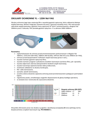 OKULARY OCHRONNE YL – 120H Nd-YAG Okulary ochronne tego typu zawierają filtr o wysokiej gęstości optycznej, który całkowicie blokuje wiązkę laserową. Okulary mogą być używane do pracy z laserami wysokiej mocy. Filtr wytrzymuje uderzenie wiązką laserową o gęstości mocy optycznej 108 W/m2 promieniowania o długości fali 1064nm przez 3 sekundy. Filtr posiada gęstości optyczne >7 w zakresie 1000÷1600nm. Parametry: • • • • • • • • • • • • zoptymalizowane do ochrony ochron przed promieniowaniem podczerwonym o długości fali 1064nm, 1319.5nm (Nd--YAG), 1060nm (Nd-GLASS), 1047nm (Nd-YLF) oraz 2940nm (Er-YAG), (Er ochrona przed bezpośrednim trafieniem wiązki laserowej (przez 3 sek.), wysokie wartości gęstości optycznej filtra, wysokie wartości progowe uszkodzenia światłem laserowym (zarówno filtra, jak i oprawki), wysoka odporność udarowa (bezpośrednie działanie wiązki laserowej), wysoka transmisja zapewnia bardzo dobrą widoczność, możliwość zakładania na okulary korekcyjne, filtr: szkło laminowane, oprawka: plastik laminowany, szczelna osłona okularów zapewnia ochronę przed promieniowaniem padającym pod każdym kątem, regulowany pasek, umożliwiający wygodne dopasowanie dopasowanie do głowy każdego operatora, w zestawie etui i ściereczka do czyszczenia c okularów. Stopnie ochrony (EN 207): 1000-1350nm 1350nm L7 2940nm L2 2940nm L4 DIR D I Wszystkie oferowane przez nas okulary są zgodne z dyrektywą europejską CE oraz spełniają normy bezpieczeństwa urządzeń laserowych wg. PN-EN60825-1.