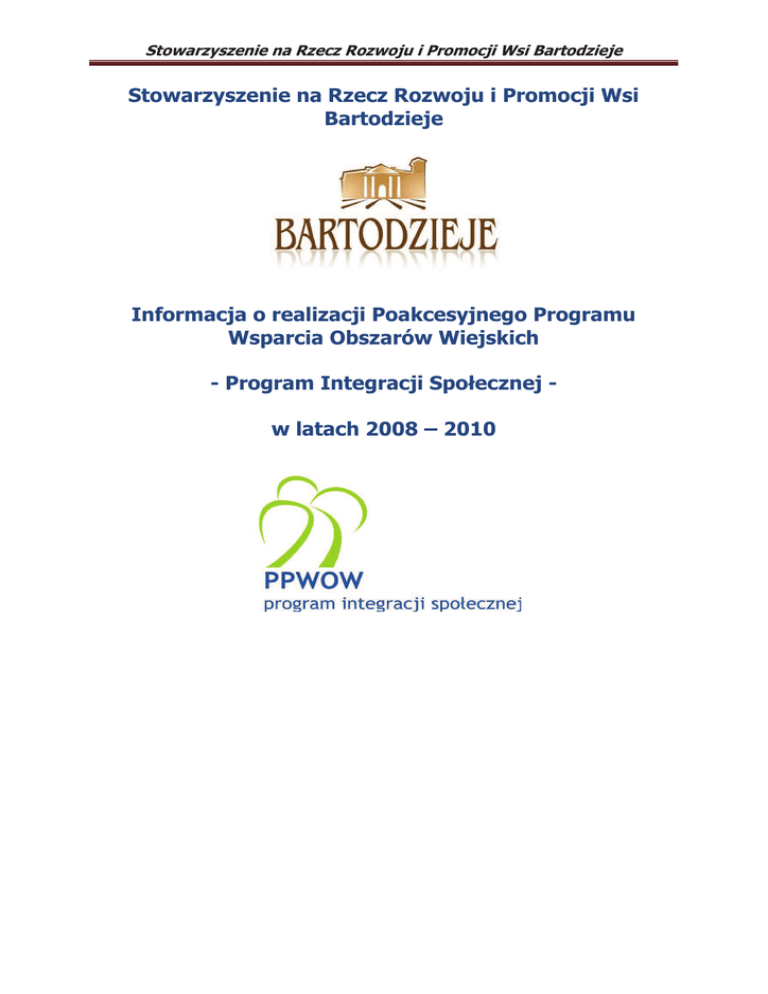 Stowarzyszenie na Rzecz Rozwoju i Promocji Wsi Bartodzieje Stowarzyszenie na Rzecz Rozwoju i Promocji Wsi Bartodzieje Informacja o realizacji Poakcesyjnego Programu Wsparcia Obszarów Wiejskich - Program Integracji Społecznej w latach 2008 – 2010 Stowarzyszenie na Rzecz Rozwoju i Promocji Wsi Bartodzieje Projekt: „Koalicja pokoleń na rzecz promocji sołectwa” Czas trwania: VIII 2008 – X 2009 Kwota dotacji: 20 000 zł. Współpraca w realizacji projektu: Publiczna Szkoła Podstawowa w Bartodziejach Przez okres 15 miesięcy realizowane były działania mające na celu integrację mieszkańców. Najważniejsze z nich to organizacja spotkań wiejskich, wydawanie bezpłatnej gazety sołeckiej oraz otwarcie punktu bezpłatnego dostępu do Internetu Odbiorcy: Mieszkańcy wsi Bartodzieje i Olszowa (dzieci, młodzież i osoby dorosłe w tym seniorzy) Stowarzyszenie na Rzecz Rozwoju i Promocji Wsi Bartodzieje Działania: 1. Organizowanie zebrań wiejskich Spotkanie w Wójtem Gminy Jastrzębia – Zdzisławem Karasiem i Przewodniczącym Rady Gminy w Jastrzębi – Cezarym Pietruszewskim (29 października 2008 r.) Stowarzyszenie na Rzecz Rozwoju i Promocji Wsi Bartodzieje Działania: 2. Redagowanie gazety sołeckiej, łączącej współczesne tematy z życia wsi z dawnymi wspomnieniami jej starszych mieszkańców. www.bartodzieje.pl Nr 2/2009 (IV) marzec 2009 NASZA WIEŚ BARTODZIEJE bezpłatna gazeta sołecka wydawana przez Stowarzyszenie na Rzecz Rozwoju i Promocji Wsi Bartodzieje Ukazało się łącznie 7 numerów gazety - w tradycyjnej wersji papierowej (każdy nr w ilości 150 szt.) - w wersji elektronicznej na stronie stowarzyszenia: www.bartodzieje.pl Stowarzyszenie na Rzecz Rozwoju i Promocji Wsi Bartodzieje Działania: 3. Umożliwienie bezpłatnego dostępu do Internetu dla mieszkańców wsi Bartodzieje (pracownia komputerowa w szkole ogólnie dostępna dla mieszkańców). Stowarzyszenie na Rzecz Rozwoju i Promocji Wsi Bartodzieje Działania: 4. Wydanie książeczki „Baśń o Żołędziu” i mapy „Bartodzieje i okolice” Radomska bajkopisarka i poetka, Walentyna Pawelec spotkała się z uczniami szkoły w Bartodziejach. Podczas wizyty dzieci wysłuchały „Baśni o Żołędziu” napisanej specjalnie dla naszej miejscowości. Opowieść osobiście odczytana przez autorkę, bardzo spodobała się młodym słuchaczom, ich zadaniem było wykonanie ilustracji, które ozdobiły książkowe wydanie bajki. Bajka została wydana w nakładzie 300 szt. Mapa wydana we współpracy z wydawnictwem DTP System z Kozienic w nakładzie 1000 szt. Stowarzyszenie na Rzecz Rozwoju i Promocji Wsi Bartodzieje Efekt dodatkowy realizacji zadania: Wzrost integracji mieszkańców wsi Bartodzieje i Olszowa: v Zwiększenie zainteresowania sprawami społecznymi; v Wzrost zainteresowania historią i tradycją; v Wzrost poczucia więzi z Małą Ojczyną; v Chęć dalszego działania na rzecz swojej wsi; v Inicjatywa postania Klubu Seniora Stowarzyszenie na Rzecz Rozwoju i Promocji Wsi Bartodzieje Projekt: „Klub Seniora jako aktywna forma spędzania czasu wolnego” Czas trwania: IX 2009 – XII 2009 Kwota dotacji: 9 000 zł. Współpraca w realizacji projektu: Publiczna Szkoła Podstawowa w Bartodziejach Koordynator projektu: Dorota August – Dyrektor PSP w Bartodziejach. Odbiorcy: Mieszkańcy wsi Bartodzieje i Olszowa (seniorzy) Projekt skierowany był do osób w wieku 55+. Nabór uczestników odbywał się na ogólnych zebraniach wiejskich. Spotkania Klubu odbywały się w szkole w Bartodziejach w odstępach co dwa tygodnie lub częściej w miarę potrzeb. Głównym celem spotkań było stworzenie możliwości osobom starszym integrowania się oraz omawiania problemów tej grupy społecznej. Stowarzyszenie na Rzecz Rozwoju i Promocji Wsi Bartodzieje Działania: 1. Spotkania integracyjne seniorów (m.in. warsztaty rękodzielnicze, kulinarne, muzyczne) oraz spotkania ze specjalistami: psychologiem, lekarzem, pielęgniarką, poświęcone m.in. tematyce odżywiania osób starszych. Stowarzyszenie na Rzecz Rozwoju i Promocji Wsi Bartodzieje Działania: 2. Wyjazdy integracyjne (wycieczki) - wycieczka do ogrodu botanicznego w Powsinie - wycieczka do Krakowa i Łagiewnik - wycieczka do Lichenia
