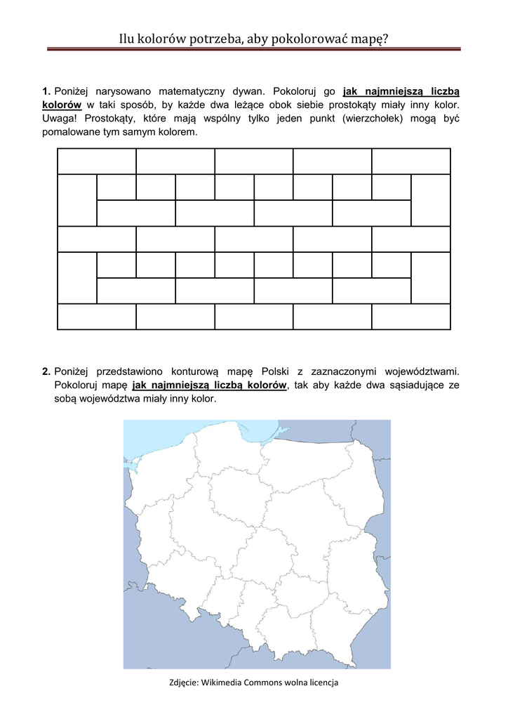 Ilu kolorów potrzeba, aby pokolorować mapę? 1. Poniżej narysowano matematyczny dywan. Pokoloruj go jak najmniejszą liczbą kolorów w taki sposób, by każde dwa leżące obok siebie prostokąty miały inny kolor. Uwaga! Prostokąty, które mają wspólny tylko jeden punkt (wierzchołek) mogą być pomalowane tym samym kolorem. 2. Poniżej przedstawiono konturową mapę Polski z zaznaczonymi województwami. Pokoloruj mapę jak najmniejszą liczbą kolorów, tak aby każde dwa sąsiadujące ze sobą województwa miały inny kolor. Zdjęcie: Wikimedia Commons wolna licencja