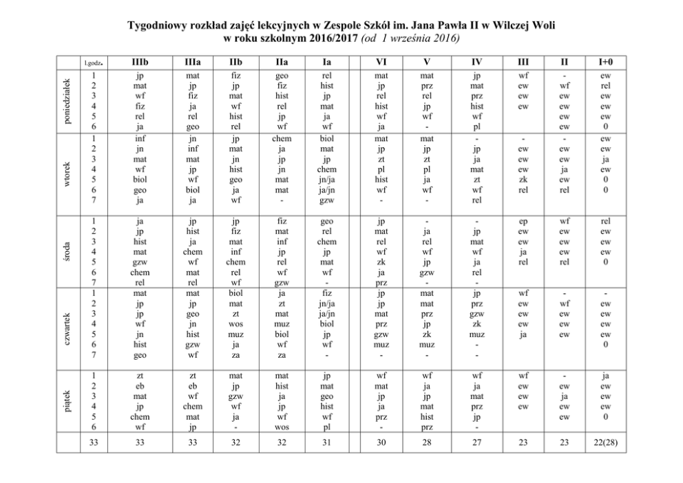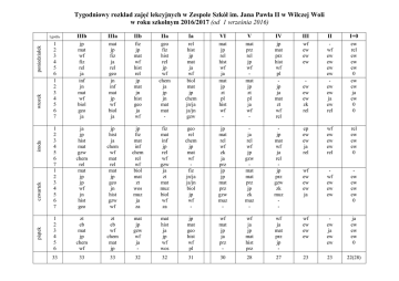 piątek czwartek środa wtorek poniedziałek Tygodniowy rozkład zajęć lekcyjnych w Zespole Szkół im. Jana Pawła II w Wilczej Woli w roku szkolnym 2016/2017 (od 1 września 2016) l.godz. IIIb IIIa IIb IIa Ia VI V IV III II I+0 1 2 3 4 5 6 1 2 3 4 5 6 7 jp mat wf fiz rel ja inf jn mat wf biol geo ja mat jp fiz ja rel geo jn inf mat jp wf biol ja fiz jp mat wf hist rel jp mat jn hist geo ja wf geo fiz hist rel jp wf chem ja jp jn mat mat - rel hist jp mat ja wf biol mat jp chem jn/ja ja/jn gzw mat jp rel hist wf ja mat jp zt pl hist wf - mat prz rel jp wf mat jp zt pl ja wf - jp mat prz hist wf pl jp ja mat zt wf rel wf ew ew ew ew ew ew zk rel wf ew ew ew ew ew ew ja ew rel ew rel ew ew ew 0 ew ew ja ew 0 0 1 2 3 4 5 6 7 1 2 3 4 5 6 7 ja jp hist mat gzw chem rel mat jp jp wf jn hist geo jp hist ja chem wf mat rel mat jp geo jn hist gzw wf jp fiz mat inf chem rel wf biol mat zt wos muz ja za fiz mat inf jp rel wf gzw ja zt mat muz biol wf za geo rel chem jp mat wf fiz jn/ja ja/jn biol jp wf - jp mat rel wf zk ja prz jp jp mat prz gzw muz - ja rel wf jp gzw mat mat prz jp zk muz - jp mat wf ja rel jp prz gzw zk muz - ep ew ew ja rel wf ew ew ew rel rel ew ew ew 0 wf ew ew ew ja wf ew ew ew ew ew ew ew 0 1 2 3 4 5 6 zt eb mat jp chem wf zt eb wf chem mat jp mat jp gzw wf ja - mat hist ja jp wf wos jp mat geo hist wf pl wf mat jp ja prz - wf ja jp mat hist prz wf ja mat prz jp - wf ew ew ew ew ja ew ew ja ew ew ew 0 33 33 33 32 32 31 30 28 27 23 23 22(28)