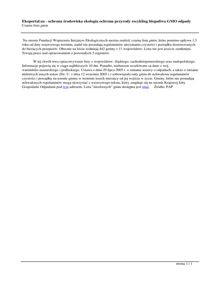 Ekoportal.eu - ochrona środowiska ekologia ochrona przyrody recykling biopaliwa GMO odpady Czarna lista gmin Na stronie Fundacji Wspierania Inicjatyw Ekologicznych można znaleźć czarną listę gmin, które pomimo upływu 1,5 roku od daty ustawowego terminu, nadal nie posiadają regulaminów utrzymania czystości i porządku dostosowanych do bieżących przepisów. Obecnie na liście widnieją 442 gminy z 11 województw. Lista nie jest jeszcze zamknięta. Trwają prace nad opracowaniem z pozostałych 5 regionów. W tej chwili trwa opracowywanie listy z województw: śląskiego, zachodniopomorskiego oraz małopolskiego. Informacje pojawią się w ciągu najbliższych 10 dni. Ponadto, niebawem oczekiwane są dane z woj. warmińsko-mazurskiego i podlaskiego. Ustawa z dnia 29 lipca 2005 r. o zmianie ustawy o odpadach, a także o zmianie niektórych innych ustaw (Dz. U. z dnia 12 września 2005 r.) zobowiązała rady gmin do uchwalenia regulaminów czystości i porządku na terenie gminy w terminie trzech miesięcy od jej wejścia w życie. Gminy, które nie posiadają uchwalonych regulaminów mogą skorzystać z wzorcowego tekstu, który znajduje się na stronie Krajowej Izby Gospodarki Odpadami pod tym adresem. Lista "niesfornych" gmin dostępna jest tutaj. Źródło: PAP strona 1 / 1