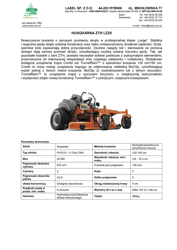LASEL SP. Z O.O. 44-203 RYBNIK UL. MIKOŁOWSKA 77 Sąd Rej. w Gliwicach - KRS 0000163231, kapitał założycielski 50 000 zł, NIP 642-000-04-06 Salon tel. +48 32/42 28 306 Sekretariat tel. +48 32/42 37 712 fax: +48 32/42 29 444 rok założenia 1990 www.lasel.com.pl e-mail: [email protected] HUSQVARNA ZTH LZ25 Nowoczesna kosiarka o zerowym promieniu skrętu w profesjonalnej klasie „Large”. Stabilna i wygodna jazda dzięki solidnej konstrukcji oraz nisko umieszczonemu środkowi ciężkości. Duże, szerokie koła zapewniają dobrą przyczepność. Osobne napędy kół i sterowanie za pomocą dźwigni dają zerowy promień skrętu, umożliwiający szybką zmianę kierunku jazdy. Tak, jak pozostałe kosiarki z serii ZTH, posiada niezwykle solidne podwozie z wytrzymałymi elementami, przeznaczone do intensywnej eksploatacji oraz częstego załadunku i rozładunku. Dodatkowo dostępne urządzenie tnące Combi lub TunnelRam™ o szerokości koszenia 132 cm/155 cm. Combi to nowy rodzaj urządzenia tnącego ze zdejmowaną nakładką BioClip, umożliwiającą wybór jednej z dwóch metod koszenia: BioClip (z rozdrabnaniem) lub z tylnym wyrzutem. TunnelRam™ to urządzenie tnące z wyrzutem bocznym, o zwiększonej wytrzymałości i wydajności dzięki nowej konstrukcji TunnelRam™ z potrójnymi, zwijanymi krawędziami. Parametry techniczne: Silnik Kawasaki Metody koszenia Rozdrabnianie/Wyrzut tylny/Wyrzut boczny Typ silnika FH721V - V-Twin OHV Szerokość robocza 132-155 cm Moc 25 KM Wysokość robocza, min.maks. 3,8 - 15,3 cm Pojemność skokowa cylindra 675 cm³ Prześwit pod podjazdem 150 mm Cylindry 2 Noże 3 Pojemność zbiornika paliwa 43 lit Kółka podporowe 5 Układ kierowniczy Dźwignie sterownicze Okrąg nieskoszonej trawy 0 cm Prędkość jazdy w przód, min.-maks. 0-16 km/h Wymiary dł x sz x wys 208x 157,5 x 109 cm Hamulce Hydrostatyczne/Okładzina klocka hamulcowego Ciężar 380kg