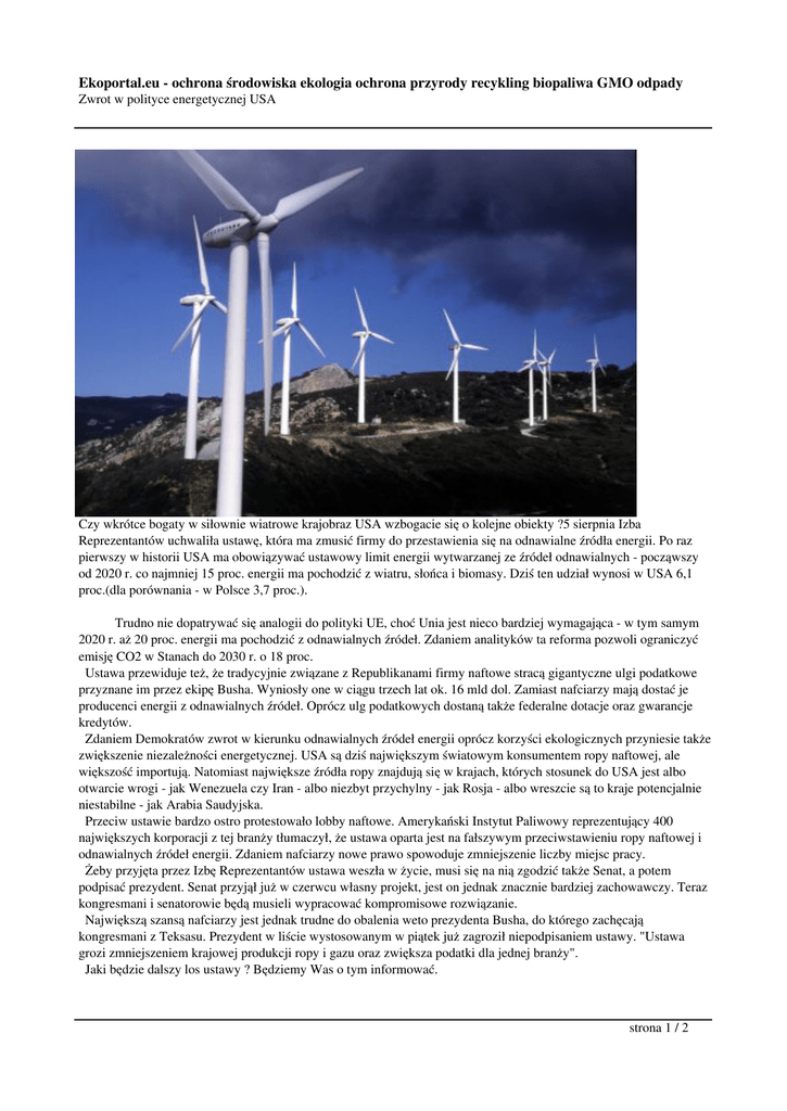 Ekoportal.eu - ochrona środowiska ekologia ochrona przyrody recykling biopaliwa GMO odpady Zwrot w polityce energetycznej USA Czy wkrótce bogaty w siłownie wiatrowe krajobraz USA wzbogacie się o kolejne obiekty ?5 sierpnia Izba Reprezentantów uchwaliła ustawę, która ma zmusić firmy do przestawienia się na odnawialne źródła energii. Po raz pierwszy w historii USA ma obowiązywać ustawowy limit energii wytwarzanej ze źródeł odnawialnych - począwszy od 2020 r. co najmniej 15 proc. energii ma pochodzić z wiatru, słońca i biomasy. Dziś ten udział wynosi w USA 6,1 proc.(dla porównania - w Polsce 3,7 proc.). Trudno nie dopatrywać się analogii do polityki UE, choć Unia jest nieco bardziej wymagająca - w tym samym 2020 r. aż 20 proc. energii ma pochodzić z odnawialnych źródeł. Zdaniem analityków ta reforma pozwoli ograniczyć emisję CO2 w Stanach do 2030 r. o 18 proc. Ustawa przewiduje też, że tradycyjnie związane z Republikanami firmy naftowe stracą gigantyczne ulgi podatkowe przyznane im przez ekipę Busha. Wyniosły one w ciągu trzech lat ok. 16 mld dol. Zamiast nafciarzy mają dostać je producenci energii z odnawialnych źródeł. Oprócz ulg podatkowych dostaną także federalne dotacje oraz gwarancje kredytów. Zdaniem Demokratów zwrot w kierunku odnawialnych źródeł energii oprócz korzyści ekologicznych przyniesie także zwiększenie niezależności energetycznej. USA są dziś największym światowym konsumentem ropy naftowej, ale większość importują. Natomiast największe źródła ropy znajdują się w krajach, których stosunek do USA jest albo otwarcie wrogi - jak Wenezuela czy Iran - albo niezbyt przychylny - jak Rosja - albo wreszcie są to kraje potencjalnie niestabilne - jak Arabia Saudyjska. Przeciw ustawie bardzo ostro protestowało lobby naftowe. Amerykański Instytut Paliwowy reprezentujący 400 największych korporacji z tej branży tłumaczył, że ustawa oparta jest na fałszywym przeciwstawieniu ropy naftowej i odnawialnych źródeł energii. Zdaniem nafciarzy nowe prawo spowoduje zmniejszenie liczby miejsc pracy. Żeby przyjęta przez Izbę Reprezentantów ustawa weszła w życie, musi się na nią zgodzić także Senat, a potem podpisać prezydent. Senat przyjął już w czerwcu własny projekt, jest on jednak znacznie bardziej zachowawczy. Teraz kongresmani i senatorowie będą musieli wypracować kompromisowe rozwiązanie. Największą szansą nafciarzy jest jednak trudne do obalenia weto prezydenta Busha, do którego zachęcają kongresmani z Teksasu. Prezydent w liście wystosowanym w piątek już zagroził niepodpisaniem ustawy. "Ustawa grozi zmniejszeniem krajowej produkcji ropy i gazu oraz zwiększa podatki dla jednej branży". Jaki będzie dalszy los ustawy ? Będziemy Was o tym informować. strona 1 / 2 Ekoportal.eu - ochrona środowiska ekologia ochrona przyrody recykling biopaliwa GMO odpady Zwrot w polityce energetycznej USA Źródło: wnp.pl strona 2 / 2