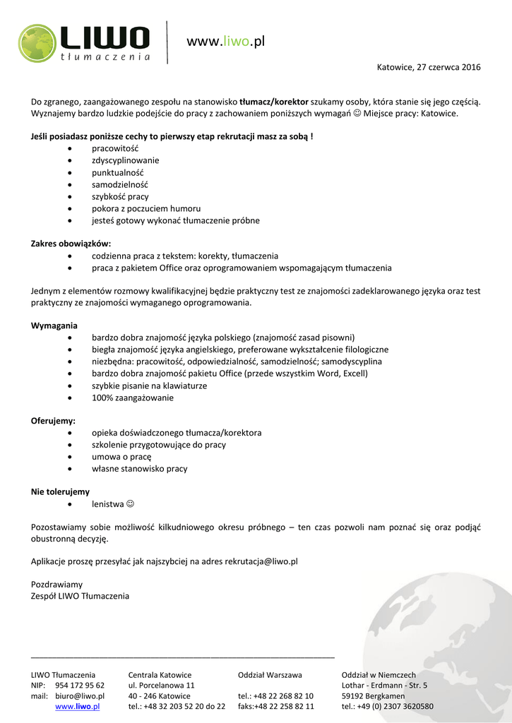 www.liwo.pl Katowice, 27 czerwca 2016 Do zgranego, zaangażowanego zespołu na stanowisko tłumacz/korektor szukamy osoby, która stanie się jego częścią. Wyznajemy bardzo ludzkie podejście do pracy z zachowaniem poniższych wymagań Miejsce pracy: Katowice. Jeśli posiadasz poniższe cechy to pierwszy etap rekrutacji masz za sobą ! pracowitość zdyscyplinowanie punktualność samodzielność szybkość pracy pokora z poczuciem humoru jesteś gotowy wykonać tłumaczenie próbne Zakres obowiązków: codzienna praca z tekstem: korekty, tłumaczenia praca z pakietem Office oraz oprogramowaniem wspomagającym tłumaczenia Jednym z elementów rozmowy kwalifikacyjnej będzie praktyczny test ze znajomości zadeklarowanego języka oraz test praktyczny ze znajomości wymaganego oprogramowania. Wymagania bardzo dobra znajomość języka polskiego (znajomość zasad pisowni) biegła znajomość języka angielskiego, preferowane wykształcenie filologiczne niezbędna: pracowitość, odpowiedzialność, samodzielność; samodyscyplina bardzo dobra znajomość pakietu Office (przede wszystkim Word, Excell) szybkie pisanie na klawiaturze 100% zaangażowanie Oferujemy: opieka doświadczonego tłumacza/korektora szkolenie przygotowujące do pracy umowa o pracę własne stanowisko pracy Nie tolerujemy lenistwa Pozostawiamy sobie możliwość kilkudniowego okresu próbnego – ten czas pozwoli nam poznać się oraz podjąć obustronną decyzję. Aplikacje proszę przesyłać jak najszybciej na adres [email protected] Pozdrawiamy Zespół LIWO Tłumaczenia _______________________________________________________________________ LIWO Tłumaczenia NIP: 954 172 95 62 mail: [email protected] www.liwo.pl Centrala Katowice ul. Porcelanowa 11 40 - 246 Katowice tel.: +48 32 203 52 20 do 22 Oddział Warszawa tel.: +48 22 268 82 10 faks:+48 22 258 82 11 Oddział w Niemczech Lothar - Erdmann - Str. 5 59192 Bergkamen tel.: +49 (0) 2307 3620580
