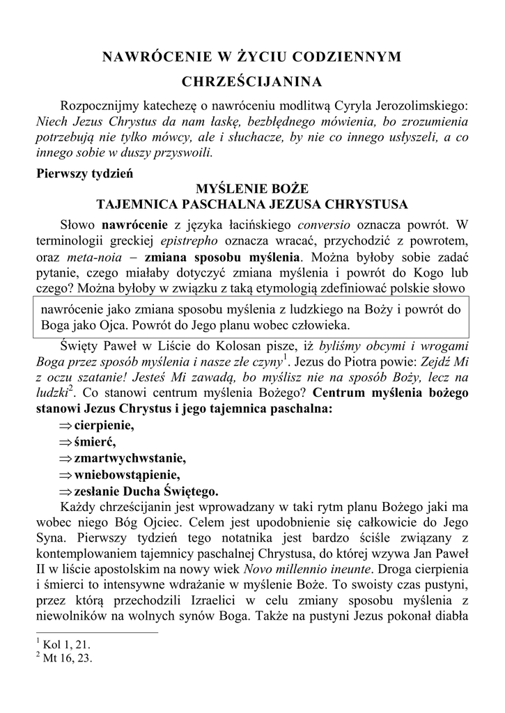 NAWRÓCENIE W ŻYCIU CODZIENNYM CHRZEŚCIJANINA Rozpocznijmy katechezę o nawróceniu modlitwą Cyryla Jerozolimskiego: Niech Jezus Chrystus da nam łaskę, bezbłędnego mówienia, bo zrozumienia potrzebują nie tylko mówcy, ale i słuchacze, by nie co innego usłyszeli, a co innego sobie w duszy przyswoili. Pierwszy tydzień MYŚLENIE BOŻE TAJEMNICA PASCHALNA JEZUSA CHRYSTUSA Słowo nawrócenie z języka łacińskiego conversio oznacza powrót. W terminologii greckiej epistrepho oznacza wracać, przychodzić z powrotem, oraz meta-noia zmiana sposobu myślenia. Można byłoby sobie zadać pytanie, czego miałaby dotyczyć zmiana myślenia i powrót do Kogo lub czego? Można byłoby w związku z taką etymologią zdefiniować polskie słowo nawrócenie jako zmiana sposobu myślenia z ludzkiego na Boży i powrót do Boga jako Ojca. Powrót do Jego planu wobec człowieka. Święty Paweł w Liście do Kolosan pisze, iż byliśmy obcymi i wrogami Boga przez sposób myślenia i nasze złe czyny1. Jezus do Piotra powie: Zejdź Mi z oczu szatanie! Jesteś Mi zawadą, bo myślisz nie na sposób Boży, lecz na ludzki2. Co stanowi centrum myślenia Bożego? Centrum myślenia bożego stanowi Jezus Chrystus i jego tajemnica paschalna: cierpienie, śmierć, zmartwychwstanie, wniebowstąpienie, zesłanie Ducha Świętego. Każdy chrześcijanin jest wprowadzany w taki rytm planu Bożego jaki ma wobec niego Bóg Ojciec. Celem jest upodobnienie się całkowicie do Jego Syna. Pierwszy tydzień tego notatnika jest bardzo ściśle związany z kontemplowaniem tajemnicy paschalnej Chrystusa, do której wzywa Jan Paweł II w liście apostolskim na nowy wiek Novo millennio ineunte. Droga cierpienia i śmierci to intensywne wdrażanie w myślenie Boże. To swoisty czas pustyni, przez którą przechodzili Izraelici w celu zmiany sposobu myślenia z niewolników na wolnych synów Boga. Także na pustyni Jezus pokonał diabła 1 2 Kol 1, 21. Mt 16, 23. Nawrócenie Katecheza 2 jako przedsmak zwycięstwa na Krzyżu. Autor listu do Hebrajczyków powie wprost, że Jezus nauczył się posłuszeństwa przez to co wycierpiał. Zmartwychwstanie to odpowiedź Ojca na całkowite posłuszeństwo, aż po krzyż. Wniebowstąpienie ukazuje, iż Jezus zakończył swoje dzieło na ziemi według planu Ojca, ale ono jest warunkiem koniecznym do zesłania Ducha Świętego, który to dzieło kontynuuje. Chrześcijanin powinien mieć świadomość, że jego powołanie w danym dziele ma swój koniec. To także świadomość, iż chrześcijanin kontynuuje dzieło innych, a inni wchodzą w jego dzieło. Święty Paweł powie: otóż nic nie znaczy ten, który sieje, ani ten, który podlewa, tylko Ten, który daje wzrost – Bóg. Ten, który sieje, i ten, który podlewa, stanowią jedno; według własnego trudu otrzyma należną mu zapłatę. My bowiem jesteśmy pomocnikami Boga3. Tajemnica paschalna kończy się zesłaniem Ducha Świętego, który inauguruje działalność Kościoła. Podobnie po zstąpieniu Ducha Świętego podczas chrztu w wodach Jordanu Jezus rozpoczyna swoją publiczną działalność. Tajemnica zesłania Ducha Świętego z jednej strony wieńczy misterium paschalne. Można powiedzieć, że kończy bezpośrednie przygotowywanie chrześcijanina do jego misji, a z drugiej strony rozpoczyna konkretną misję. Chrześcijanin nie ma wpływu na czas trwania poszczególnych okresów. Ten czas zależy od stopnia zaakceptowania planów Ojca i zmianą serca przez uzdrawianie podświadomości. Do tego wszystkiego potrzebny jest czas i to najczęściej bardzo długi czas, ponieważ człowiek w swojej historii zanurzony jest w czasie. Drugi tydzień NAPEŁNIANIE SIĘ MYŚLENIEM BOŻYM Celem rozważań w drugim tygodniu jest ukazanie w jaki sposób chrześcijanin może napełniać się myśleniem Bożym. Fundamentalnym miejscem ukazującym myślenie Boże jest Słowo Boże. Dlatego tak ważne jest, aby Namiot spotkania był połączony z czytaniem i studiowaniem Słowa Bożego. Potrzebne jest spokojne przeżuwanie Słowa Bożego, aby ono stało się częścią nas. Konieczne jest wielokrotne powracanie do tego samego fragmentu, aby to Słowo w nas pracowało. Jeżeli tracimy wiarę to dlatego, że napełniamy się stale myśleniem świata przez długie oglądanie programów telewizyjnych, reklam i życie w świecie. Potrzebne jest stałe i codzienne przeżuwanie Słowa Bożego oraz postawa nawrócenia. Bez postawy nawrócenia Słowo Boże nie może zmieniać ludzkiego serca. Ważnym elementem naszej formacji są coroczne rekolekcje, aby tam w świetle Słowa 3 1 Kor 3, 7-9. Nawrócenie Katecheza 3 Bożego na modlitwie Jezus zmieniał nasze serce. Rekolekcje dają możliwość oderwania się od świata, aby do niego powrócić i przenikać świat myśleniem Bożym. To jest powołanie ludzi świeckich. Jednakże nie wystarczy tylko pojechać na rekolekcje, konieczne jest codzienne trwanie na modlitwie ze Słowem Bożym. Drugim miejscem, gdzie napełniamy się myśleniem Bożym jest modlitwa. Ważne jest, aby ta modlitwa miała formę Namiotu spotkania, gdzie spotykam się z żywym Bogiem i rozmawiam z Nim twarzą w twarz, jak przyjaciel z przyjacielem. Wraz z systematycznością i wiernością Duch Święty rozwija naszą modlitwę, ale potrzebna jest determinacja wierności. Jeżeli brakuje nam takiej wierności módlmy się o dar wierności i modlitwy, bo to jest dzieło Ducha Świętego w nas. Dar kontemplacji to dar rozwoju w łasce uświęcającej. Trzecim elementem napełniania się myśleniem Bożym jest światło Kościoła. To Kościołowi zostało powierzone strzeżenie interpretacji Słowa Bożego, ukazywanie norm moralnych związanych z Ewangelią. Kościołowi została powierzona troska o człowieka. Przejawia się ona w upominaniu się o godne prawa, o ludzi najsłabszych, w jakiś sposób niepełnosprawnych, bezrobotnych i poczętych, ale jeszcze nienarodzonych. Drogą Kościoła jest konkretny człowiek, każdy cz