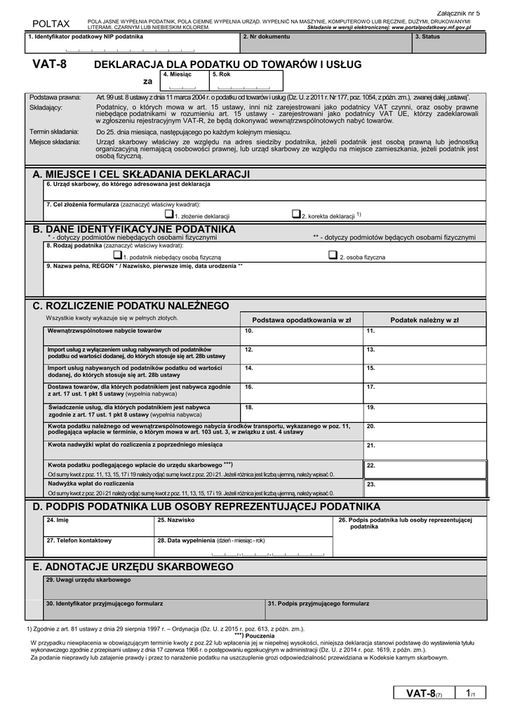 Załącznik nr 5 POLTAX POLA JASNE WYPEŁNIA PODATNIK, POLA CIEMNE WYPEŁNIA URZĄD. WYPEŁNIĆ NA MASZYNIE, KOMPUTEROWO LUB RĘCZNIE, DUŻYMI, DRUKOWANYMI LITERAMI, CZARNYM LUB NIEBIESKIM KOLOREM. Składanie w wersji elektronicznej: www.portalpodatkowy.mf.gov.pl 3. Status 2. Nr dokumentu 1. Identyfikator podatkowy NIP podatnika └────┴────┴────┴────┴────┴────┴────┴────┴────┴────┘ VAT-8 DEKLARACJA DLA PODATKU OD TOWARÓW I USŁUG 4. Miesiąc 5. Rok za └────┴────┘ └────┴────┴────┴────┘ Podstawa prawna: Składający: Art. 99 ust. 8 ustawy z dnia 11 marca 2004 r. o podatku od towarów i usług (Dz. U. z 2011 r. Nr 177, poz. 1054, z późn. zm.), zwanej dalej ustawą”. ” Podatnicy, o których mowa w art. 15 ustawy, inni niż zarejestrowani jako podatnicy VAT czynni, oraz osoby prawne niebędące podatnikami w rozumieniu art. 15 ustawy - zarejestrowani jako podatnicy VAT UE, którzy zadeklarowali w zgłoszeniu rejestracyjnym VAT-R, że będą dokonywać wewnątrzwspólnotowych nabyć towarów. Termin składania: Miejsce składania: Do 25. dnia miesiąca, następującego po każdym kolejnym miesiącu. Urząd skarbowy właściwy ze względu na adres siedziby podatnika, jeżeli podatnik jest osobą prawną lub jednostką organizacyjną niemającą osobowości prawnej, lub urząd skarbowy ze względu na miejsce zamieszkania, jeżeli podatnik jest osobą fizyczną. A. MIEJSCE I CEL SKŁADANIA DEKLARACJI 6. Urząd skarbowy, do którego adresowana jest deklaracja 7. Cel złożenia formularza (zaznaczyć właściwy kwadrat): 2. korekta deklaracji 1) 1. złożenie deklaracji B. DANE IDENTYFIKACYJNE PODATNIKA * - dotyczy podmiotów niebędących osobami fizycznymi ** - dotyczy podmiotów będących osobami fizycznymi 8. Rodzaj podatnika (zaznaczyć właściwy kwadrat): 1. podatnik niebędący osobą fizyczną 9. Nazwa pełna, REGON * / Nazwisko, pierwsze imię, data urodzenia ** 2. osoba fizyczna C. ROZLICZENIE PODATKU NALEŻNEGO Wszystkie kwoty wykazuje się w pełnych złotych. Podatek należny w zł Podstawa opodatkowania w zł Wewnątrzwspólnotowe nabycie towarów 10. 11. Import usług z wyłączeniem usług nabywanych od podatników podatku od wartości dodanej, do których stosuje się art. 28b ustawy 12. 13. Import usług nabywanych od podatników podatku od wartości dodanej, do których stosuje się art. 28b ustawy 14. 15. Dostawa towarów, dla których podatnikiem jest nabywca zgodnie z art. 17 ust. 1 pkt 5 ustawy (wypełnia nabywca) 16. 17. Świadczenie usług, dla których podatnikiem jest nabywca zgodnie z art. 17 ust. 1 pkt 8 ustawy (wypełnia nabywca) 18. 19. Kwota podatku należnego od wewnątrzwspólnotowego nabycia środków transportu, wykazanego w poz. 11, podlegająca wpłacie w terminie, o którym mowa w art. 103 ust. 3, w związku z ust. 4 ustawy 20. Kwota nadwyżki wpłat do rozliczenia z poprzedniego miesiąca 21. Kwota podatku podlegającego wpłacie do urzędu skarbowego ***) 22. Od sumy kwot z poz. 11, 13, 15, 17 i 19 należy odjąć sumę kwot z poz. 20 i 21. Jeżeli różnica jest liczbą ujemną, należy wpisać 0. Nadwyżka wpłat do rozliczenia 23. Od sumy kwot z poz. 20 i 21 należy odjąć sumę kwot z poz. 11, 13, 15, 17 i 19. Jeżeli różnica jest liczbą ujemną, należy wpisać 0. D. PODPIS PODATNIKA LUB OSOBY REPREZENTUJĄCEJ PODATNIKA 26. Podpis podatnika lub osoby reprezentującej podatnika 24. Imię 25. Nazwisko 27. Telefon kontaktowy 28. Data wypełnienia (dzień - miesiąc - rok) └────┴────┘-└────┴────┘-└────┴────┴────┴────┘ E. ADNOTACJE URZĘDU SKARBOWEGO 29. Uwagi urzędu skarbowego 30. Identyfikator przyjmującego formularz 31. Podpis przyjmującego formularz 1) Zgodnie z art. 81 ustawy z dnia 29 sierpnia 1997 r. – Ordynacja (Dz. U. z 2015 r. poz. 613, z póżn. zm.). ***) Pouczenia W przypadku niewpłacenia w obowiązującym terminie kwoty z poz.22 lub wpłacenia jej w niepełnej wysokości, niniejsza deklaracja stanowi podstawę do wystawienia tytułu wykonawczego zgodnie z przepisami ustawy z dnia 17 czerwca 1966 r. o postępowaniu egzekucyjnym w administracji (Dz. U. z 2014 r. poz. 1619, z późn. zm.). Za podanie nieprawdy lub zatajenie prawdy i przez to narażenie podatku na uszczuplenie grozi odpowiedzialność przewidziana w Kodeksie karnym skarbowym. VAT-8(7) 1/1
