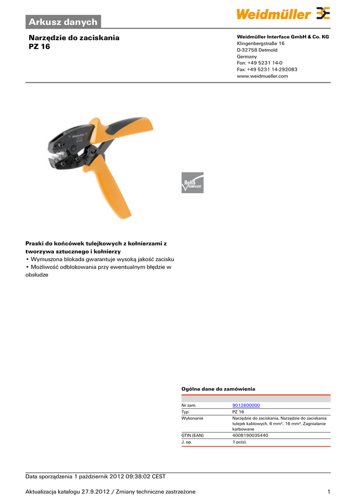 Arkusz danych Narzędzie do zaciskania PZ 16 Weidmüller Interface GmbH & Co. KG Klingenbergstraße 16 D-32758 Detmold Germany Fon: +49 5231 14-0 Fax: +49 5231 14-292083 www.weidmueller.com Praski do końcówek tulejkowych z kołnierzami z tworzywa sztucznego i kołnierzy • Wymuszona blokada gwarantuje wysoką jakość zacisku • Możliwość odblokowania przy ewentualnym błędzie w obsłudze Ogólne dane do zamówienia Nr zam. Typ Wykonanie GTIN (EAN) J. op. 9012600000 PZ 16 Narzędzie do zaciskania, Narzędzie do zaciskania tulejek kablowych, 6 mm², 16 mm², Zagniatanie karbowane 4008190035440 1 pc(s). Data sporządzenia 1 październik 2012 09:38:02 CEST Aktualizacja katalogu 27.9.2012 / Zmiany techniczne zastrzeżone 1 Arkusz danych Narzędzie do zaciskania PZ 16 Weidmüller Interface GmbH & Co. KG Klingenbergstraße 16 D-32758 Detmold Germany Fon: +49 5231 14-0 Fax: +49 5231 14-292083 www.weidmueller.com Dane techniczne Wymiary Długość Waga netto 200 mm 419,2 g Ciężar mechaniczny, bez wymienialnych wkładów 6 mm² 6 mm² 10 mm² rodzaj / profil zacisku Przekrój tulejek na żyłę, max. Profil zagniatany 3, min. tulejki kablowe z/bez kołnierza z tworzywa sztucznego 16 mm² obszar zacisku, min. EC000168 23-17-16-04 21-04-03-01 21-04-38-90 ETIM 3.0 eClass 4.1 eClass 6.0 418 g Dane techniczne Wykonanie Dane narzędzi do zagniatania Profil zagniatany 1, min. Przekrój tulejek na żyłę, min. Profil zagniatany 2, min. Zagniatanie karbowane 16 mm² 16 mm² Opis styku rodzaj styku obszar zacisku, maks. 6 mm² Klasyfikacje ETIM 2.0 UNSPSC eClass 5.1 eClass 7.0 EC000168 21-04-03-01 21-04-38-90 Wskazówki do produktów Tekst wskazówki dane do zamówienia Tekst wskazówki akcesoria Opis artykułu Opis produktu Akcesoria dodatkowe można znaleźć w Rozdziale J Informacje i dane zamówieniowe dotyczące tulejek na żyły, patrz rozdział J Akcesoria - tulejki na żyły Praska • Zacisk odpowiada normie europejskiej EN 60947-1 • dopuszczenie według VG 95211 (nazwa wojskowa VG 95 236 T 14 B 002) • trzy stacje zagniatające odpowiednio do przekrojów przewodów • Wprowadzanie końcówek tulejkowych z boku certyfikaty Dopuszczenia Data sporządzenia 1 październik 2012 09:38:02 CEST Aktualizacja katalogu 27.9.2012 / Zmiany techniczne zastrzeżone 2 Arkusz danych Narzędzie do zaciskania PZ 16 Rysunki Weidmüller Interface GmbH & Co. KG Klingenbergstraße 16 D-32758 Detmold Germany Fon: +49 5231 14-0 Fax: +49 5231 14-292083 www.weidmueller.com Data sporządzenia 1 październik 2012 09:38:02 CEST Aktualizacja katalogu 27.9.2012 / Zmiany techniczne zastrzeżone 3