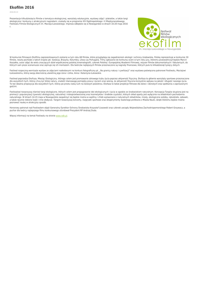 Ekofilm 2016 2016-05-13 Prezentacje kilkudziesięciu filmów o tematyce ekologicznej, warsztaty edukacyjnie, wystawy zdjęć i plakatów, a także targi ekologiczne i konkursy z atrakcyjnymi nagrodami, znalazły się w programie XIV Ogólnopolskiego i X Międzynarodowego Festiwalu Filmów Ekologicznych im. Macieja Łukowskiego. Impreza odbędzie się w Nowogardzie w dniach 16-20 maja 2016 r. W konkursie filmowym Ekofilmu zaprezentowanych zostanie w tym roku 68 filmów, które przyglądają się zagadnieniom ekologii i ochrony środowiska. Polskę reprezentuje w konkursie 30 filmów, reszta pochodzi z takich krajów jak: Szwecja, Brazylia, Kolumbia, Litwa czy Portugalia. Filmy zgłoszone do konkursu oceni w tym roku jury, któremu przewodniczył będzie Marcin Koszałka, autor zdjęć do wielu znaczących dzieł współczesnej polskiej kinematografii, członek Polskiej i Europejskiej Akademii Filmowej, reżyser filmów dokumentalnych i fabularnych, do których sam pisze scenariusze oraz zajmuje się ich montażem. Dla twórców najlepszych filmów przeznaczone są nagrody finansowe, których pula to kilkadziesiąt tysięcy złotych. Festiwal rozpoczną wernisaże wystaw ze zdjęciami nadesłanymi na konkurs fotograficzny pt. „Na granicy natury i cywilizacji” oraz wystawa poświęcona patronowi Festiwalu, Maciejowi Łukowskiemu, którą swoją obecnością uświetnią jego żona i córka, Anna i Katarzyna Łukowskie. Festiwal poprzedza EkoFaza, Miesiąc Ekologiczny, którego celem jest promowanie zdrowego trybu życia poprzez aktywność fizyczną. Ekofaza to głównie warsztaty sportowe przeznaczone dla wszystkich tych, którzy chcą żyć bliżej natury, znaleźć równowagę pomiędzy pracą i życiem oraz wierzą, że aktywność fizyczna korzystnie wpływa na jakość i długość naszego życia. To też idealna propozycja dla wszystkich tych, którzy po prostu lubią ruch na świeżym powietrzu. Ekofaza to także projekcje filmowe dla dzieci i dorosłych oraz spotkania z zaproszonymi gośćmi. Festiwalowi towarzyszą również targi ekologiczne, których celem jest propagowanie idei ekologicznych i życia w zgodzie ze środowiskiem naturalnym. Koncepcja Targów skupiona jest na promocji i popularyzacji żywności ekologicznej, naturalnej i niskoprzetworzonej oraz kosmetyków i środków czystości, których skład oparty jest wyłącznie na składnikach pochodzenia naturalnego. W dniach 14-15 maja w Nowogardzie zaopatrzyć się będzie można w wędliny i chleb wytwarzane z naturalnych składników, miody, ekologiczne ozdoby, rękodzieło, zabawki, a także ręcznie robione lizaki i inne słodycze. Targom towarzyszą koncerty, rozgrywki sportowe oraz eksperymenty Szalonego profesora z Miasta Nauki, dzięki któremu będzie można poznawać naukę w atrakcyjny sposób. Honorowy patronat nad Festiwalem objęli Generalny Dyrektor Ochrony Środowiska Krzysztof Lissowski oraz członek zarządu Województwa Zachodniopomorskiego Robert Grzywacz, a puchar dla twórcy najlepszego filmu konkursowego ufundował Prezydent RP Andrzej Duda. Więcej informacji na temat Festiwalu na stronie www.ndk.pl.
