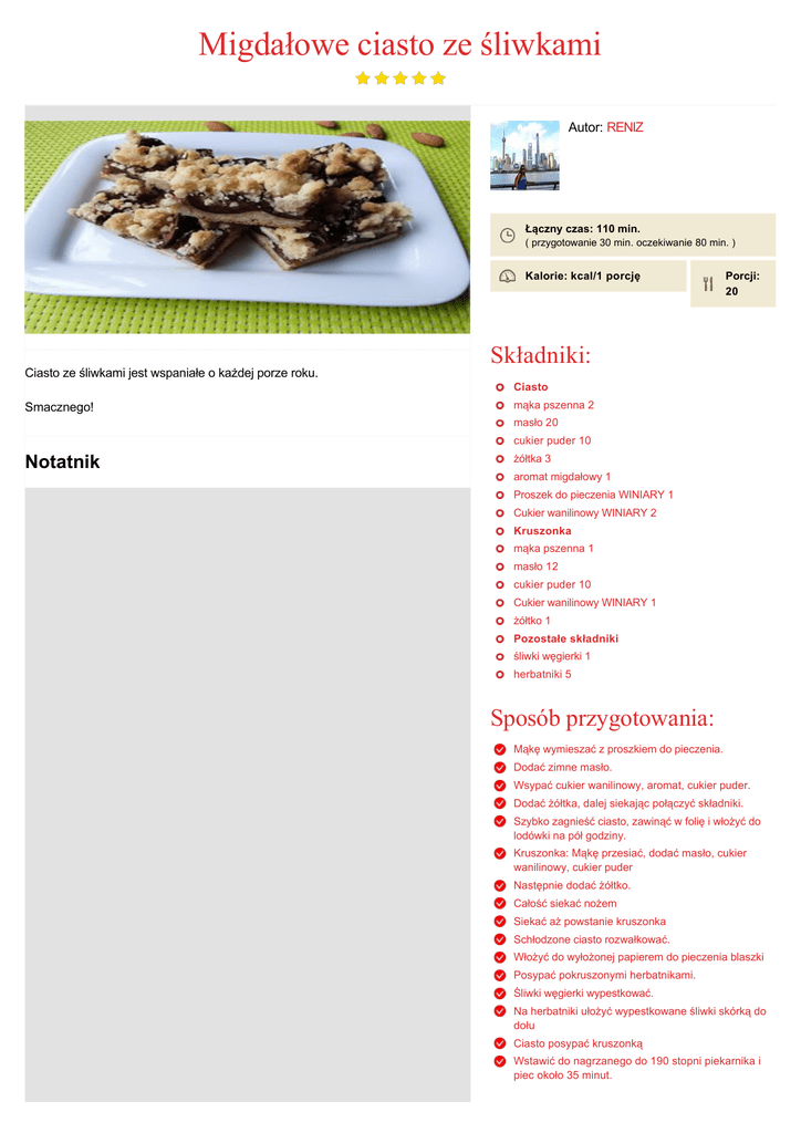 Migdałowe ciasto ze śliwkami Autor: RENIZ Łączny czas: 110 min. ( przygotowanie 30 min. oczekiwanie 80 min. ) Kalorie: kcal/1 porcję Ciasto ze śliwkami jest wspaniałe o każdej porze roku. Porcji: 20 Składniki: Ciasto Smacznego! mąka pszenna 2 masło 20 cukier puder 10 Notatnik żółtka 3 aromat migdałowy 1 Proszek do pieczenia WINIARY 1 Cukier wanilinowy WINIARY 2 Kruszonka mąka pszenna 1 masło 12 cukier puder 10 Cukier wanilinowy WINIARY 1 żółtko 1 Pozostałe składniki śliwki węgierki 1 herbatniki 5 Sposób przygotowania: Mąkę wymieszać z proszkiem do pieczenia. Dodać zimne masło. Wsypać cukier wanilinowy, aromat, cukier puder. Dodać żółtka, dalej siekając połączyć składniki. Szybko zagnieść ciasto, zawinąć w folię i włożyć do lodówki na pół godziny. Kruszonka: Mąkę przesiać, dodać masło, cukier wanilinowy, cukier puder Następnie dodać żółtko. Całość siekać nożem Siekać aż powstanie kruszonka Schłodzone ciasto rozwałkować. Włożyć do wyłożonej papierem do pieczenia blaszki Posypać pokruszonymi herbatnikami. Śliwki węgierki wypestkować. Na herbatniki ułożyć wypestkowane śliwki skórką do dołu Ciasto posypać kruszonką Wstawić do nagrzanego do 190 stopni piekarnika i piec około 35 minut.