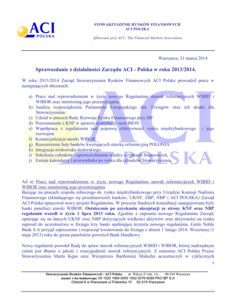 STOWARZYSZENIE RYNKÓW FINANSOWYCH ACI POLSKA Afiliowane przy ACI - The Financial Markets Association Warszawa, 31 marca 2014 Sprawozdanie z działalności Zarządu ACI - Polska w roku 2013/2014. W roku 2013/2014 Zarząd Stowarzyszenia Rynków Finansowych ACI Polska prowadził prace w następujących obszarach: a) Prace nad wprowadzeniem w życie nowego Regulaminu stawek referencyjnych WIBID i WIBOR oraz monitoring jego przestrzegania b) Analiza rozporządzenia Parlamentu Europejskiego dot. Fixingów oraz ich skutki dla Stowarzyszenia. c) Udział w pracach Rady Rozwoju Rynku Finansowego przy MF. d) Porozumienie z KNF w sprawie dystrybucji ocen BION e) Współpraca z regulatorem nad poprawą efektywności rynku międzybankowego i jego rozwojem f) Komercjalizacja stawki WIBOR g) Rozszerzenie listy banków kwotujących stawkę referencyjną POLONIA h) Integracja środowiska dealerskiego, i) Szkolenia członków i upowszechnianie wiedzy o rynkach finansowych, j) Emisja kalendarzy i przewodnika po rynku dla członków Stowarzyszenia. Ad a) Prace nad wprowadzeniem w życie nowego Regulaminu stawek referencyjnych WIBID i WIBOR oraz monitoring jego przestrzegania Bazując na pracach zespołu roboczego ds. rynku międzybankowego przy Urzędzie Komisji Nadzoru Finansowego (składającego się przedstawicieli banków, UKNF, ZBP, NBP i ACI POLSKA) Zarząd ACI Polska opracował nowy projekt Regulaminu. W procesie finalnych konsultacji zaangażowane były banki paneliści stawki WIBOR. Ostatecznie po uzyskaniu akceptacji ze strony KNF oraz NBP regulamin wszedł w życie 1 lipca 2013 roku. Zgodnie z zapisami nowego Regulaminu Zarząd, opierając się na danych UKNF oraz NBP dotyczących wielkości aktywów oraz aktywności na rynku zaprosił do uczestnictwa w fixingu trzy banki spełniające kryteria nowego regulaminu. Getin Noble Bank S.A przyjął zaproszenie i rozpoczął kwotowanie do fixingu z dniem 1 lutego 2014. Wcześniej (1 maja 2013) roku do grona panelistów powrócił Bank Handlowy. Nowy regulamin powołał Radę do spraw stawek referencyjnych WIBID i WIBOR, której nadrzędnym celem jest dbanie o jakość i wiarygodność stawek referencyjnych. Z ramienia ACI Polska Prezes Stowarzyszenia Marta Kępa oraz Wiceprezes Bartłomiej Małocha uczestniczyli w cyklicznych 1 Stowarzyszenie Rynków Finansowych - ACI Polska ul. Wilcza 31 lok. 1A; 00-544 Warszawa numer r-ku bankowego: 05 1020 1068 0000 1002 0076 6089 PKO BP S.A Oddział 6 w Warszawie ul Puławska 15 02-515 Warszawa obradach Rady Wibor. fixingu ACI Polska Na spotkaniach omawiane były m.in. comiesięczne raporty organizatora Ad b) Analiza rozporządzenia PE dot. Fixingów oraz ich skutki dla Stowarzyszenia Zarząd ACI zdecydował o podjęciu prac nad dostosowaniem procesów zarządzania wskaźnikami finansowymi WIBID/WIBOR do standardów wyznaczanych obecnie przez Parlament Europejski projektem Rozporządzenia ws. Indeksów stosowanych jako wskaźniki w instrumentach finansowych i umowach finansowych. Nowe przepisy m.in. zmieniają i dookreślają zakres obowiązków administratora, banków kwotujących oraz agenta kalkulacyjnego. W związku z tym Zarząd planuje powołanie grupy roboczej składającej się z regulatorów, banków kwotujących oraz instytucji nadzorujących proces fixingu poprzez Radę WIBOR. Spotkanie zaplanowane jest na maj 2014r. Ad c) Udział w pracach Rady Rozwoju Rynku Finansowego przy MF. ACI Polska brało udział konsultacjach Ministerstwa Finansów na temat ustaw dotyczących szeroko pojętego rynku, w tym min ustawy o obligacjach, listach zastawnych i bankach hipotecznych, czy ustawy o jednolitej licencji bankowej ale także rozporządzeń PE (np. dot benchmarków). Stowarzyszenie zaangażowane jest również w prace mające na celu dalszy rozwój rynku REPO. Wystosowano miedzy innymi pismo do prezesa ZBP informujące o konieczności podjęcia prac nad nowa umową ramową dotyczącą transakcji repo. ACI Polska było również uczestnikiem spotkania roboczego mającego na celu identyfikację barier repo, oraz wyznaczenie zakresu zmian jakie powinny być wprowadzone zarówno w dokumentacji jak i przepisach. W spotkaniu uczestniczyli przedstawiciele m. in ACI Polska BondSpot, KDPW_CCP, ZBP Członkowie Zarządu uczestniczą także w cyklicznych spotkaniach Rady Rozwoju Rynku Finansowego. Podczas dotychczasowych posiedzeń RRRF dyskutowana była strategia rozwoju rynku kapitałowego oraz zakres i postępy prac w poszczególnych zespołach roboczych powołanych przy RRRF. Prace nad ustawą o jednolitej licencji bankowej prowadzone są w ramach Zespołu ds. długoterminowych instrumentów dłużnych – jednolita licencja bankowa. W ramach zespołu ACI Polska prezentuje stanowisko, że zmiany dot. jednolitej licencji bankowej powinny umożliwić bankom zawieranie transakcji oraz bezpośrednie inwestowanie na regulowanym rynku bez pośrednictwa domów maklerskich. ACI Polska konsultowało projekt rozporządzenia Parlamentu Europejskiego dotyczący benchmarków zarówno z Ministerstwem Finansów jak również zgłosiło uwagi do rozporządzenia bezpośrednio do Parlamentu Europejskiego. Rozporządzenie jest jednym z najważniejszych dokumentów wprowadzających zmiany ‘ „w świecie fixingów i benchmarków”., nakładającym na administratorów fixingów szereg nowych i istotnych wymogów, z którymi ACI Polska będzie musiało się zmierzyć. Ad d) Porozumienie z KNF w sprawie dystrybucji ocen BION Zarząd ACI w porozumieniu z KNF opracował model przekazywania ocen BION. Inicjatywa związana jest z zapisami nowego regulaminu stawek referencyjncych WIBID i WIBOR. W myśl porozumienia 2 Stowarzyszenie Rynków Finansowych - ACI Polska ul. Wilcza 31 lok. 1A; 00-544 Warszawa numer r-ku bankowego: 05 1020 1068 0000 1002 0076 6089 PKO BP S.A Oddział 6 w Warszawie ul Puławska 15 02-515 Warszawa Stowarzyszenie pośredniczy w przekazywaniu ocen BION (bez prawa wglądu) do banków panelistów. Udostępnianie ocen BION p