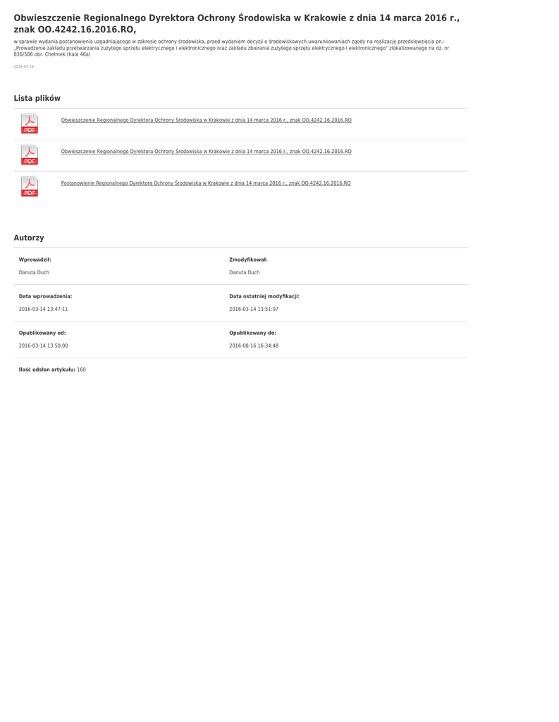 Obwieszczenie Regionalnego Dyrektora Ochrony Środowiska w Krakowie z dnia 14 marca 2016 r., znak OO.4242.16.2016.RO, w sprawie wydania postanowienia uzgadniającego w zakresie ochrony środowiska, przed wydaniem decyzji o środowiskowych uwarunkowaniach zgody na realizację przedsięwzięcia pn.: „Prowadzenie zakładu przetwarzania zużytego sprzętu elektrycznego i elektronicznego oraz zakładu zbierania zużytego sprzętu elektrycznego i elektronicznego" zlokalizowanego na dz. nr 836/506 obr. Chełmek (hala 46a) 2016-03-14 Lista plików Obwieszczenie Regionalnego Dyrektora Ochrony Środowiska w Krakowie z dnia 14 marca 2016 r., znak OO.4242.16.2016.RO Obwieszczenie Regionalnego Dyrektora Ochrony Środowiska w Krakowie z dnia 14 marca 2016 r., znak OO.4242.16.2016.RO Postanowienie Regionalnego Dyrektora Ochrony Środowiska w Krakowie z dnia 14 marca 2016 r., znak OO.4242.16.2016.RO Autorzy Wprowadził: Zmodyfikował: Danuta Duch Danuta Duch Data wprowadzenia: Data ostatniej modyfikacji: 2016-03-14 13:47:11 2016-03-14 13:51:07 Opublikowany od: Opublikowany do: 2016-03-14 13:50:00 2016-08-16 16:34:48 Ilość odsłon artykułu: 160