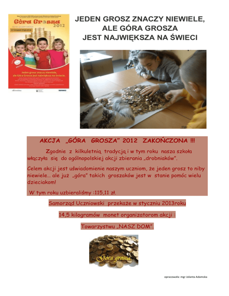 JEDEN GROSZ ZNACZY NIEWIELE, ALE GÓRA GROSZA JEST NAJWIĘKSZA NA ŚWIECI AKCJA „GÓRA GROSZA” 2012 ZAKOŃCZONA !!! Zgodnie z kilkuletnią tradycją i w tym roku nasza szkoła włączyła się do ogólnopolskiej akcji zbierania „drobniaków”. Celem akcji jest uświadomienie naszym uczniom, Ŝe jeden grosz to niby niewiele… ale juŜ „góra” takich groszaków jest w stanie pomóc wielu dzieciakom! W tym roku uzbieraliśmy :115,11 zł. Samorząd Uczniowski przekaŜe w styczniu 2013roku 14,5 kilogramów monet organizatorom akcji : Towarzystwu „NASZ DOM”. opracowała: mgr Jolanta Adamska