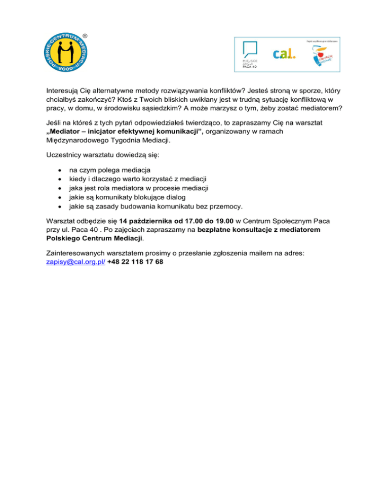 Interesują Cię alternatywne metody rozwiązywania konfliktów? Jesteś stroną w sporze, który chciałbyś zakończyć? Ktoś z Twoich bliskich uwikłany jest w trudną sytuację konfliktową w pracy, w domu, w środowisku sąsiedzkim? A może marzysz o tym, żeby zostać mediatorem? Jeśli na któreś z tych pytań odpowiedziałeś twierdząco, to zapraszamy Cię na warsztat „Mediator – inicjator efektywnej komunikacji”, organizowany w ramach Międzynarodowego Tygodnia Mediacji. Uczestnicy warsztatu dowiedzą się: na czym polega mediacja kiedy i dlaczego warto korzystać z mediacji jaka jest rola mediatora w procesie mediacji jakie są komunikaty blokujące dialog jakie są zasady budowania komunikatu bez przemocy. Warsztat odbędzie się 14 października od 17.00 do 19.00 w Centrum Społecznym Paca przy ul. Paca 40 . Po zajęciach zapraszamy na bezpłatne konsultacje z mediatorem Polskiego Centrum Mediacji. Zainteresowanych warsztatem prosimy o przesłanie zgłoszenia mailem na adres: [email protected]/ +48 22 118 17 68
