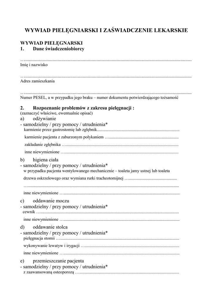 WYWIAD PIELĘGNIARSKI I ZAŚWIADCZENIE LEKARSKIE WYWIAD PIELĘGNARSKI 1. Dane świadczeniobiorcy …..................................................................................................................................... Imię i nazwisko …..................................................................................................................................... Adres zamieszkania …..................................................................................................................................... Numer PESEL, a w przypadku jego braku – numer dokumentu potwierdzającego tożsamość 2. Rozpoznanie problemów z zakresu pielęgnacji : (zaznaczyć właściwe, ewentualnie opisać) a) odżywianie - samodzielny / przy pomocy / utrudnienia* karmienie przez gastrostomię lub zgłębnik............................................................................. karmienie pacjenta z zaburzonym połykaniem …................................................................. zakładanie zgłębnika …......................................................................................................... inne niewymienione ….......................................................................................................... b) higiena ciała - samodzielny / przy pomocy / utrudnienia* w przypadku pacjenta wentylowanego mechanicznie – toaleta jamy ustnej lub toaleta drzewa oskrzelowego oraz wymiana rurki tracheotomijnej …............................................. …............................................................................................................................................. inne niewymienione …............................................................................................................ c) oddawanie moczu - samodzielny / przy pomocy / utrudnienia* cewnik …................................................................................................................................. inne niewymienione …............................................................................................................ d) oddawanie stolca - samodzielny / przy pomocy / utrudnienia* pielęgnacja stomii …............................................................................................................... wykonywanie lewatyw i irygacji …........................................................................................ inne niewymienione …............................................................................................................ e) przemieszczanie pacjenta - samodzielny / przy pomocy / utrudnienia* z zaawansowaną osteoporozą …............................................................................................. którego stan zdrowia wymaga szczególnej ostrożności …..................................................... inne niewymienione …............................................................................................................ f) rany przewlekłe odleżyny …................................................................................................................................ rany cukrzycowe ….................................................................................................................... inne niewymienione …............................................................................................................... g) oddychanie wspomagane …................................................................................................ h) świadomość pacjenta - tak / nie / z przerwami* .................................................................................................... i) inne …....................................................................................................................................... 3. Liczba punktów uzyskanych w skali Barthel …....................................................... …............................................................. Miejscowość, data …................................................................. Podpis i pieczęć pielęgniarki ZAŚWIADCZENIE LEKARSKIE Stwierdzam, że wyżej wymieniona osoba wymaga / nie wymaga * skierowania do zakładu opiekuńczo – leczniczego. …............................................................. Miejscowość, data * Niepotrzebne skreślić …................................................................. Podpis i pieczęć lekarza SKIEROWANIE DO ZAKŁADU OPIEKUŃCZO LECZNICZEGO Niniejszym kieruję: …..................................................................................................................................... Imię i nazwisko świadczeniobiorcy …..................................................................................................................................... Adres zamieszkania świadczeniobiorcy …..................................................................................................................................... Adres do korespondencji (jeżeli jest inny niż adres zamieszkania) …..................................................................................................................................... nr telefonu do kontaktu …..................................................................................................................................... Numer PESEL świadczeniobiorcy, a w przypadku jego braku-numer dokumentu potwierdzającego tożsamość świadczeniobiorcy …..................................................................................................................................... Rozpoznanie w języku polskim według ICD-10 (choroba zasadnicza i choroby współistniejące) …..................................................................................................................................... ........................................................